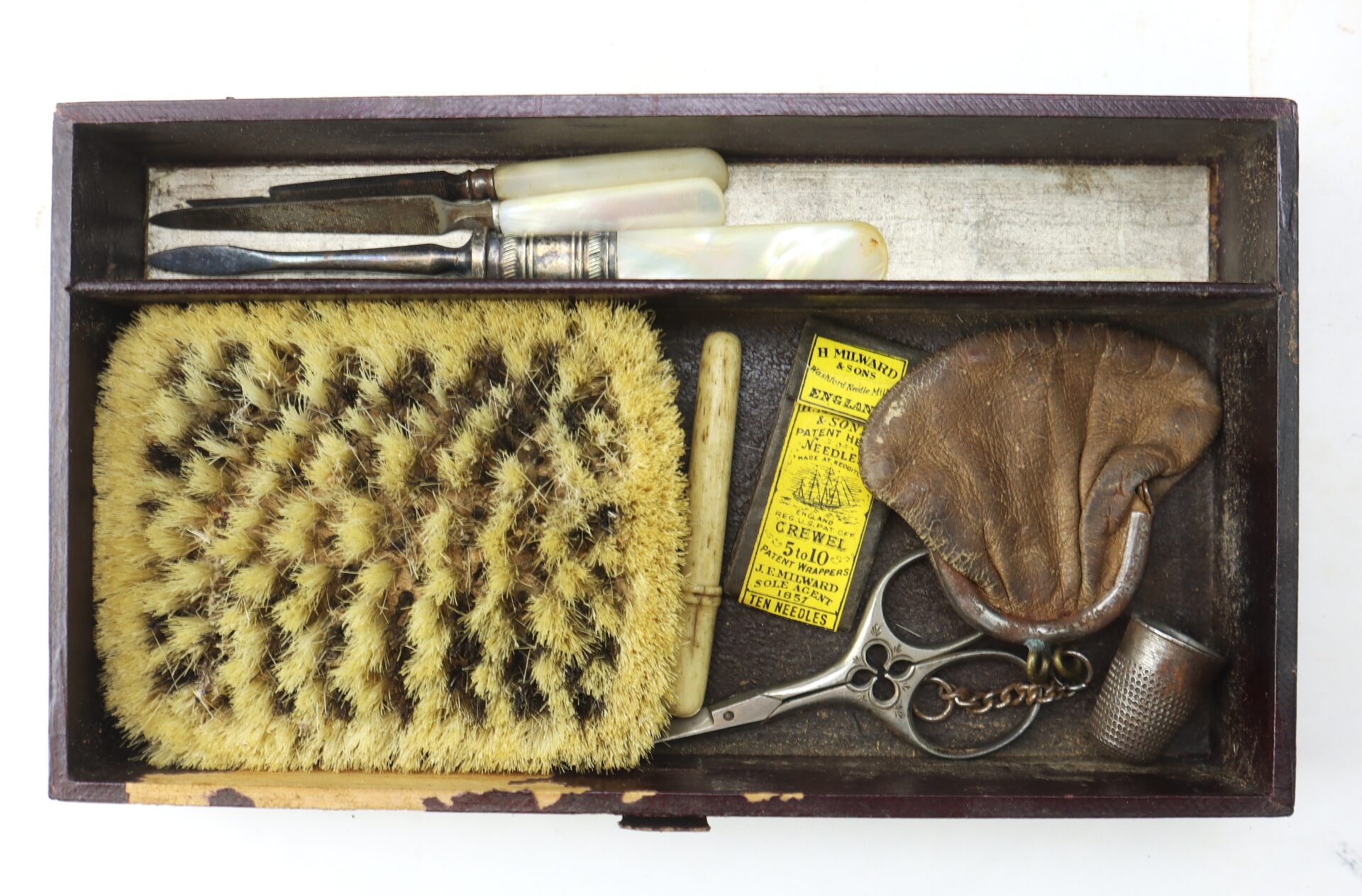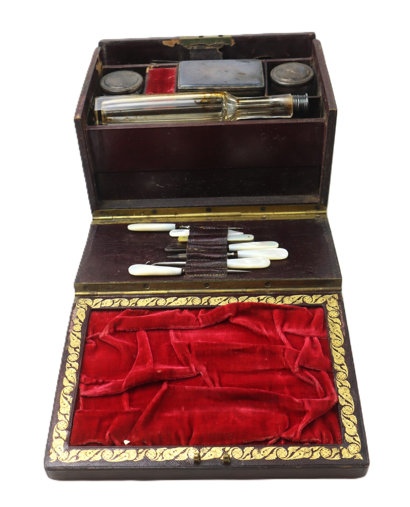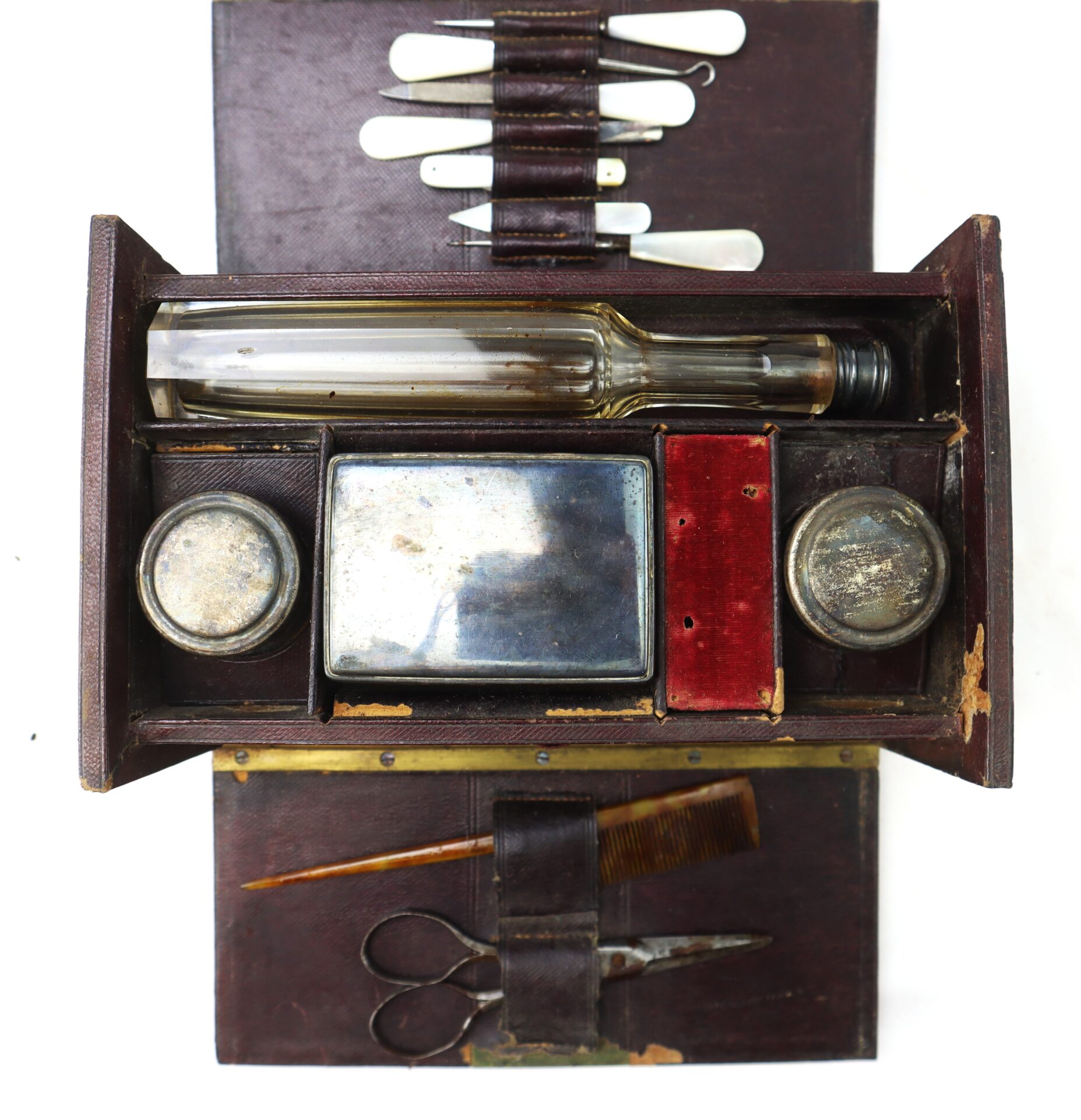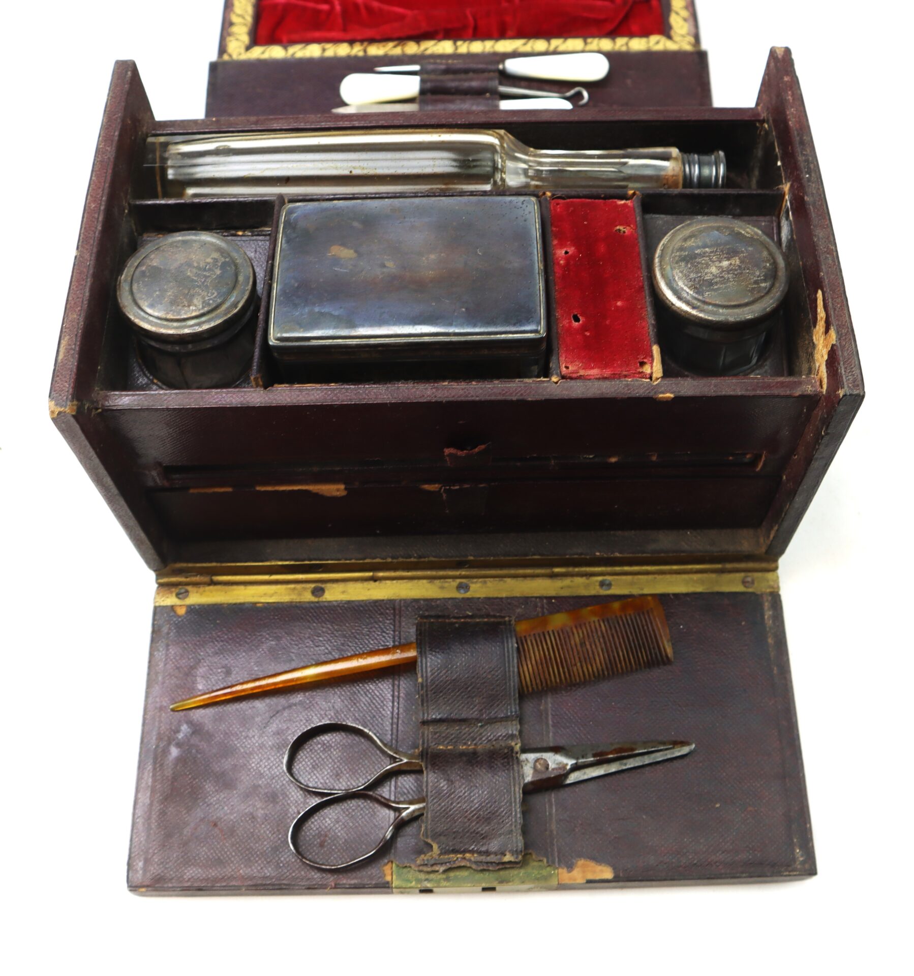 Inside are various compartments lined in velvet and Morocco leather, including: Mirror set into the lid with its original blue paper backing, Scissors and tortoise shell comb secured under leather straps, Glass and metal canisters for pomades, ointments, or powders, Blown glass bottle with ground stopper for cologne or spirits, Mother-of-pearl handled manicure tools including nail files, button hook, cuticle tool, and ear spoon, Brush with animal hair bristles, Small coin type pocketbook and sewing accessories including needles in their original yellow packet.
