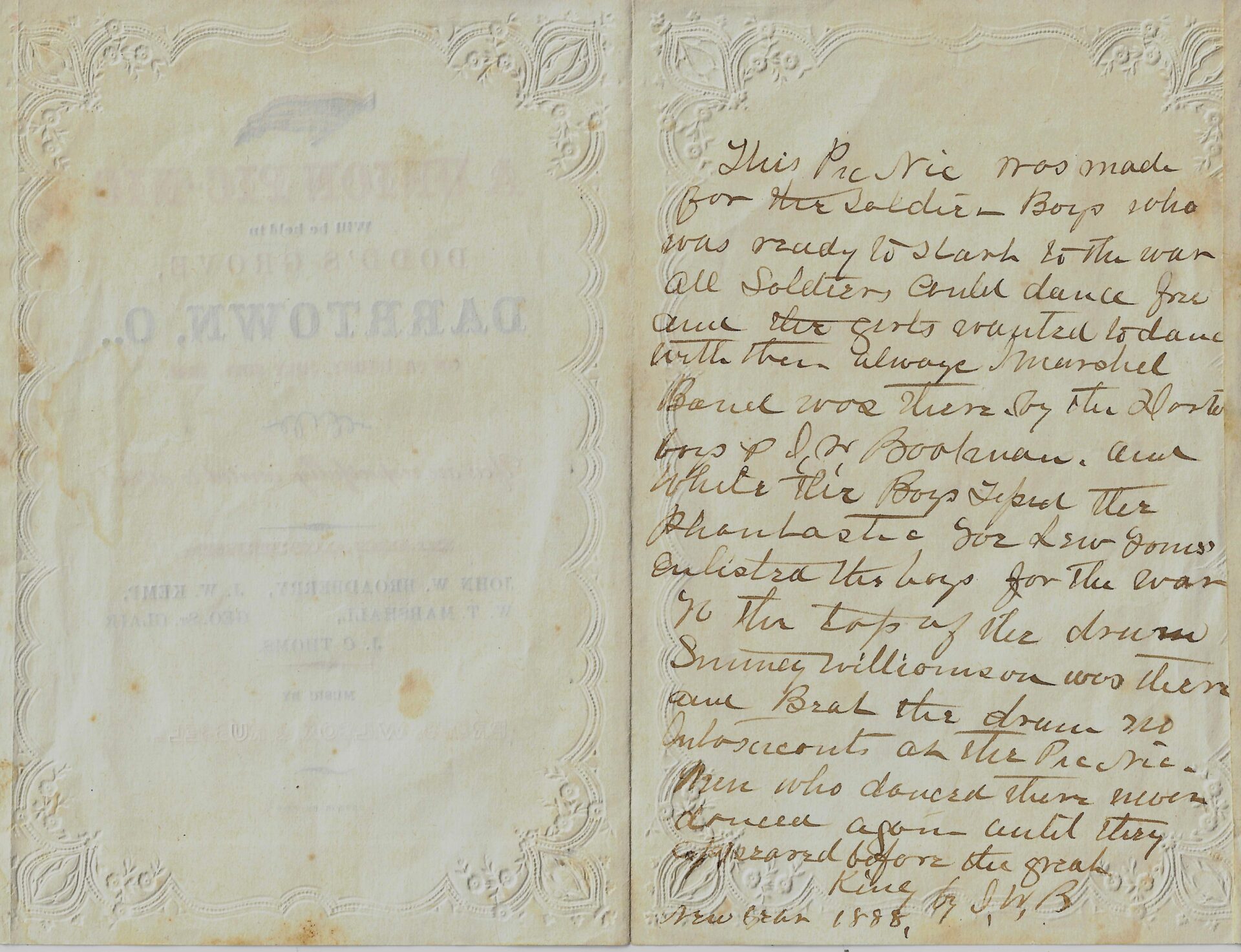 Includes a sentimental post-war (1888) inscribed ink note describing one attendee’s memory of the days festivities, “This Pic Nic was made for the Soldier Boys who was ready to start to the war. All Soldiers could dance free and the girls wanted to dance with them always. Minstrel Band was there by the Harte[?] boys & I.W. Bookman. And while the boys tripped the phantastic [fantastic) for few Thoms enlisted the boys for the war to the tap of the drum. Sunney Williamson was there and beat the drum no [illegible] at the Pic Nic. Men who danced there never danced again until they appeared before the great king. By I. W. B. New Year 1888”