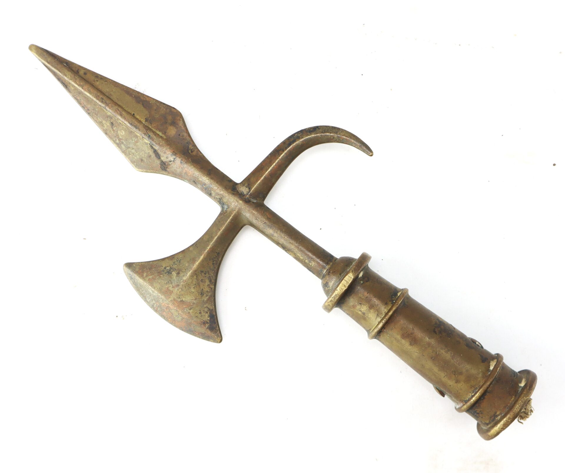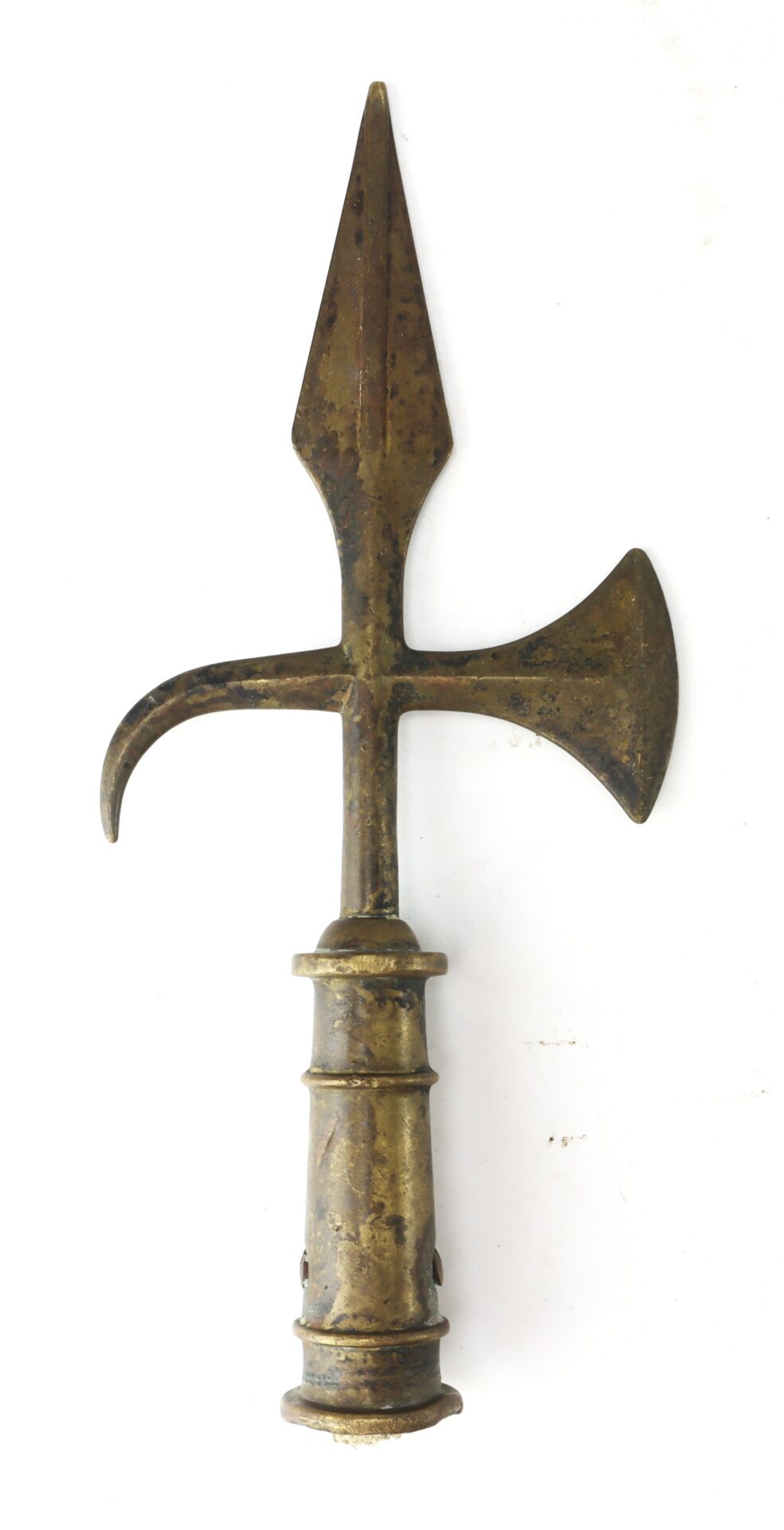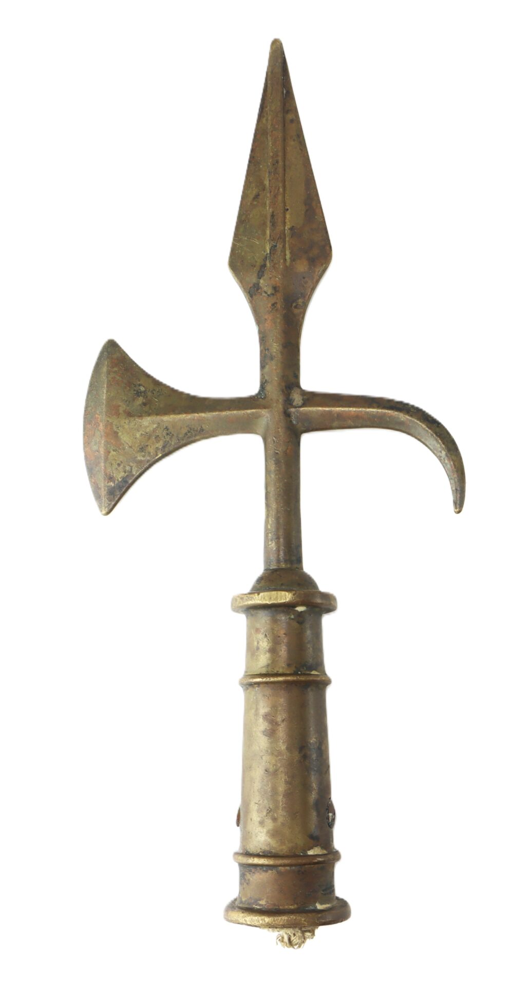 Constructed of cast brass with a pleasing, untouched patina, the piece shows honest age and wear consistent with period use. The form remains crisp, with the blade, axe, and rear hook all clearly defined. These finials were often lost, damaged, or separated from their staffs over time, making intact examples—especially those retaining original wood—significantly more difficult to obtain.
