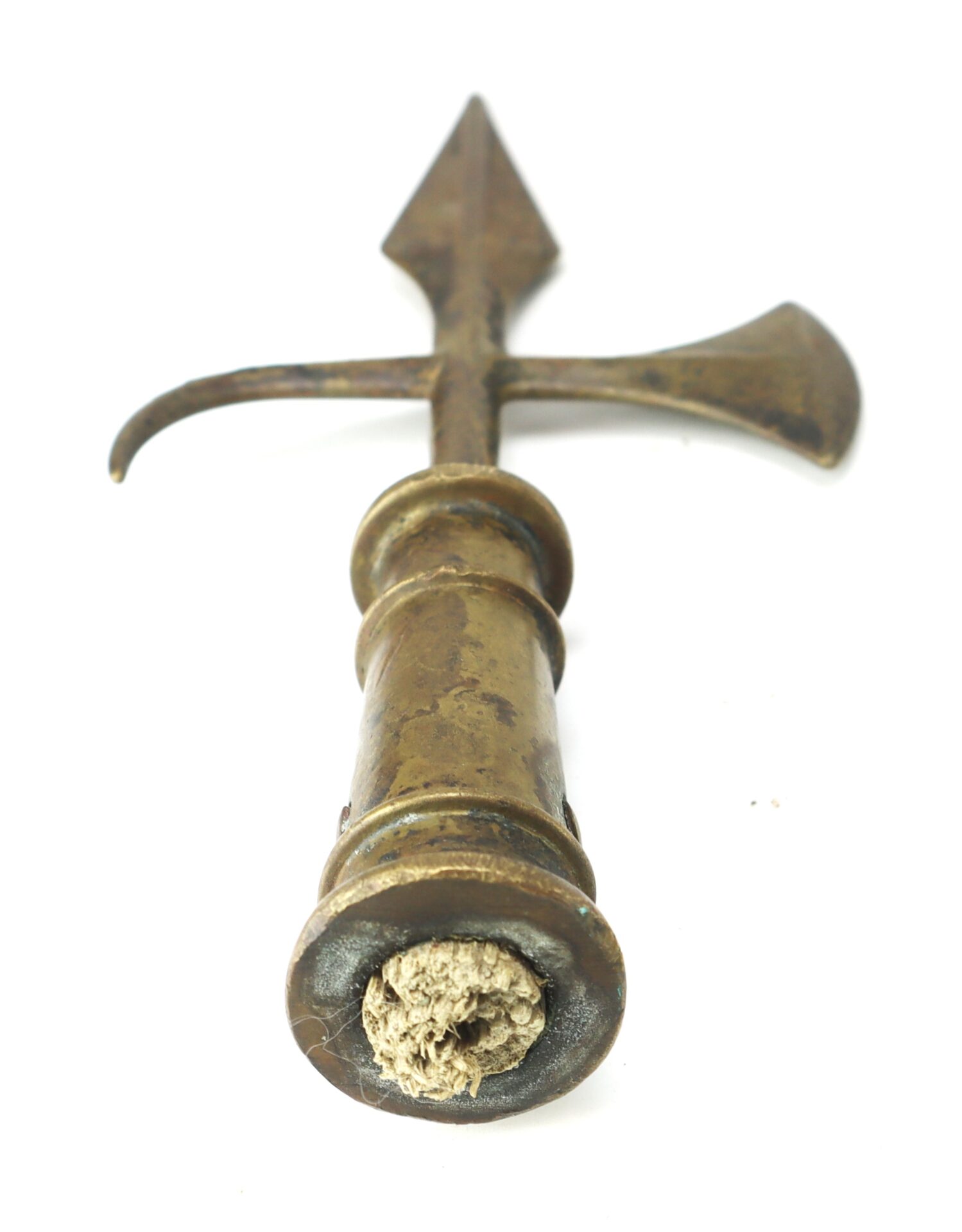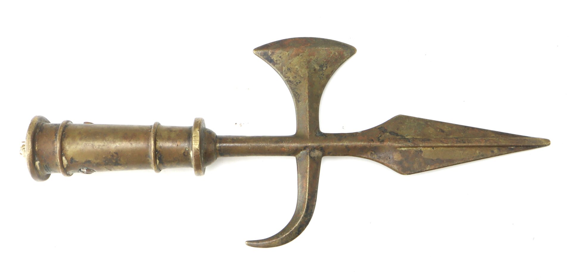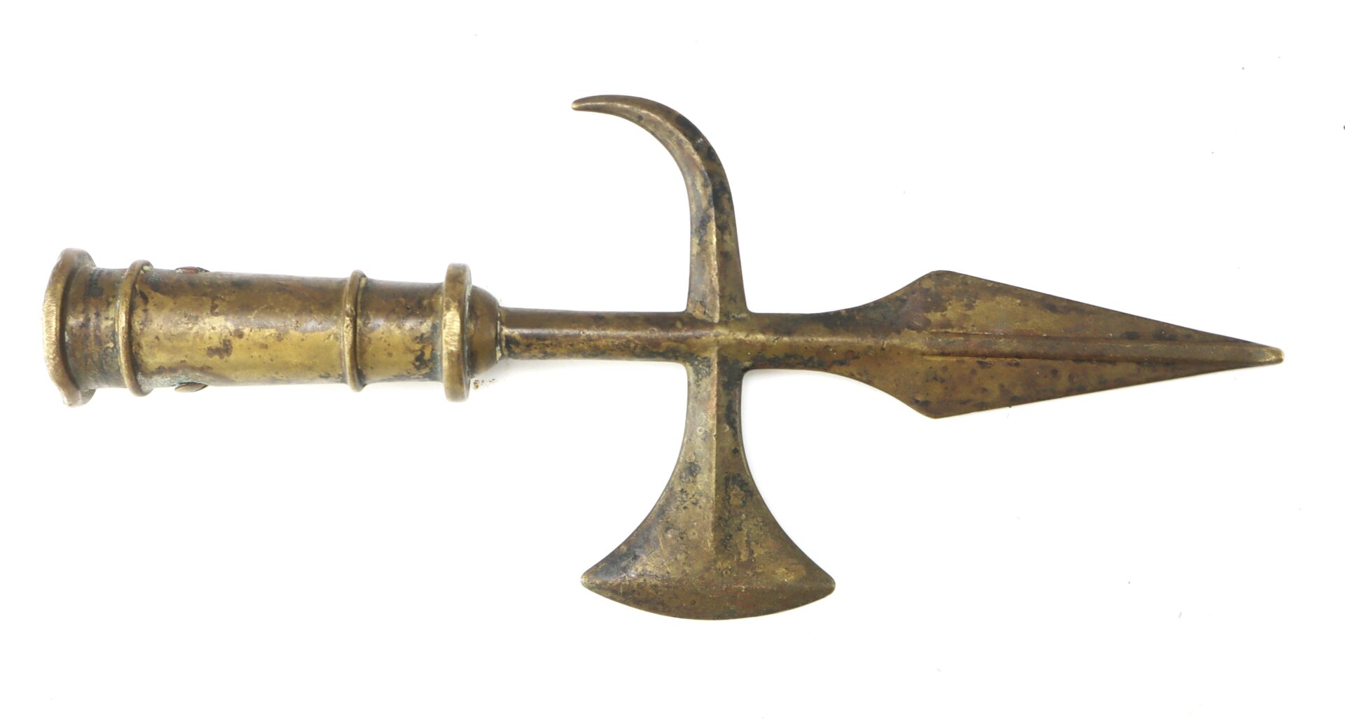 Constructed of cast brass with a pleasing, untouched patina, the piece shows honest age and wear consistent with period use. The form remains crisp, with the blade, axe, and rear hook all clearly defined. These finials were often lost, damaged, or separated from their staffs over time, making intact examples—especially those retaining original wood—significantly more difficult to obtain.