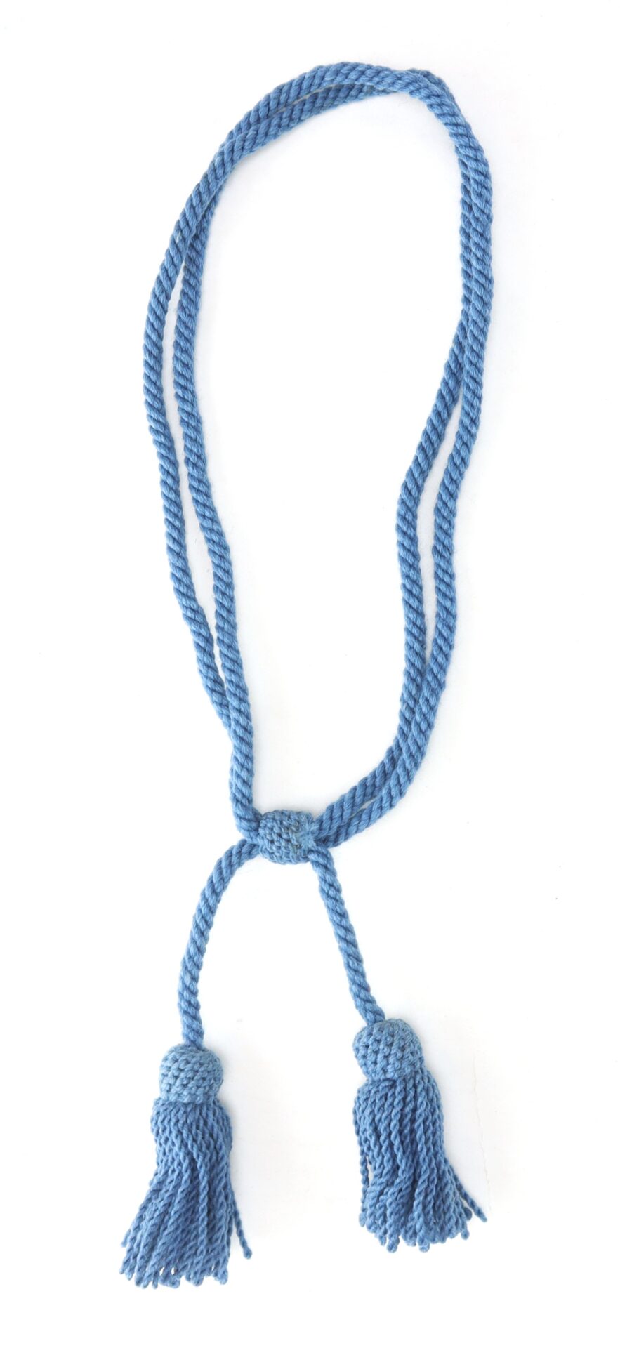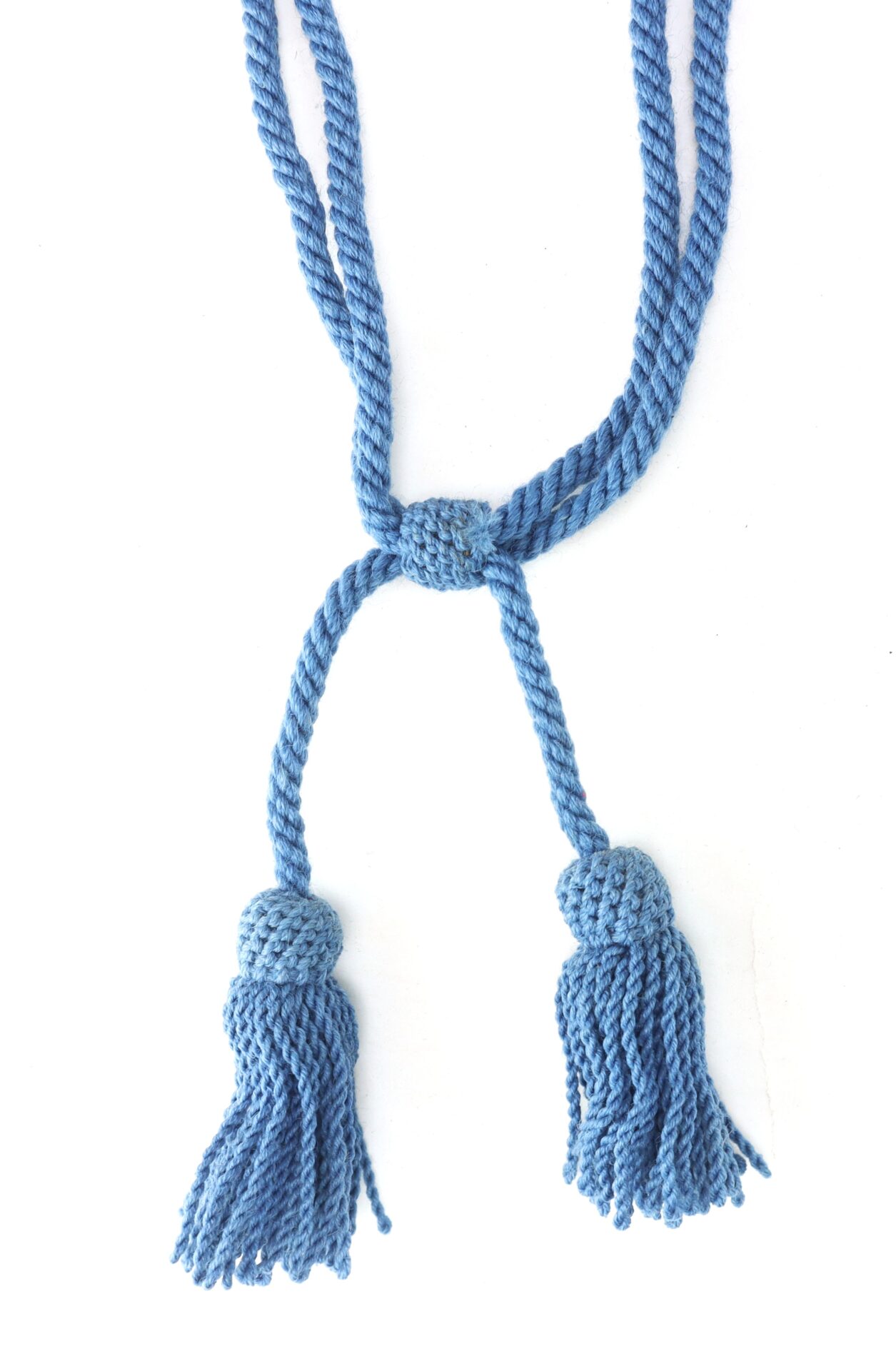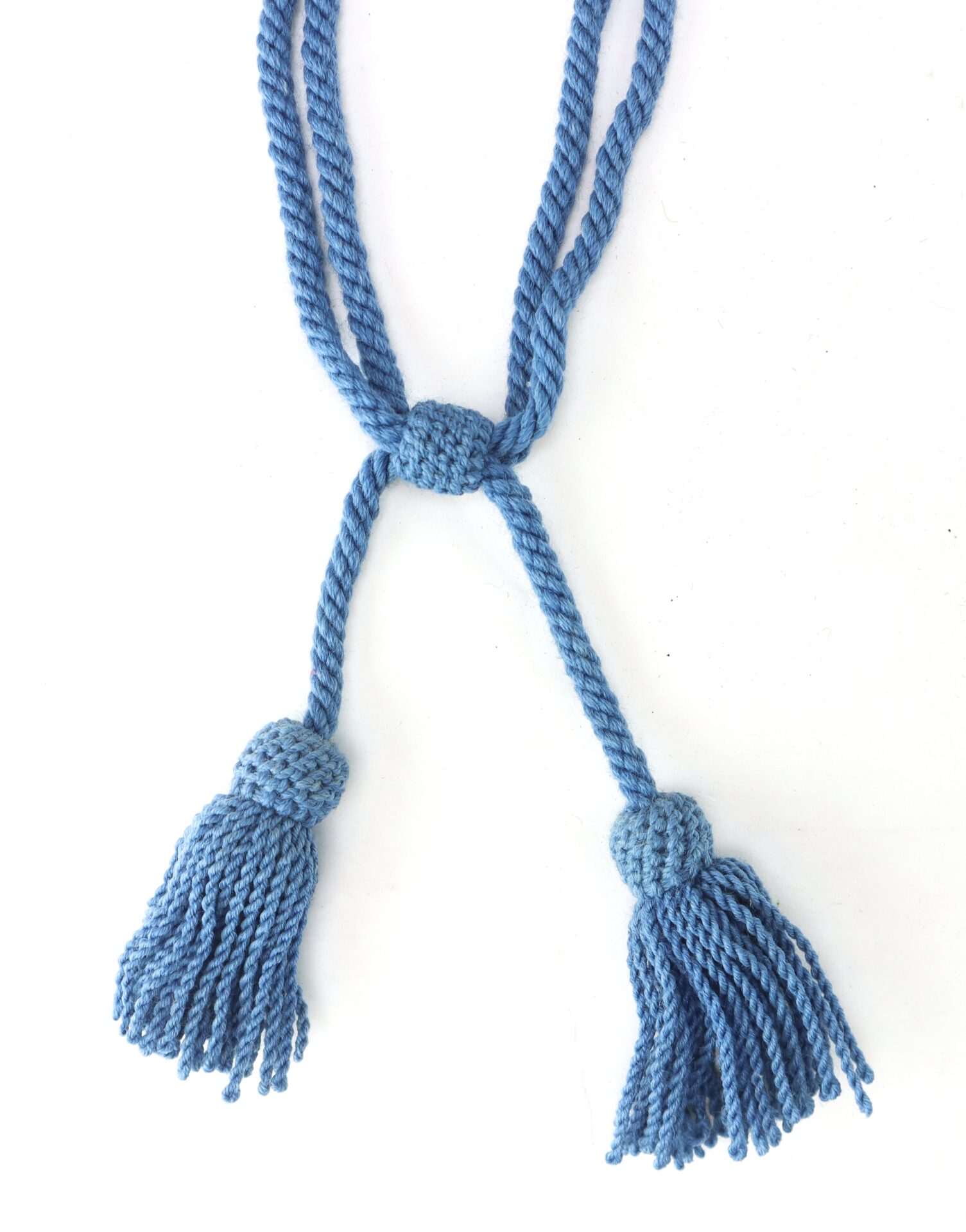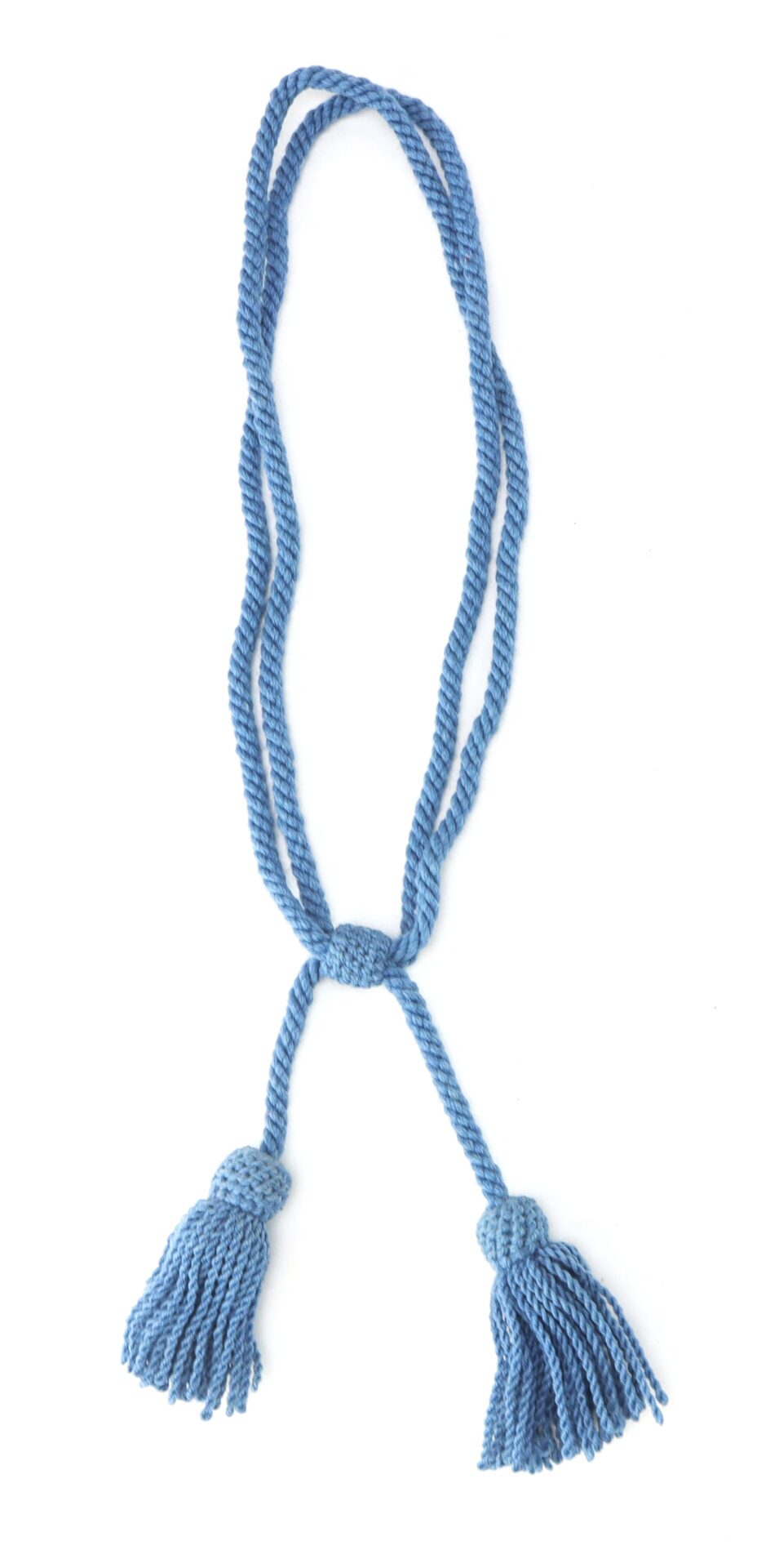 The cord retains a pleasing, even blue coloration throughout, with light age toning and minor fraying at the tassel ends consistent with honest use. The braid remains tight and well-defined, and the piece displays attractively with no significant breaks or losses observed.