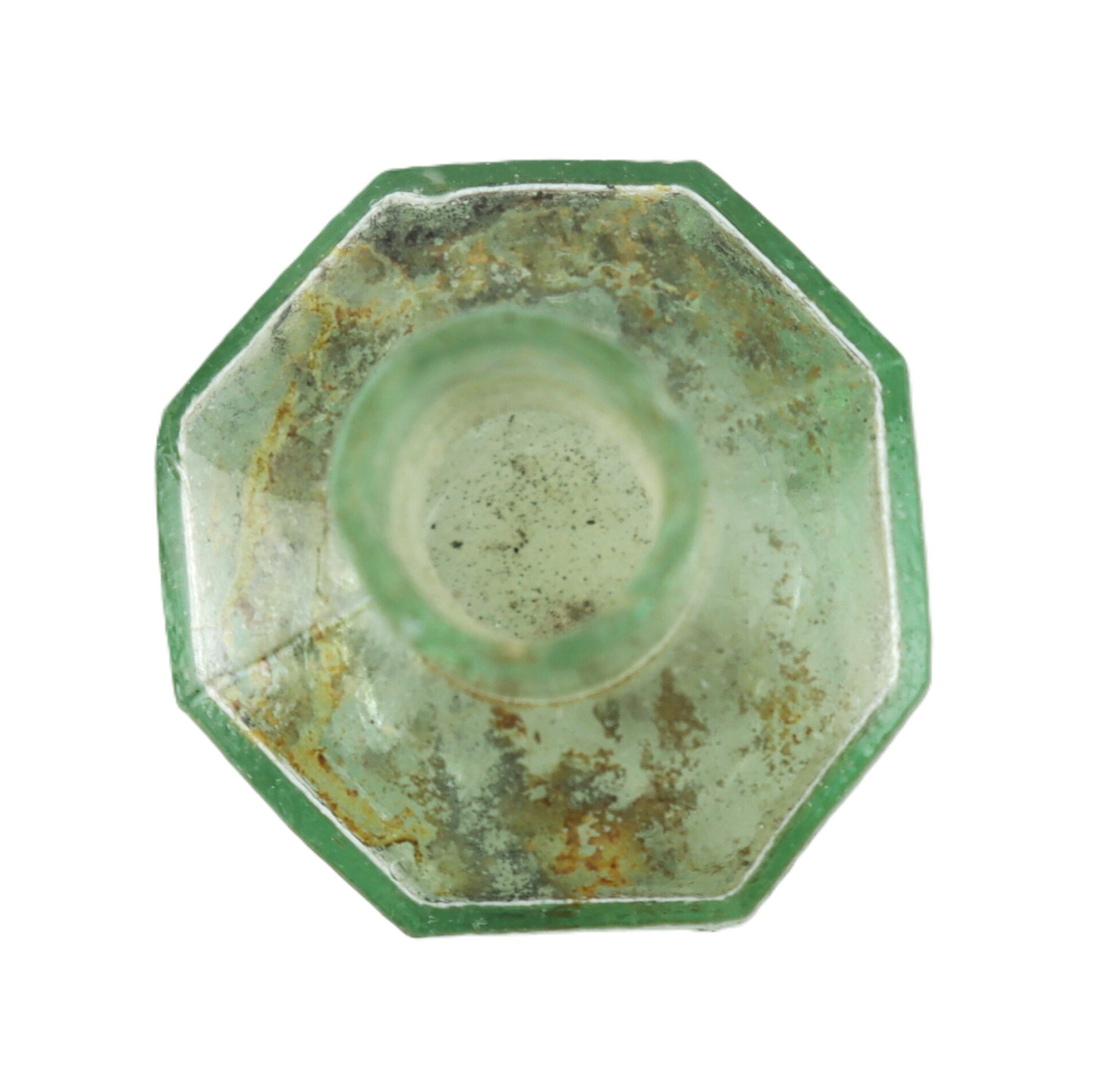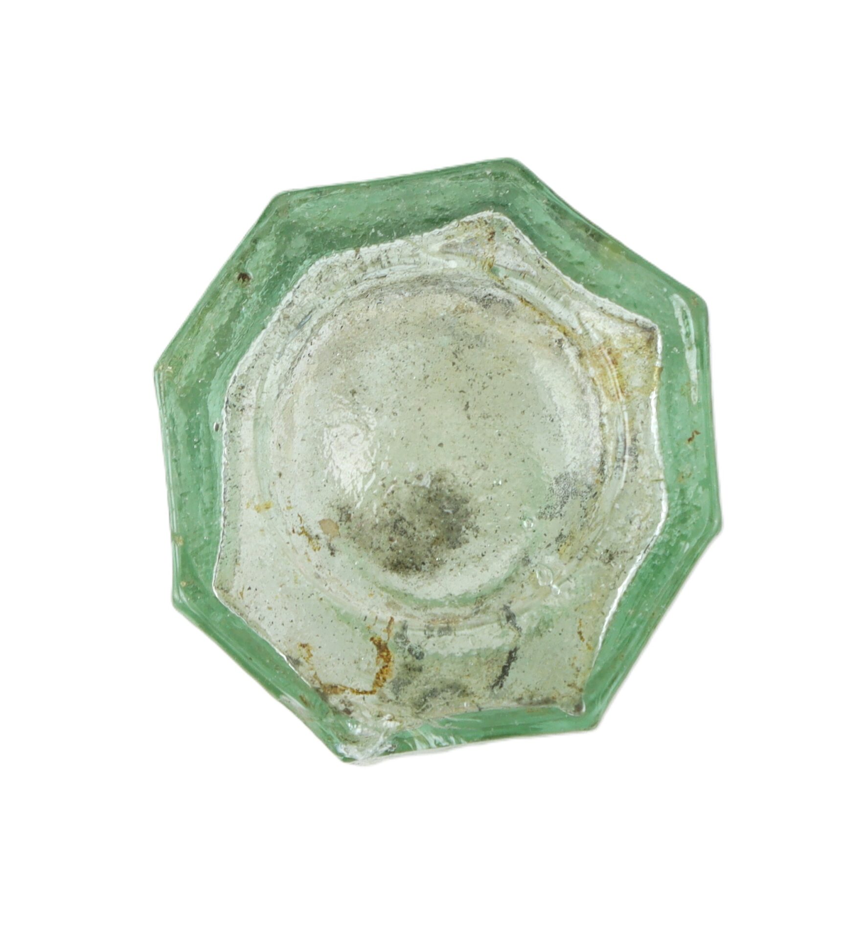 This Civil War eight-sided ink bottle is in good condition and has a very pleasing aqua color. Original Wartime example, typical of many found in Civil War camp sites. Excellent example with no chips or cracks and nice pontils on the base. Classic artifact of the American Civil War.