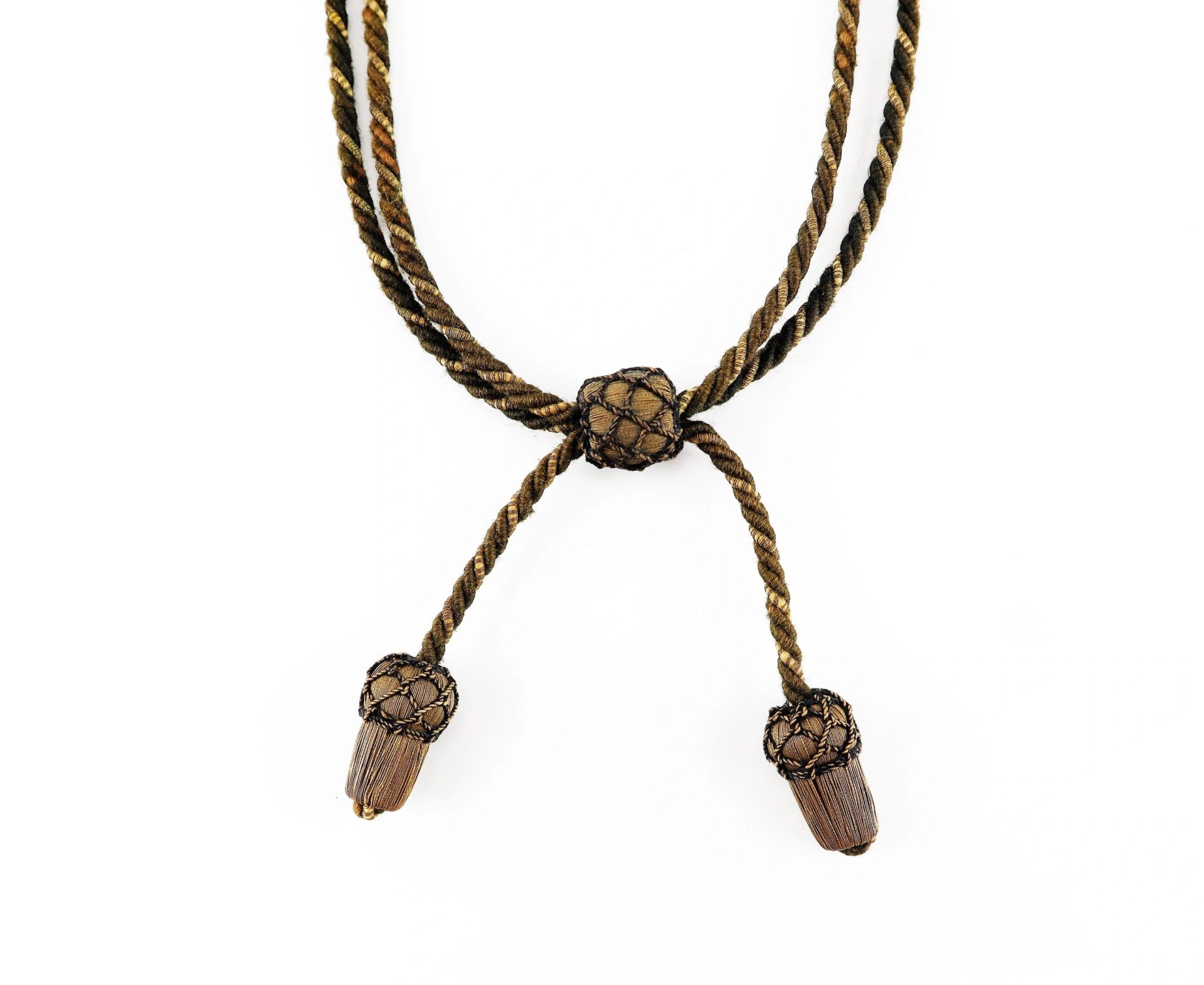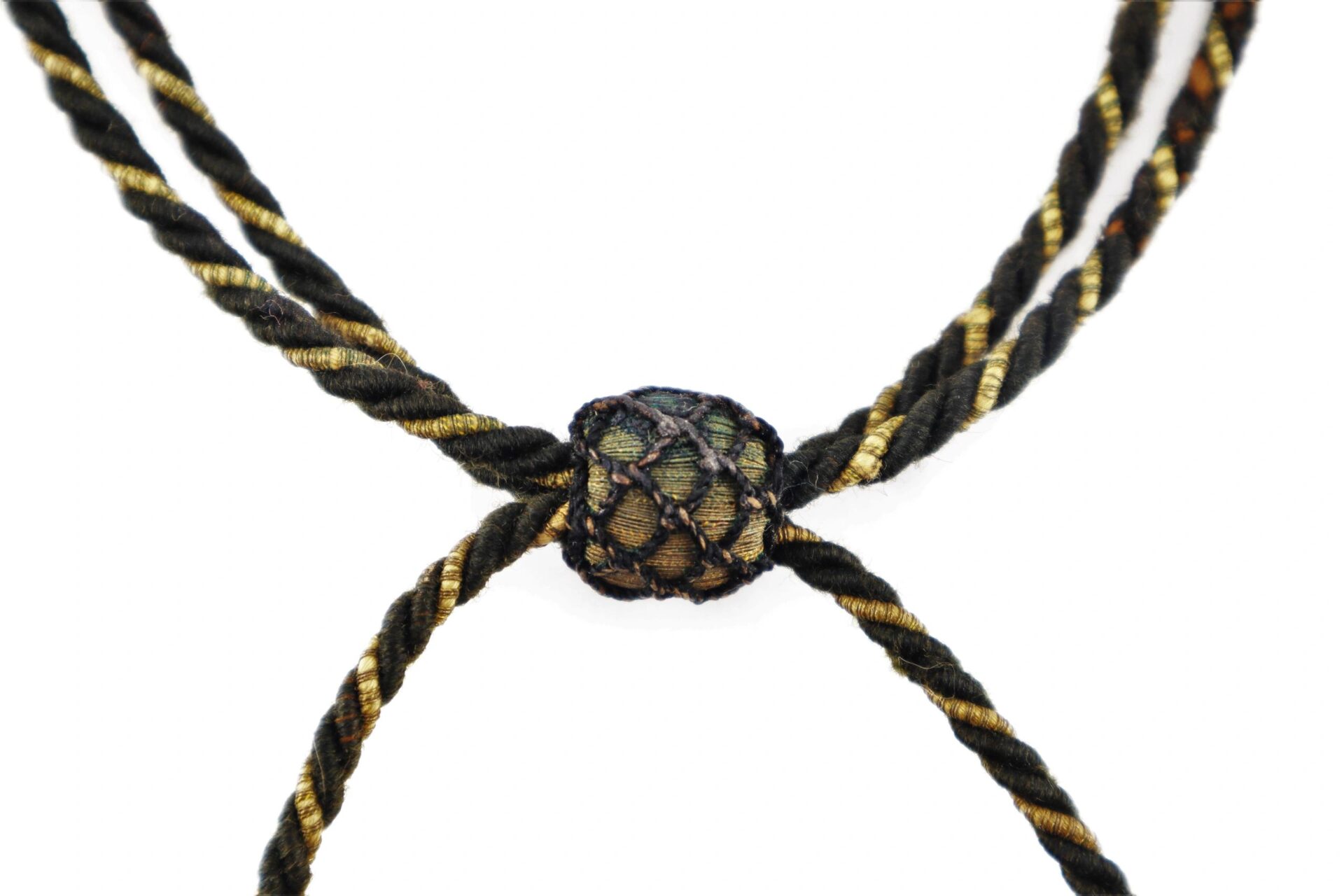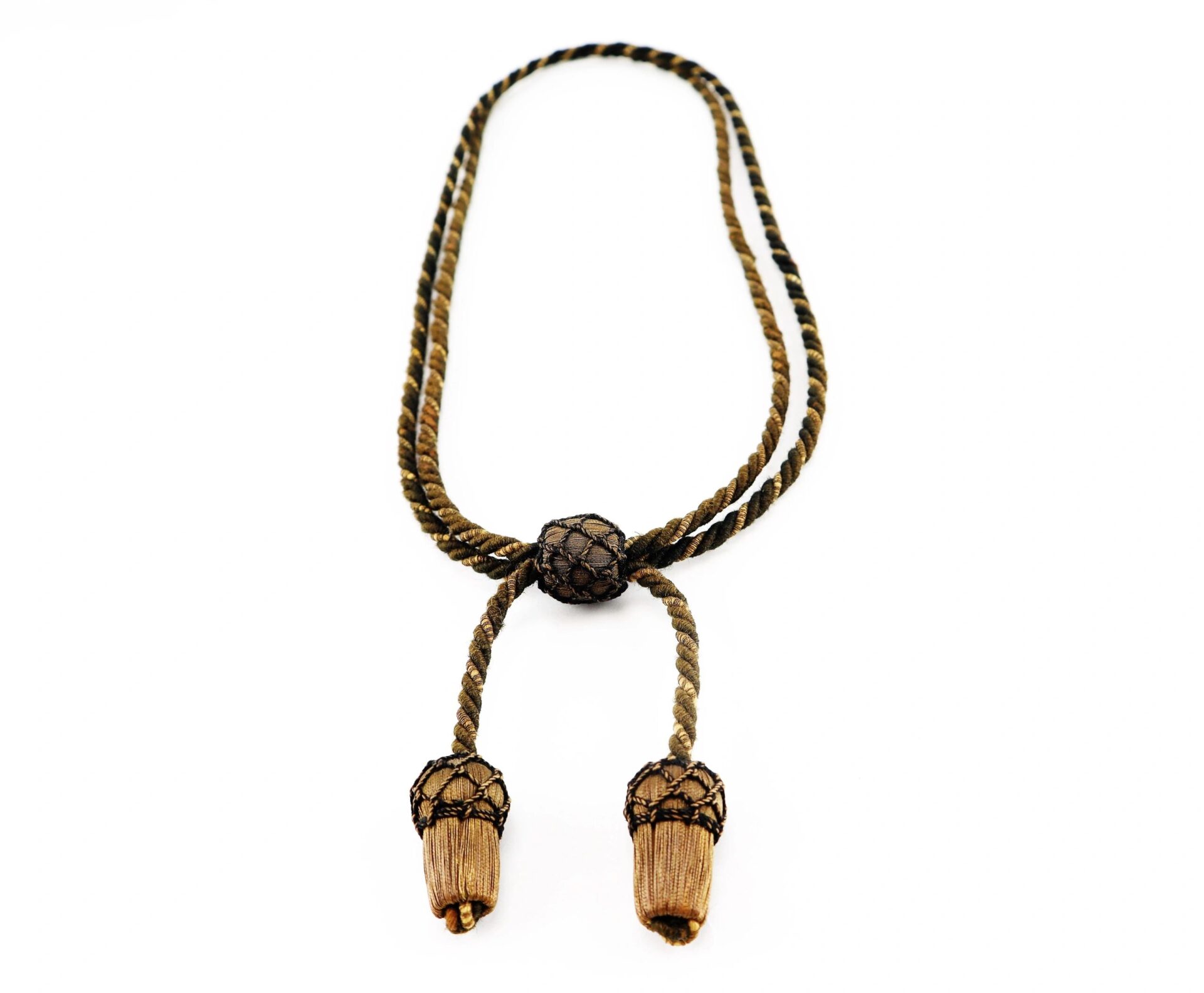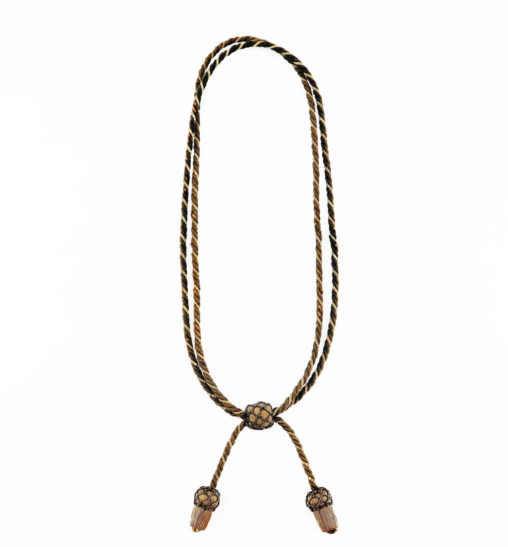 Civil War Officer’s Hat Cord – Inventory Number: UNI 065 / SOLD This Civil War officer uniform accoutrement is a pleasing combination of black and brown thread interwoven with bright gold and black thread that produced a handsome hat cord accessory. This officer’s hat cord, worn at the base of the crown on his slouch hat, is in very good original condition. The cord features two handsome netted acorn-shaped tassel ends intricately braided over gold bullion. Cord is complete with the black netted bullion knot adjuster to fit the base of the crown on the officer’s slouch hat. Entire hat cord is in very good condition with no pulls or rips. These uniform accessories are becoming difficult to find. A fine specimen of an officer’s original hat cord. Inventory Number: UNI 065 / SOLD