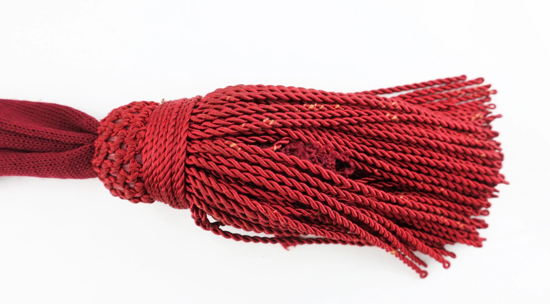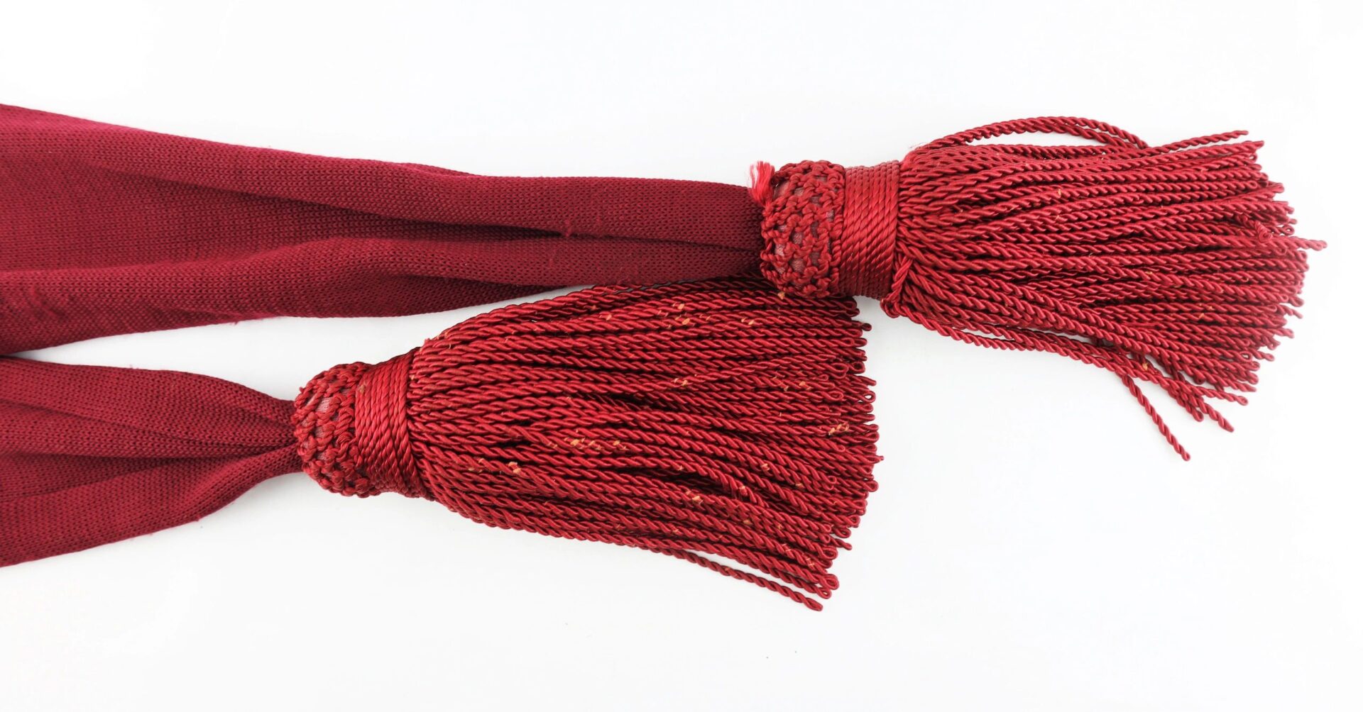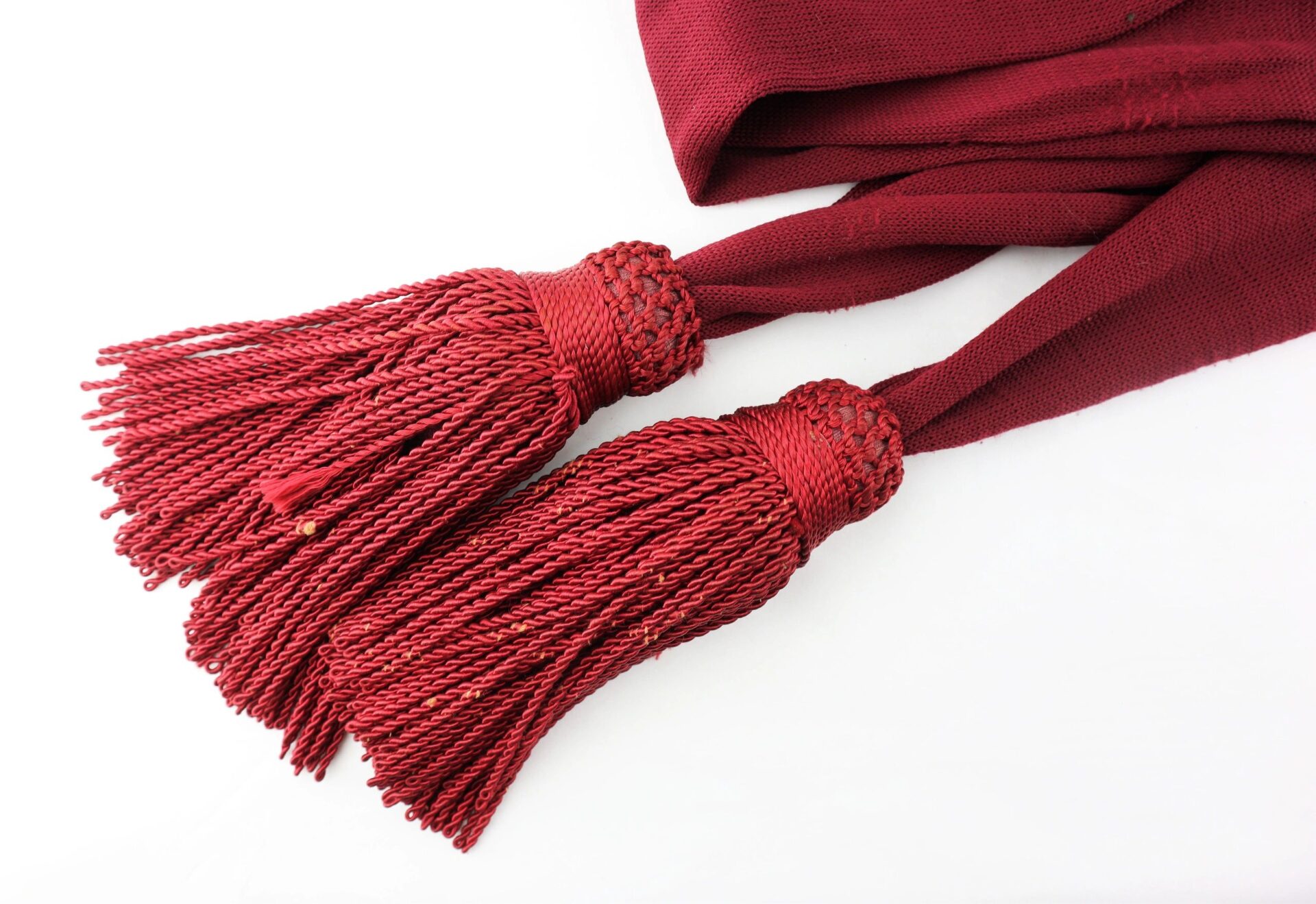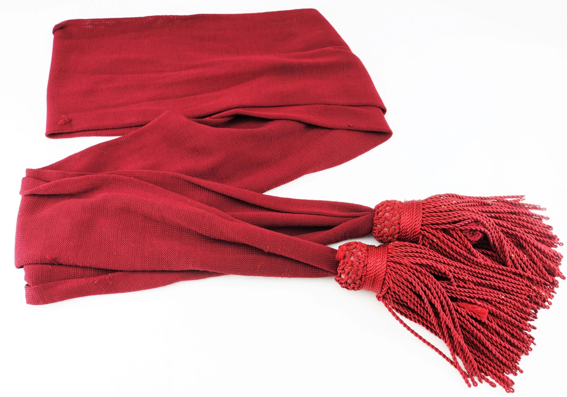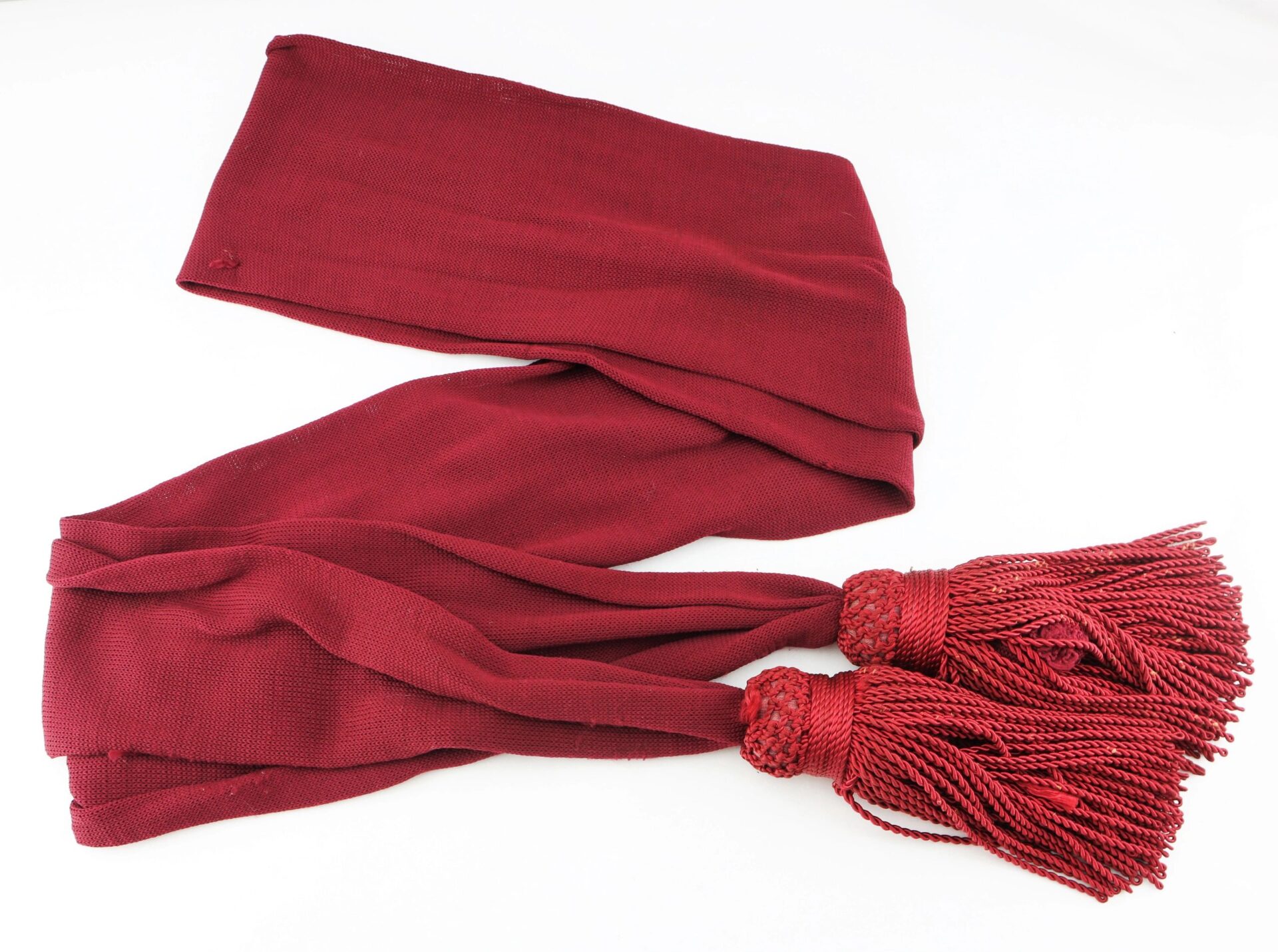 Civil War Officer’s Sash – Inventory Number: UNI 129 / SOLD Original Civil War officer’s maroon silk sash in very good condition. Worn by Federal officers in most of the branches of the United States Army, the waist sash was a common uniform accoutrement that signified a symbol of authority in the military during both field operations and camp duty. The sash, when worn over the frock coat, was wrapped twice around the waist and looped on the left side. The officer’s leather sword belt was worn over this sash. This specimen exhibits a maroon color and measures 6” wide by 108” in total length. The sash has a rich, unfaded color with very little wear and strong, full-length tassels. Original Civil War silk sashes are becoming difficult to find in the collecting field today. A fine example.   Inventory Number: UNI 129 / SOLD
