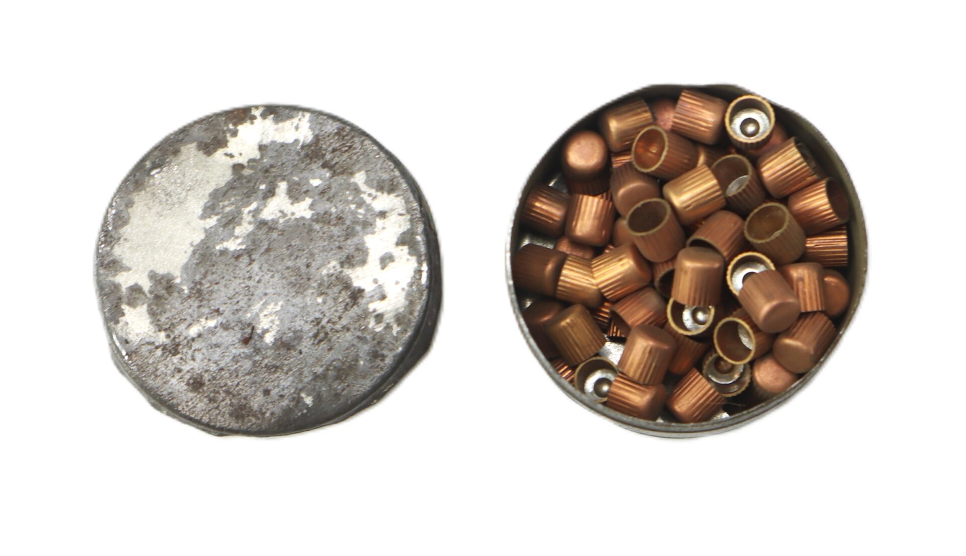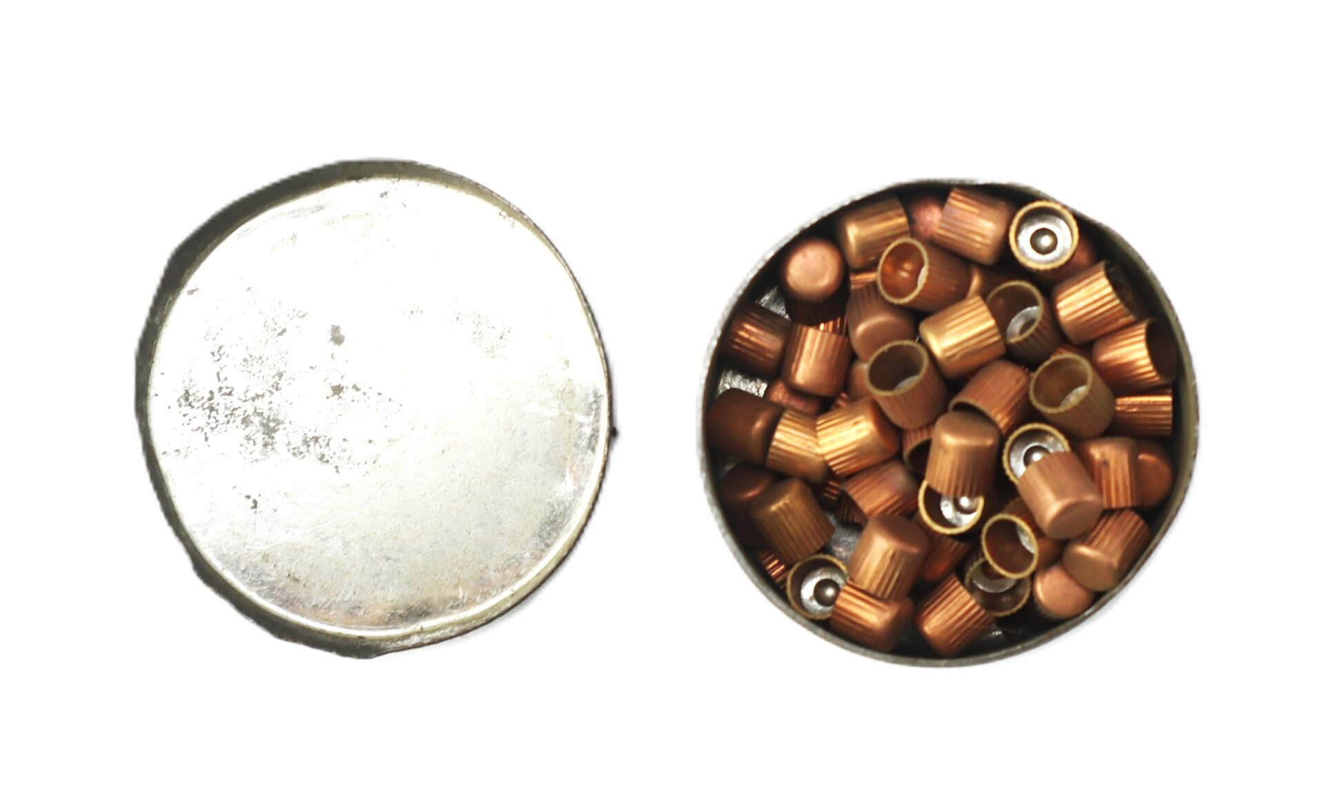Nice condition example with some of the original Japanned finish. Contains nearly all/ if not all the original caps. Measures 1 1/2” x ¾”.
