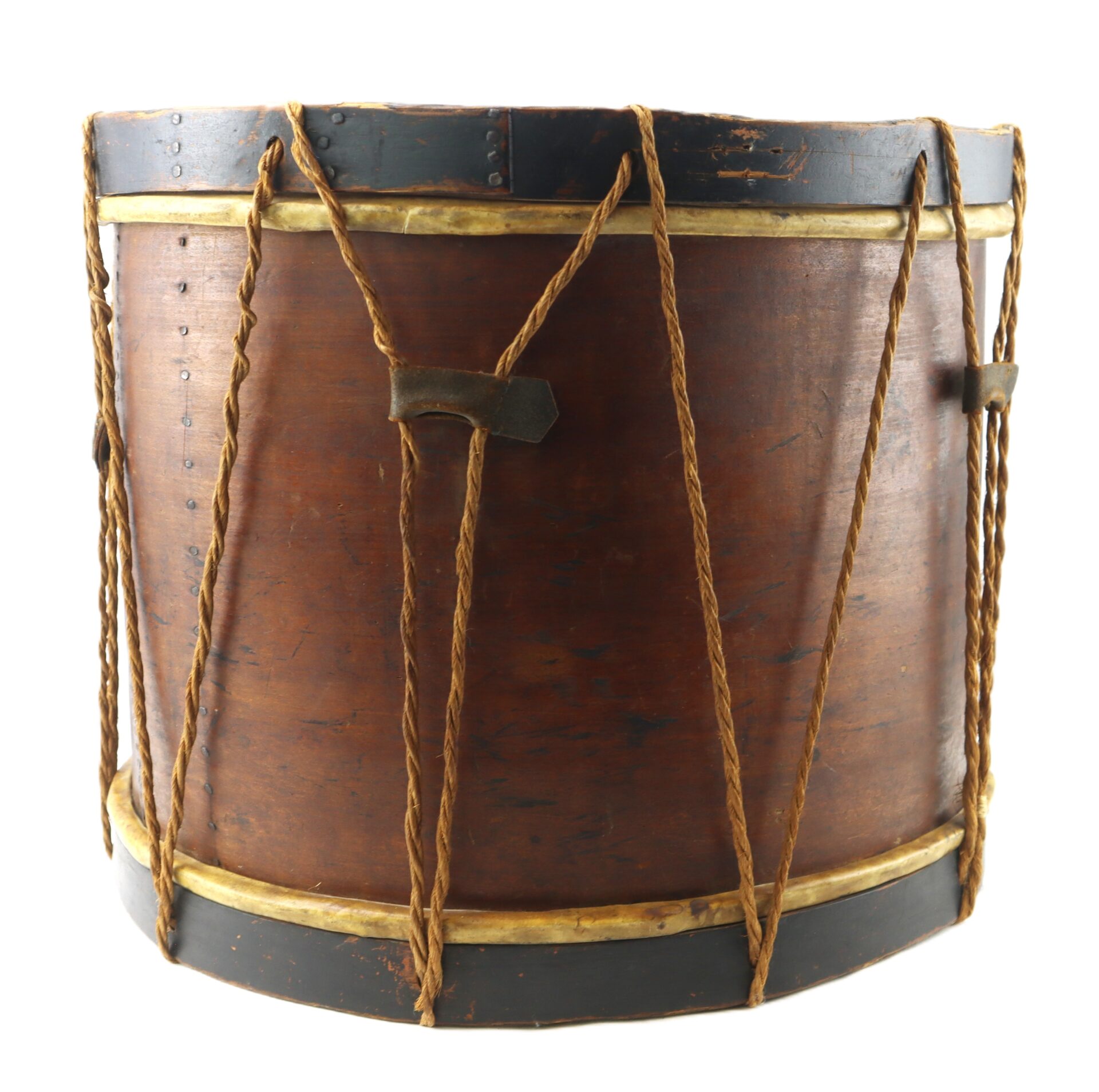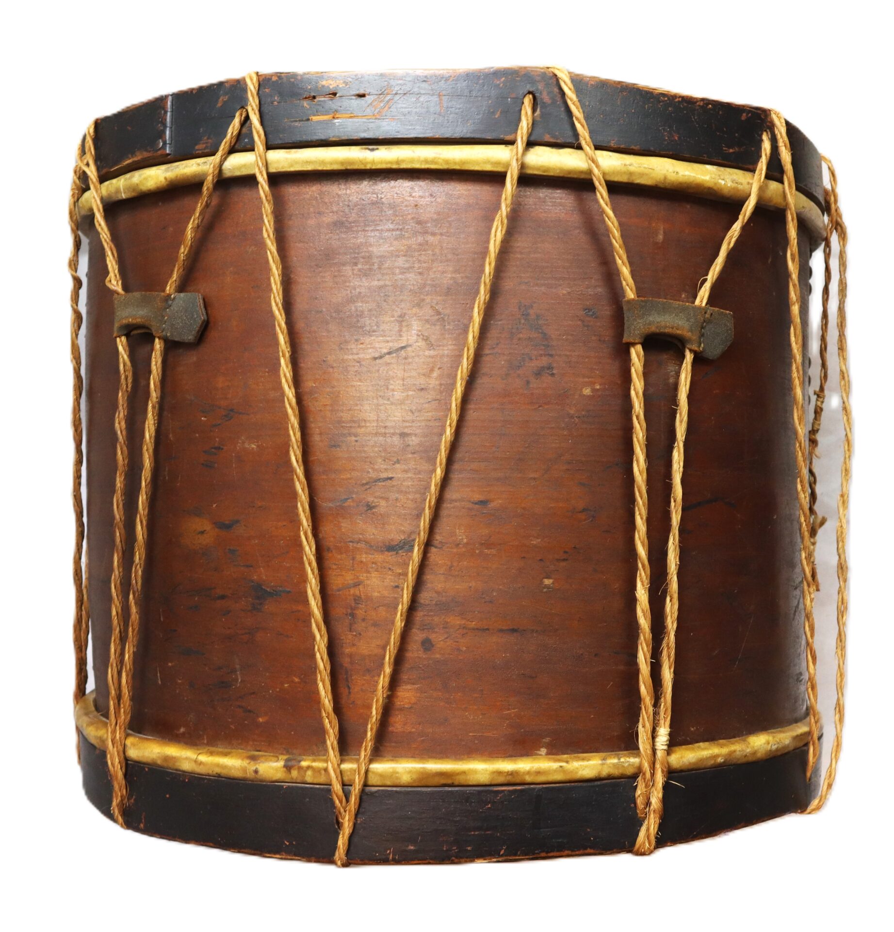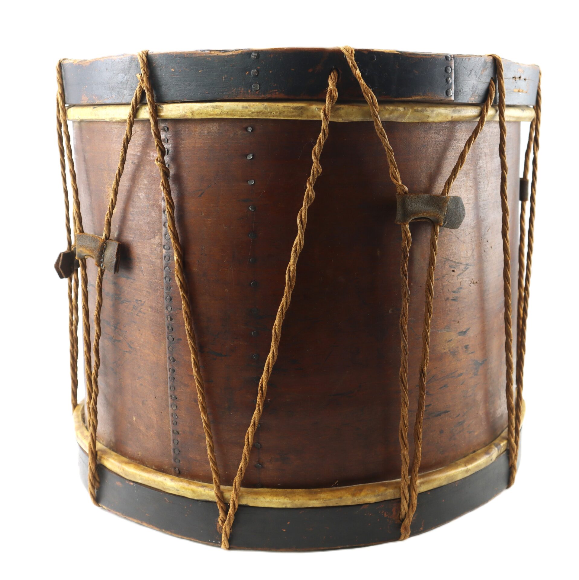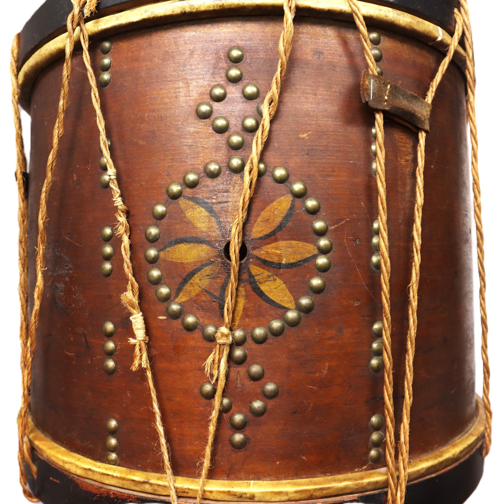 A fine and completely original mid-19th century rope-tension military field drum, retaining both of its natural calfskin drumheads and woven rope tension cords. The single-ply wooden shell exhibits a rich, warm patina with decorative brass tacks forming a stylized floral or sunburst motif—an embellishment often found on early war or pre-war militia drums.