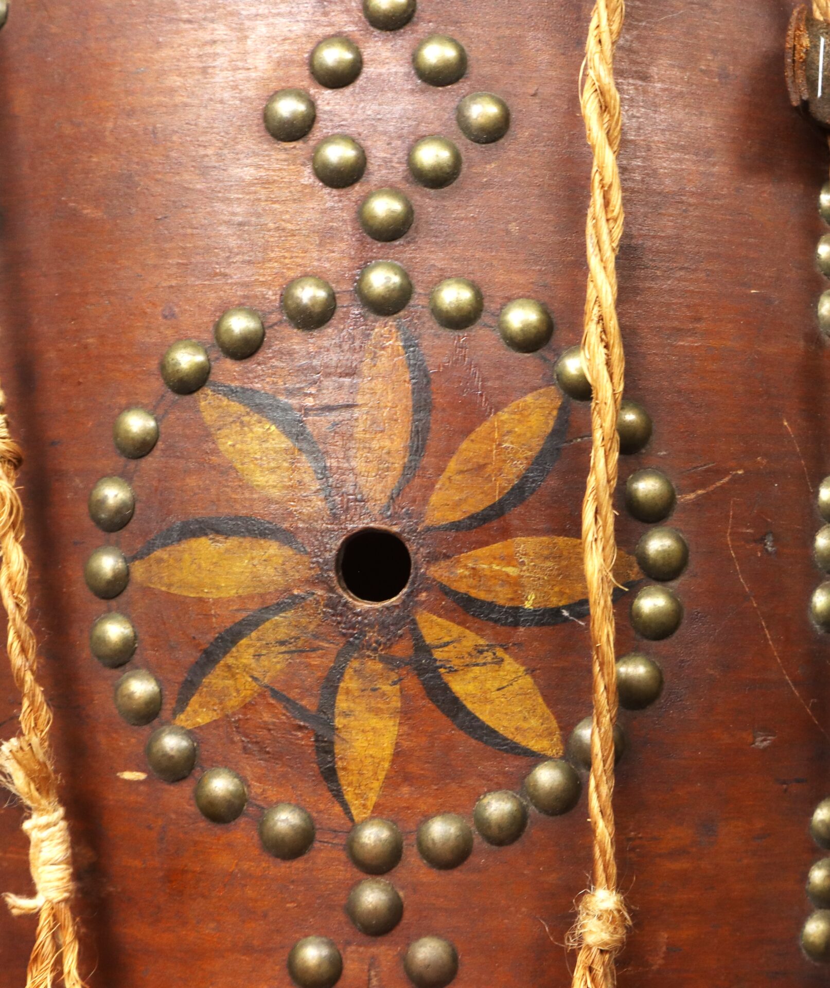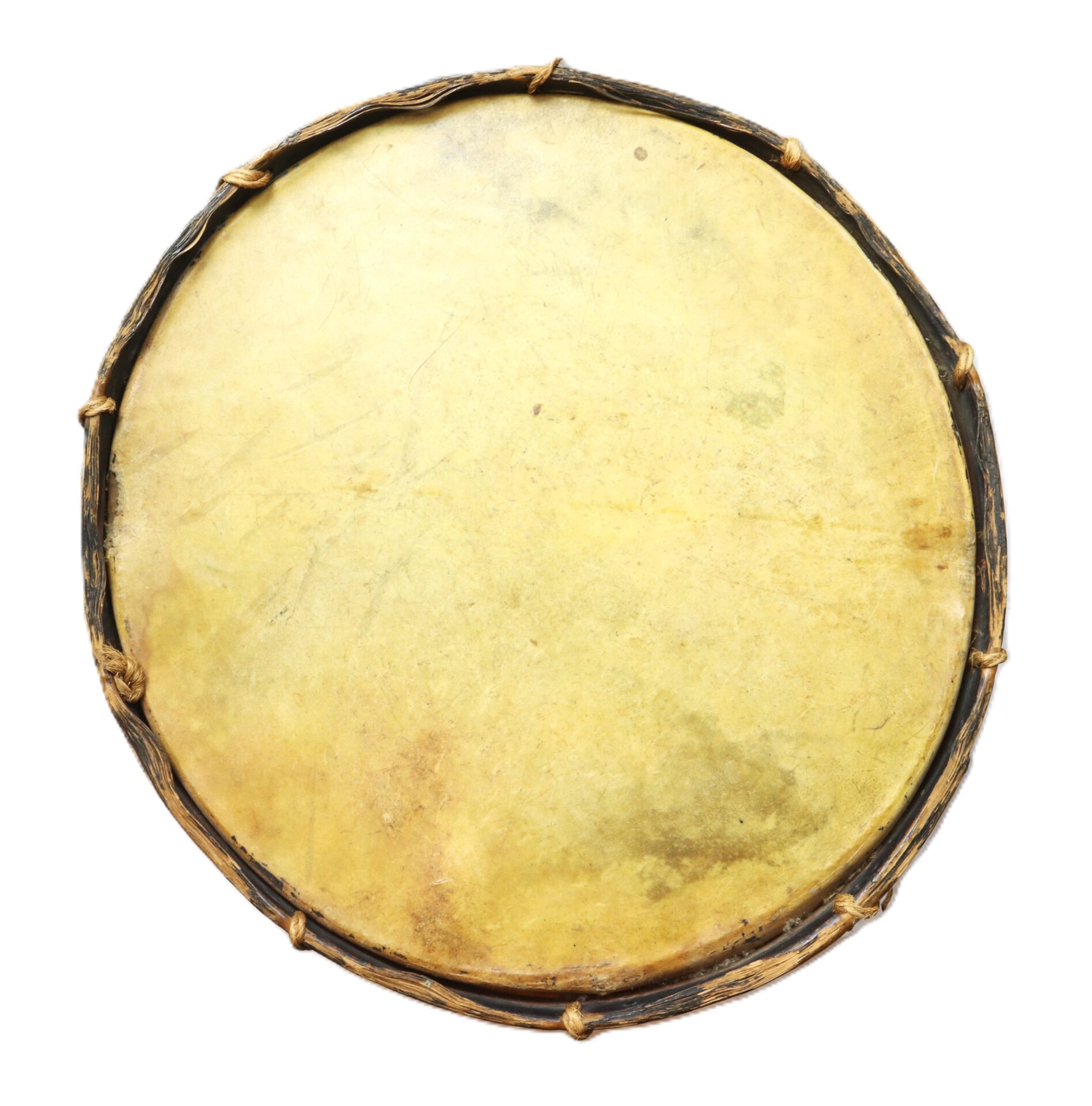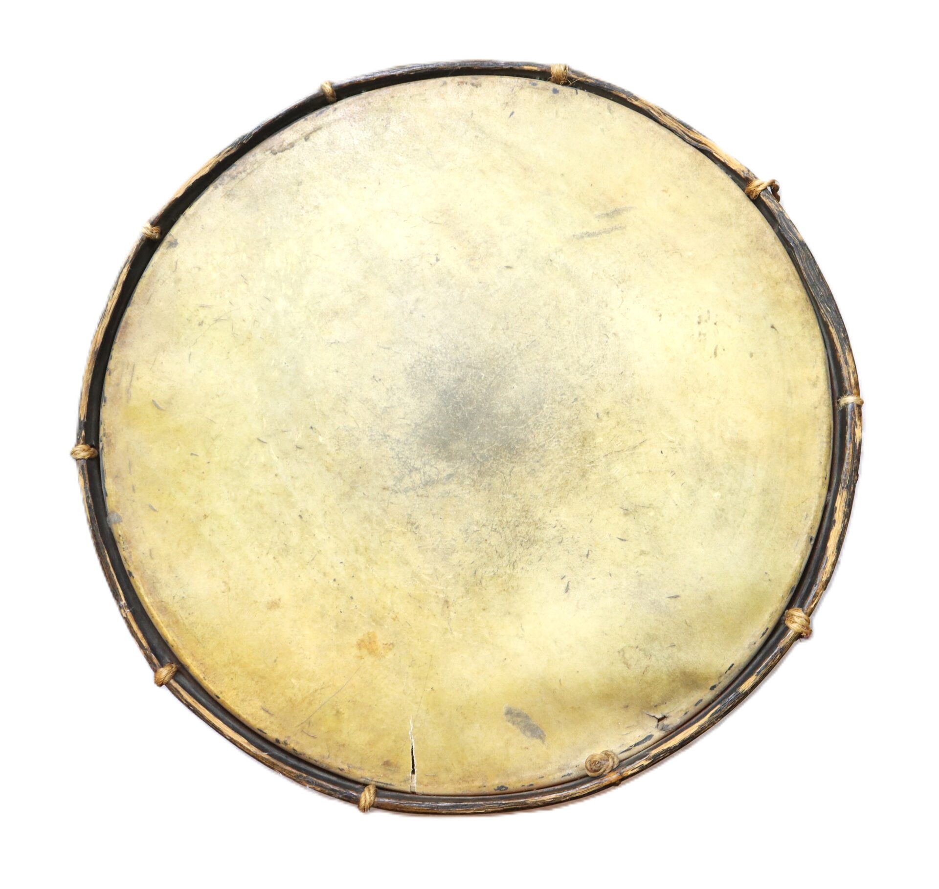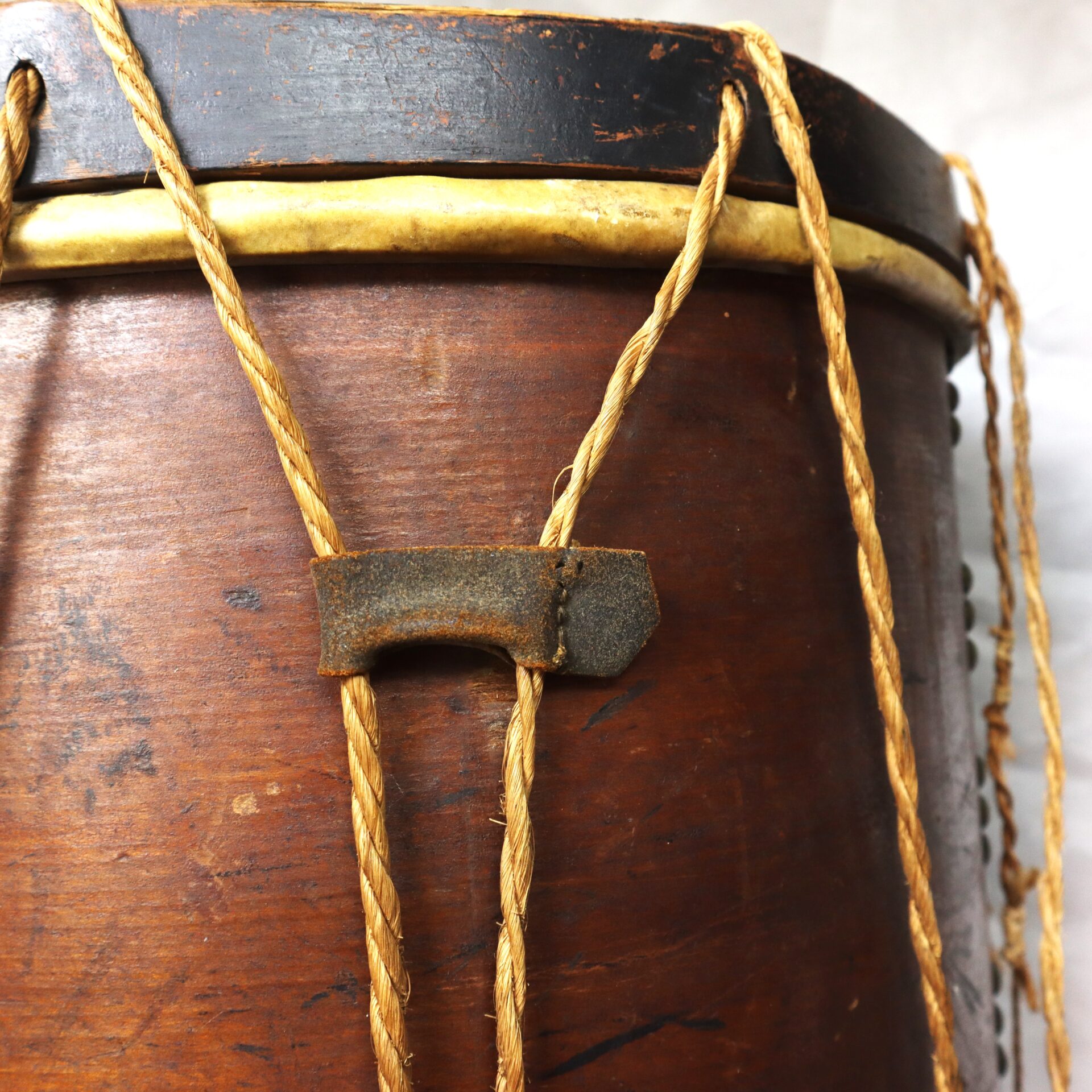 A fine and completely original mid-19th century rope-tension military field drum, retaining both of its natural calfskin drumheads and woven rope tension cords. The single-ply wooden shell exhibits a rich, warm patina with decorative brass tacks forming a stylized floral or sunburst motif—an embellishment often found on early war or pre-war militia drums.