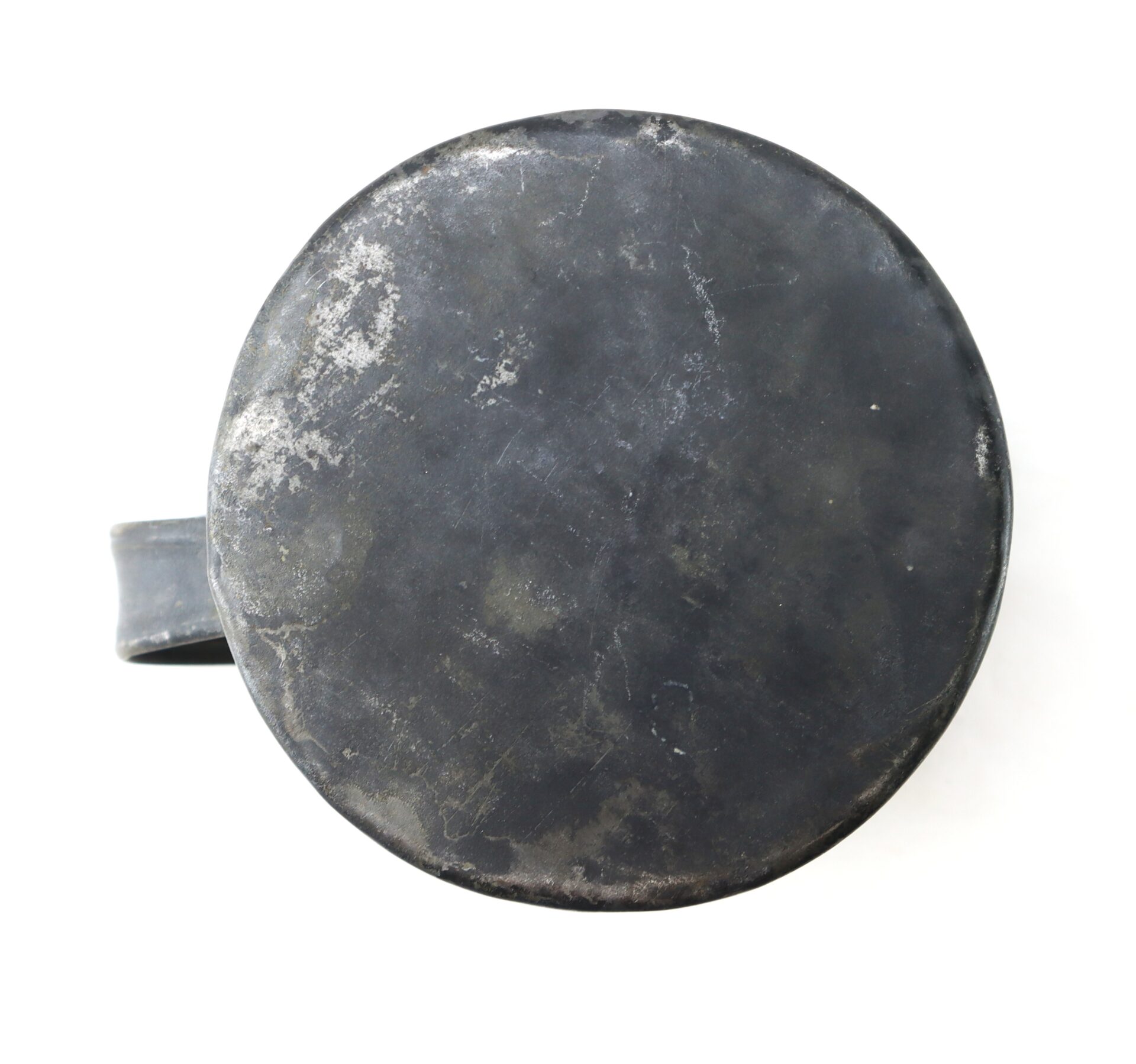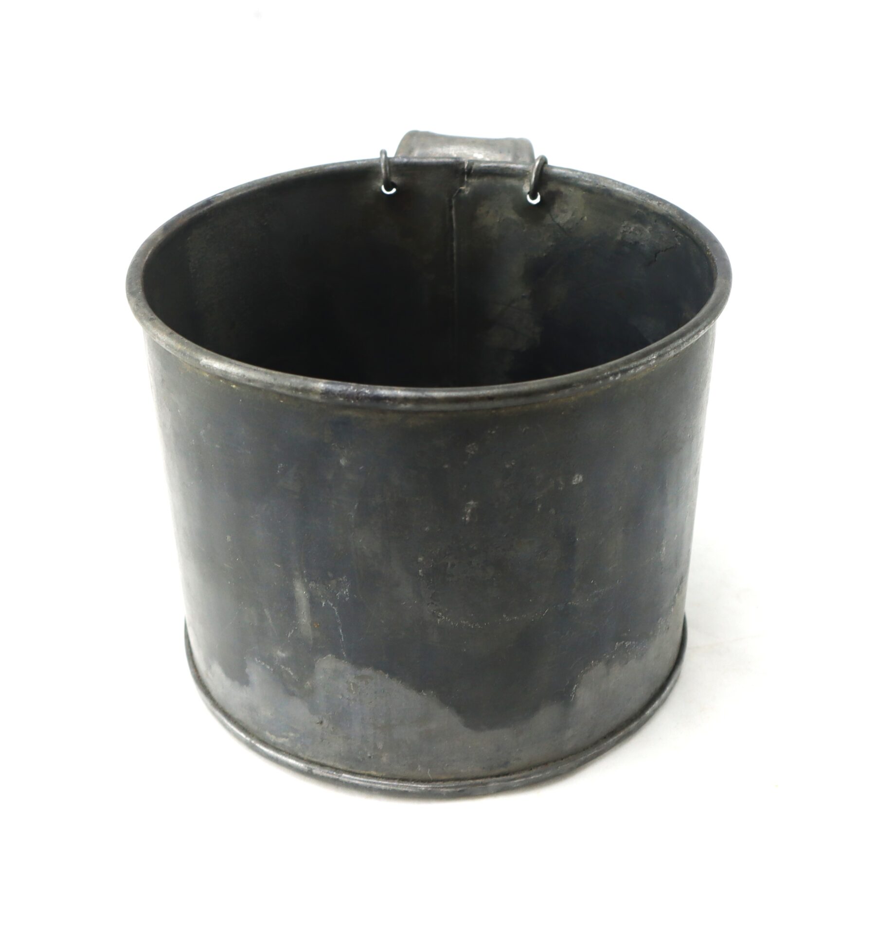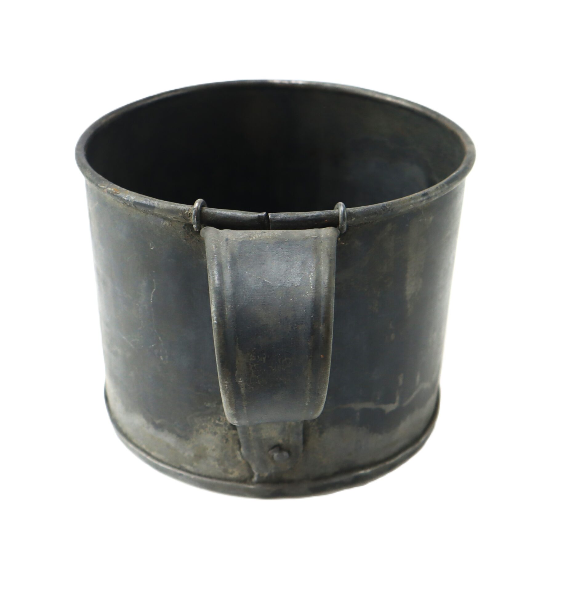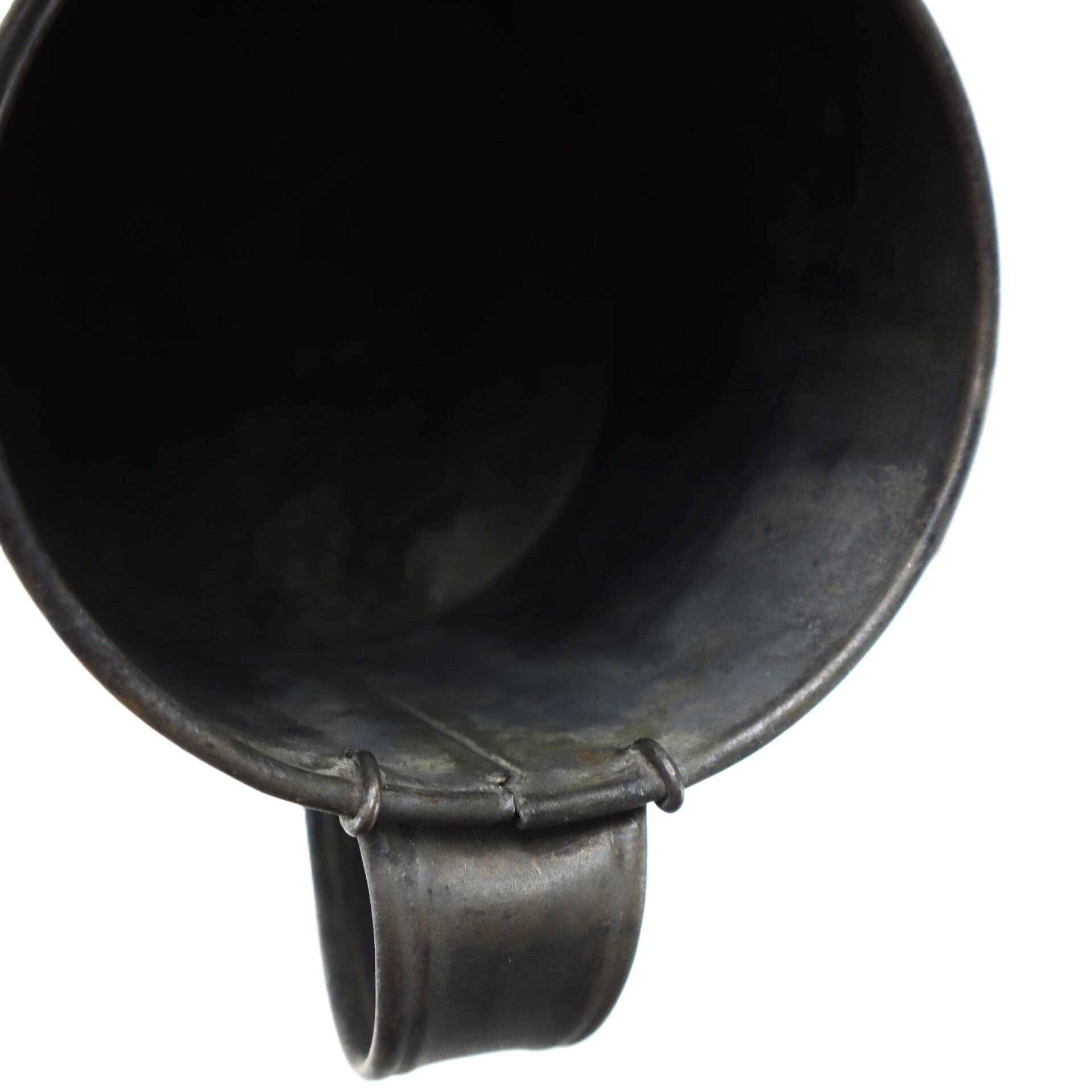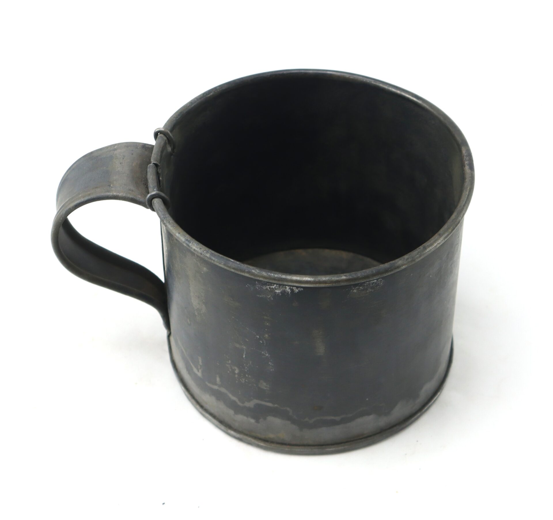 A fine example of an original U.S. regulation tin cup used by Union soldiers. Constructed of tinned sheet iron with a folded and soldered seam, this utilitarian cup features a classic rolled lip and the distinctively reinforced strap handle, allowing it to be hooked onto haversacks or belts for easy field use. These cups were standard issue and were used by soldiers for everything from coffee to soup—icons of daily life in camp and on the march. This example shows honest period wear and age-appropriate patina. Measures approximately 4” height x 5” diameter