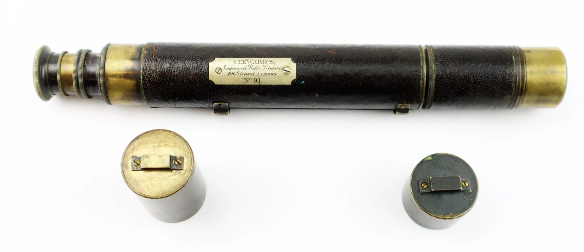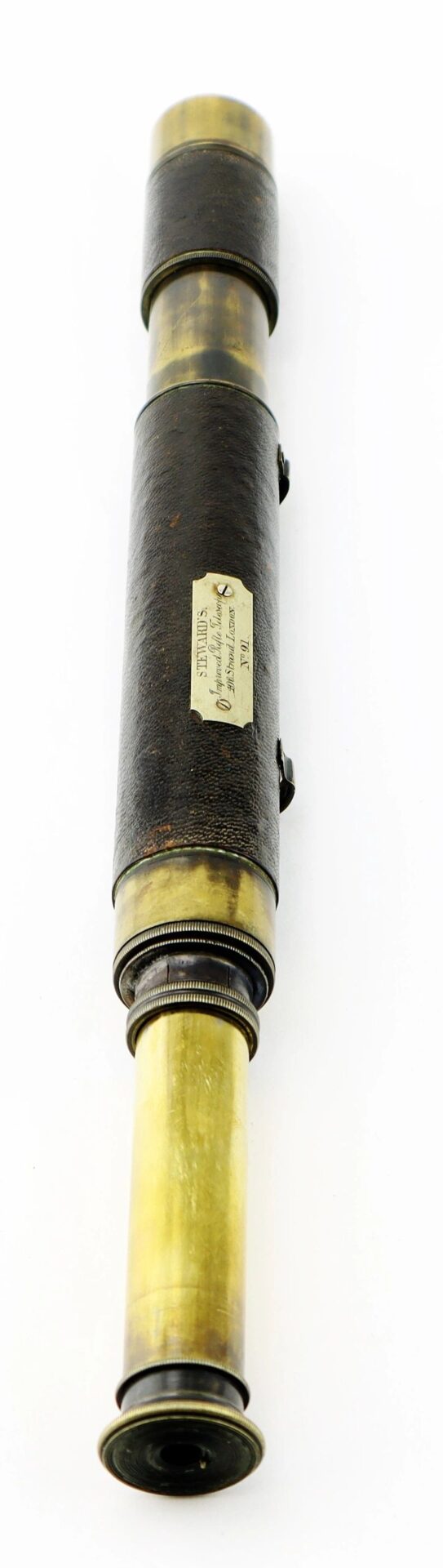 A rifle marksman’s telescope, “Steward’s Improved Rifle Telescope”, no 91, in leather-bound German silver, having a 1-inch objective lens with cover and extending shade, with two draws, one graduated at 1000 yards, the ocular having a sliding shutter, the body tube bearing an engraved plaque and one other, vacant, together with brackets for a tripod mount, 27 cm closed, 43 cm extended. In 1862 at a Gloucester Rifle Association meeting an “improved rifle telescope handsomely mounted in German silver, with a tripod stand to match, value five guineas” made by Steward was offered as a prize. The Bristol Mercury reported that Steward had a tent with a large collection of telescopic glasses of every description at a rifle competition in Bristol in 1863. By the mid-1860s Steward was advertising himself as “Optician to the National Rifle Association.” James Henry Steward established his optical, scientific, military and surveying instrument business in London in 1852, becoming optician to Her Majesty’s Government and the National Rifle, and National Artillery Associations, he died in 1896.