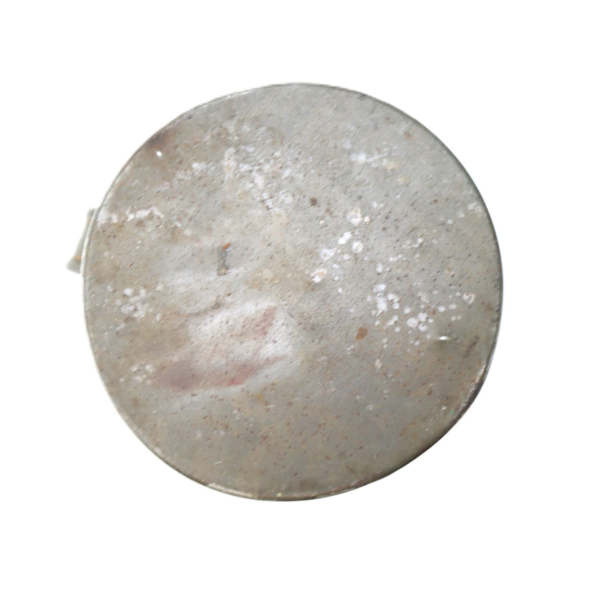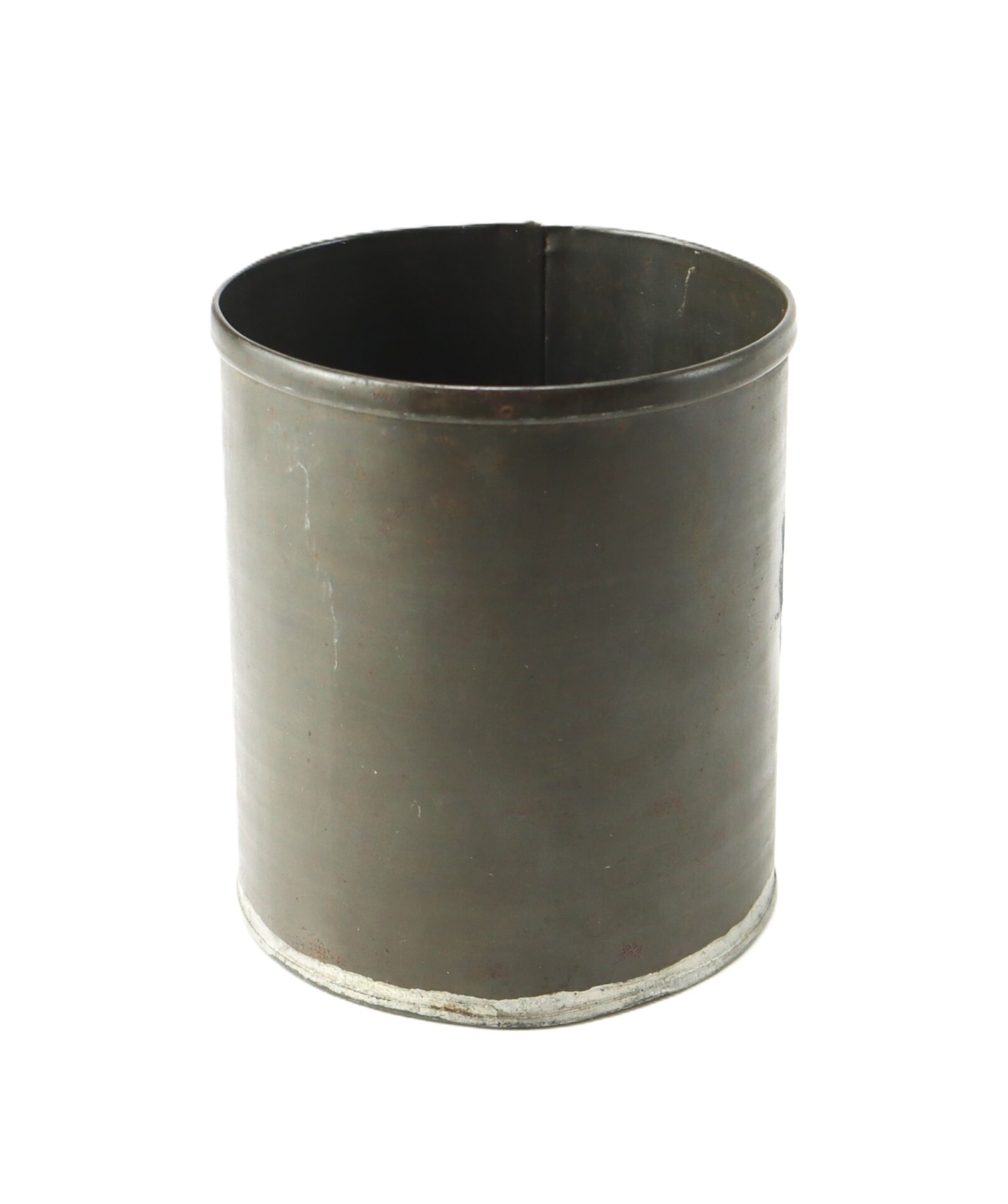 Well-constructed Civil War–era tin drinking cup featuring an attractive, untouched patina. This flat-bottom example is designed to hang from a canteen or knapsack, a practical field accessory for the soldier. Measures approximately 4 1/2” tall by 2 1/3” in diameter. A solid, honest example showing period use and age.