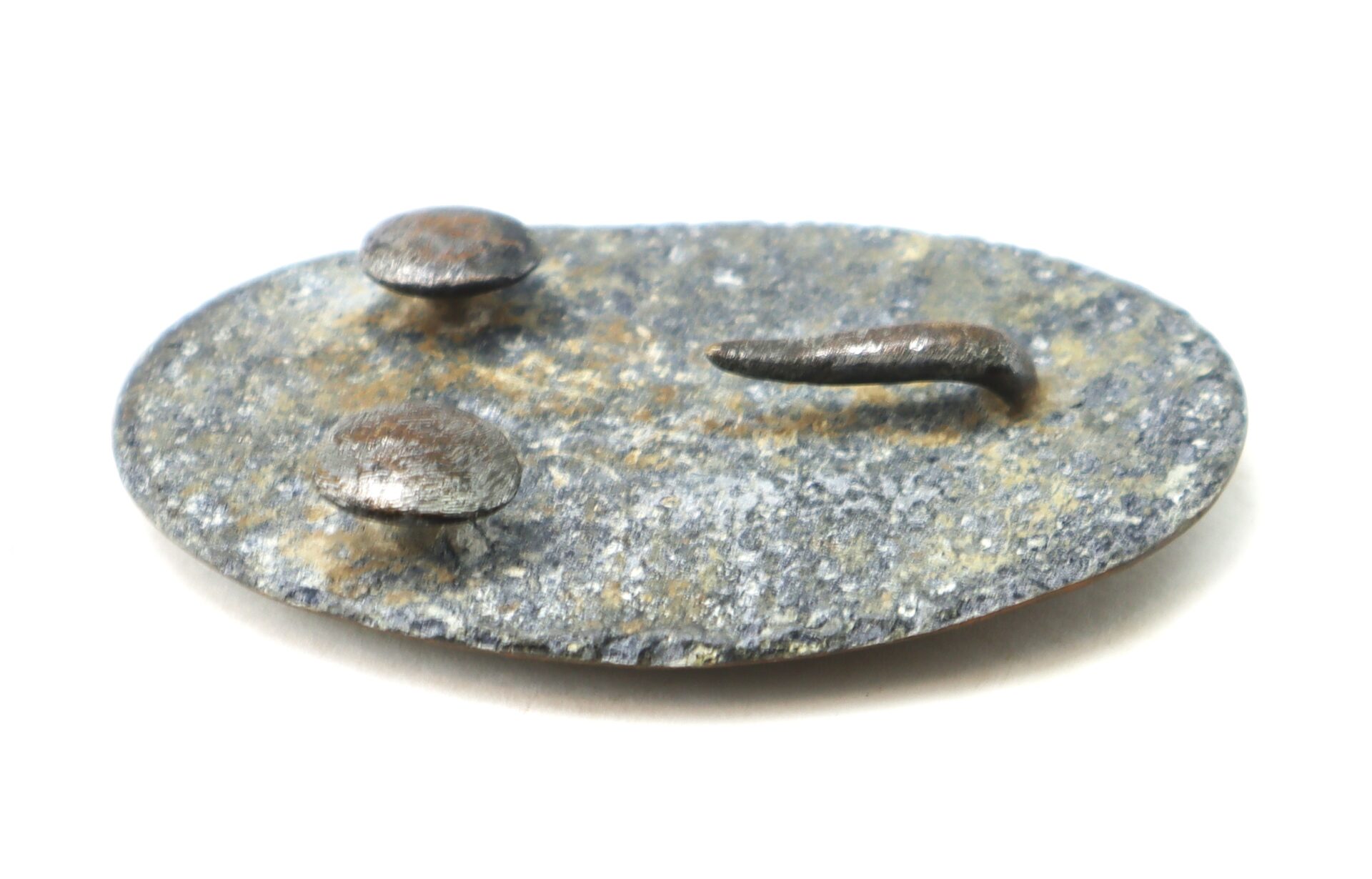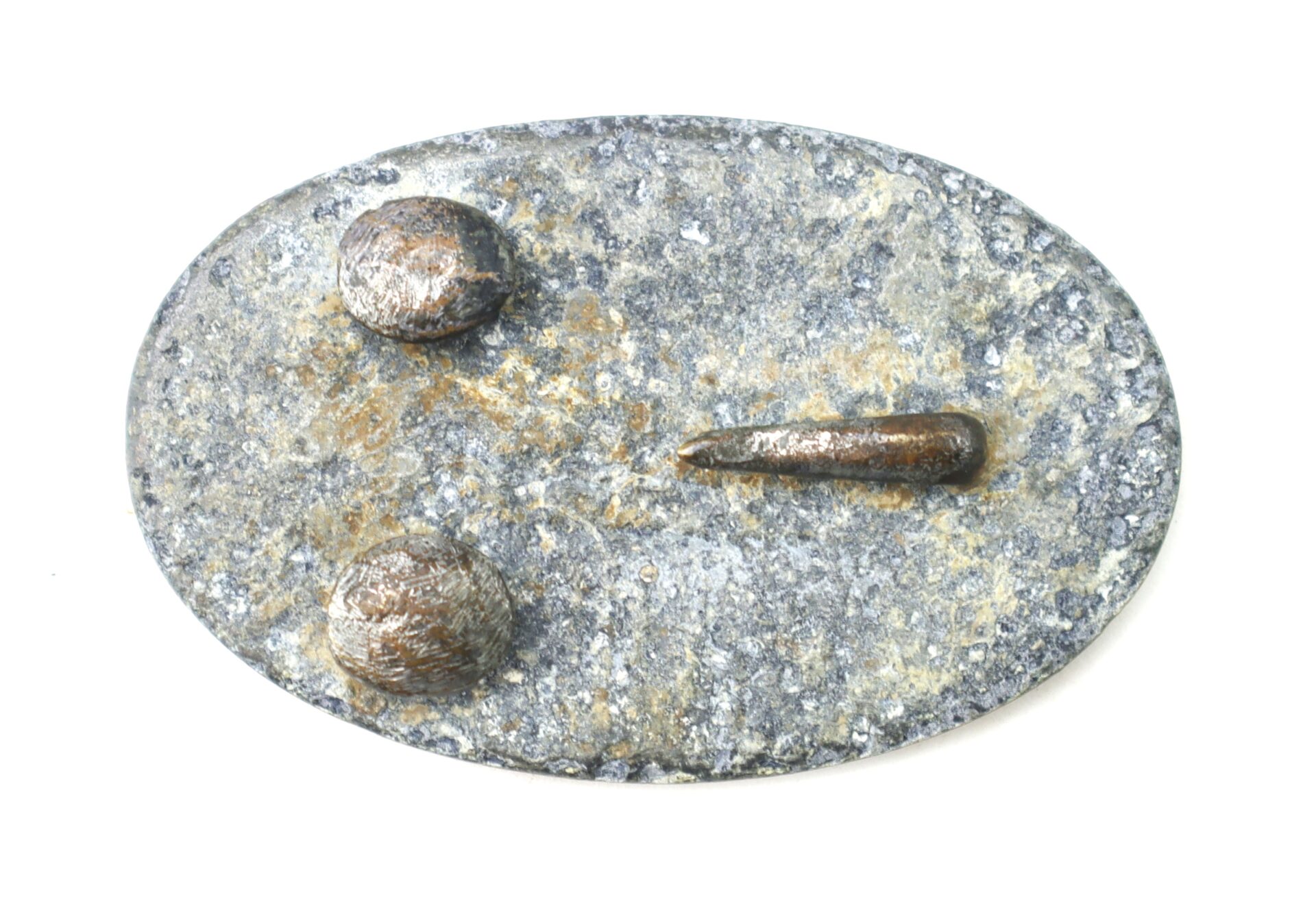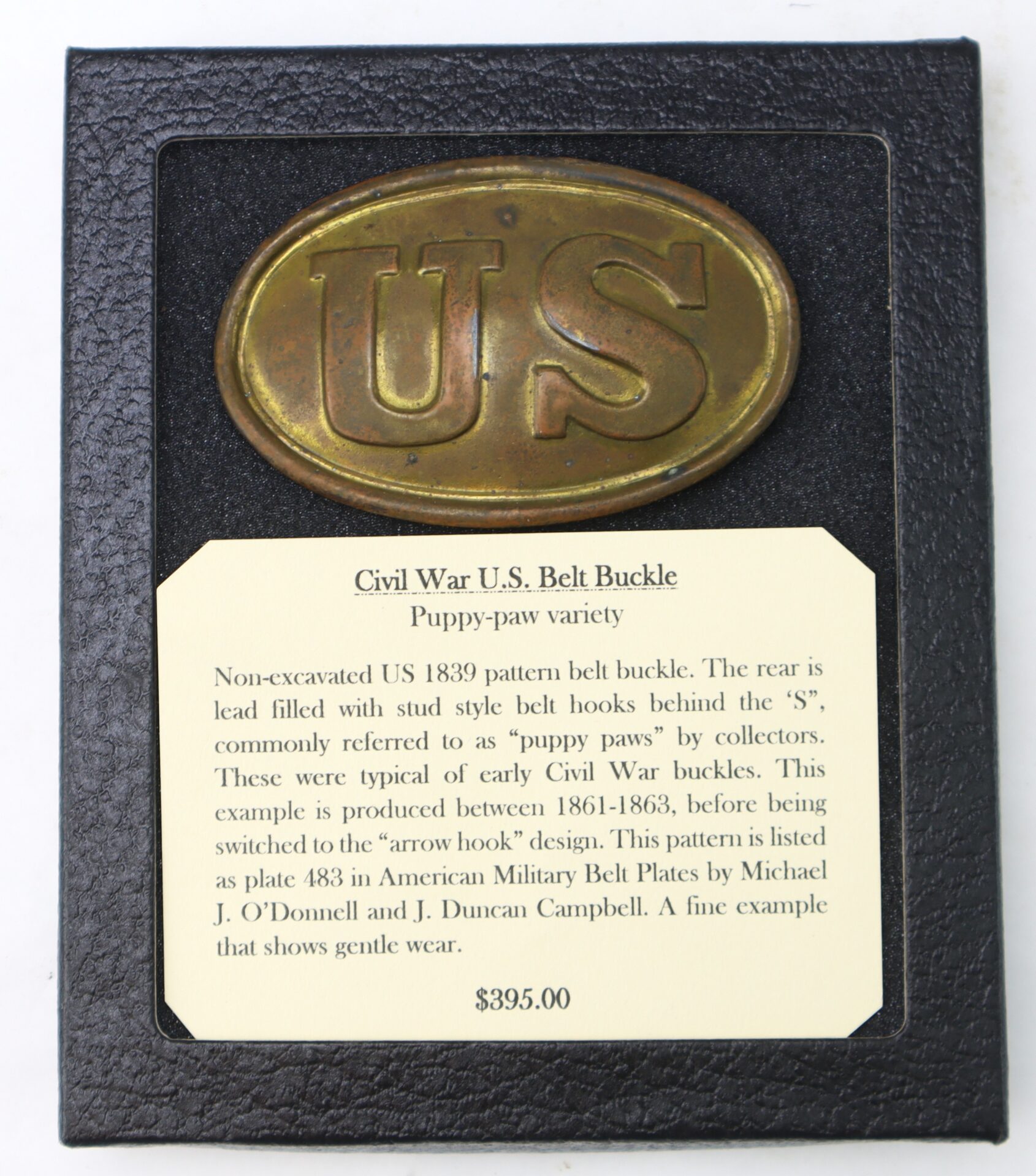 Non-excavated US 1839 pattern belt buckle. The rear is lead filled with stud style belt hooks behind the ‘S”, commonly referred to as “puppy paws” by collectors. These were typical of early Civil War buckles. This example is produced between 1861-1863, before being switched to the “arrow hook” design. This pattern is listed as plate 483 in American Military Belt Plates by Michael J. O’Donnell and J. Duncan Campbell. A fine example that shows gentle wear.