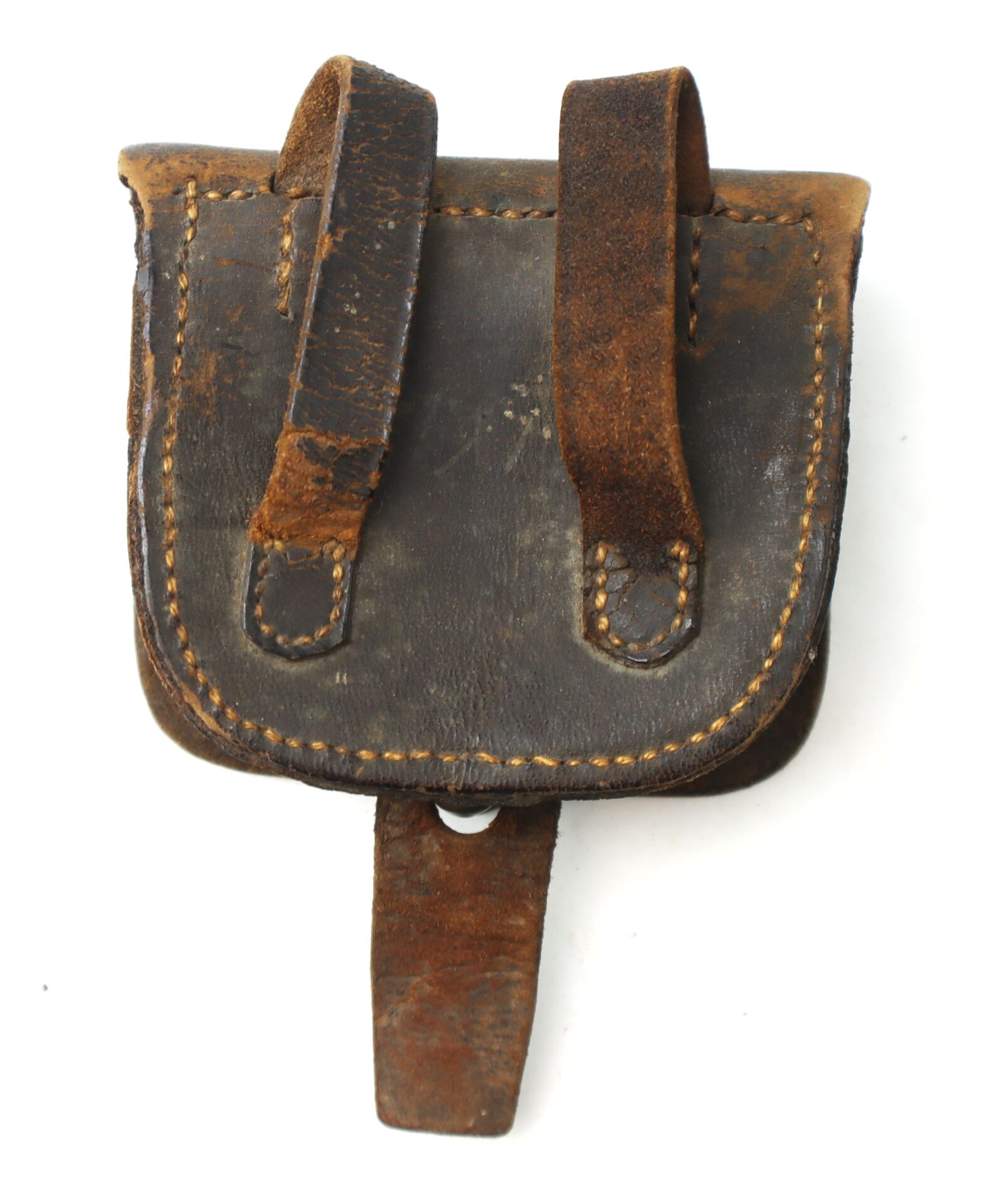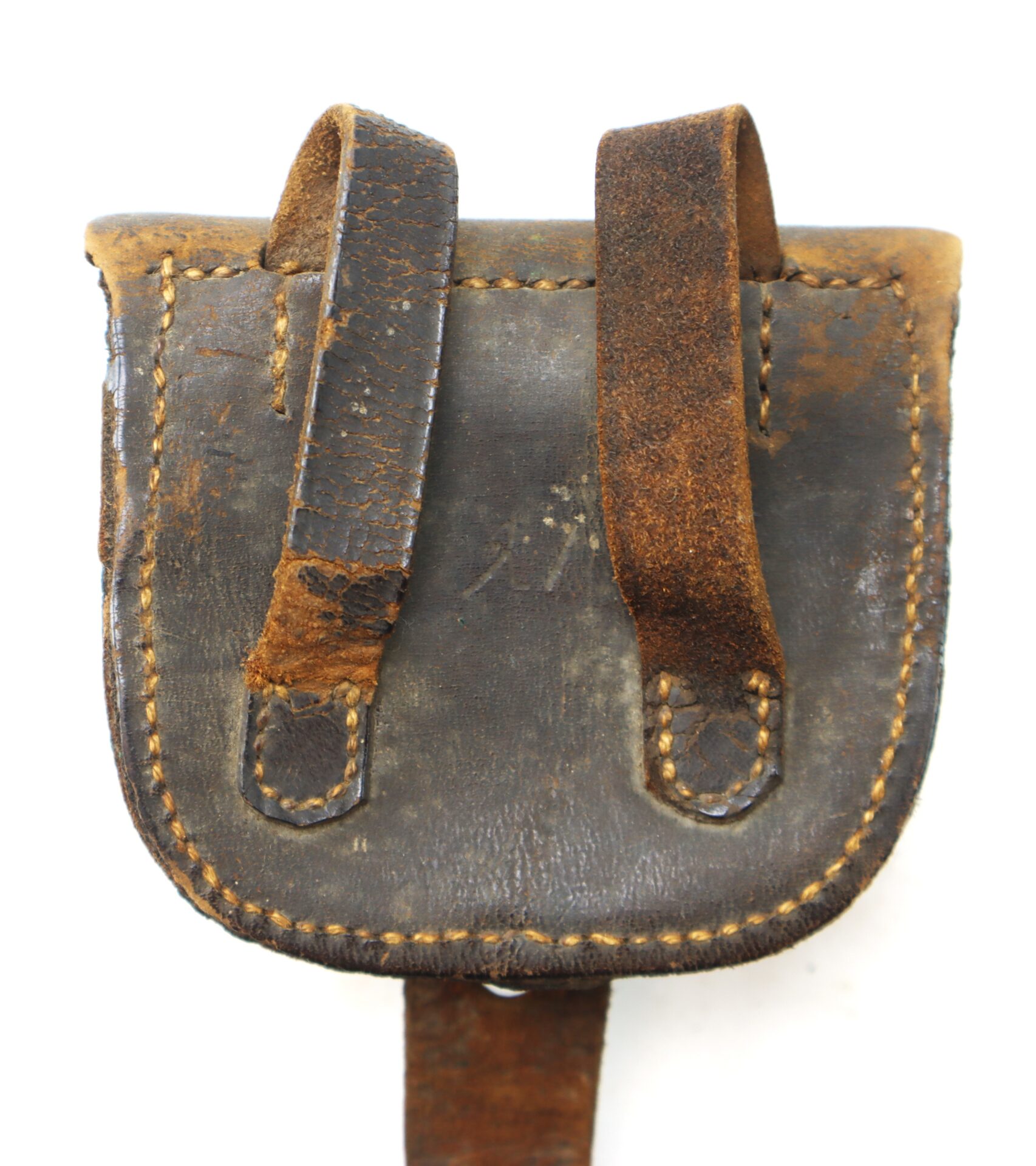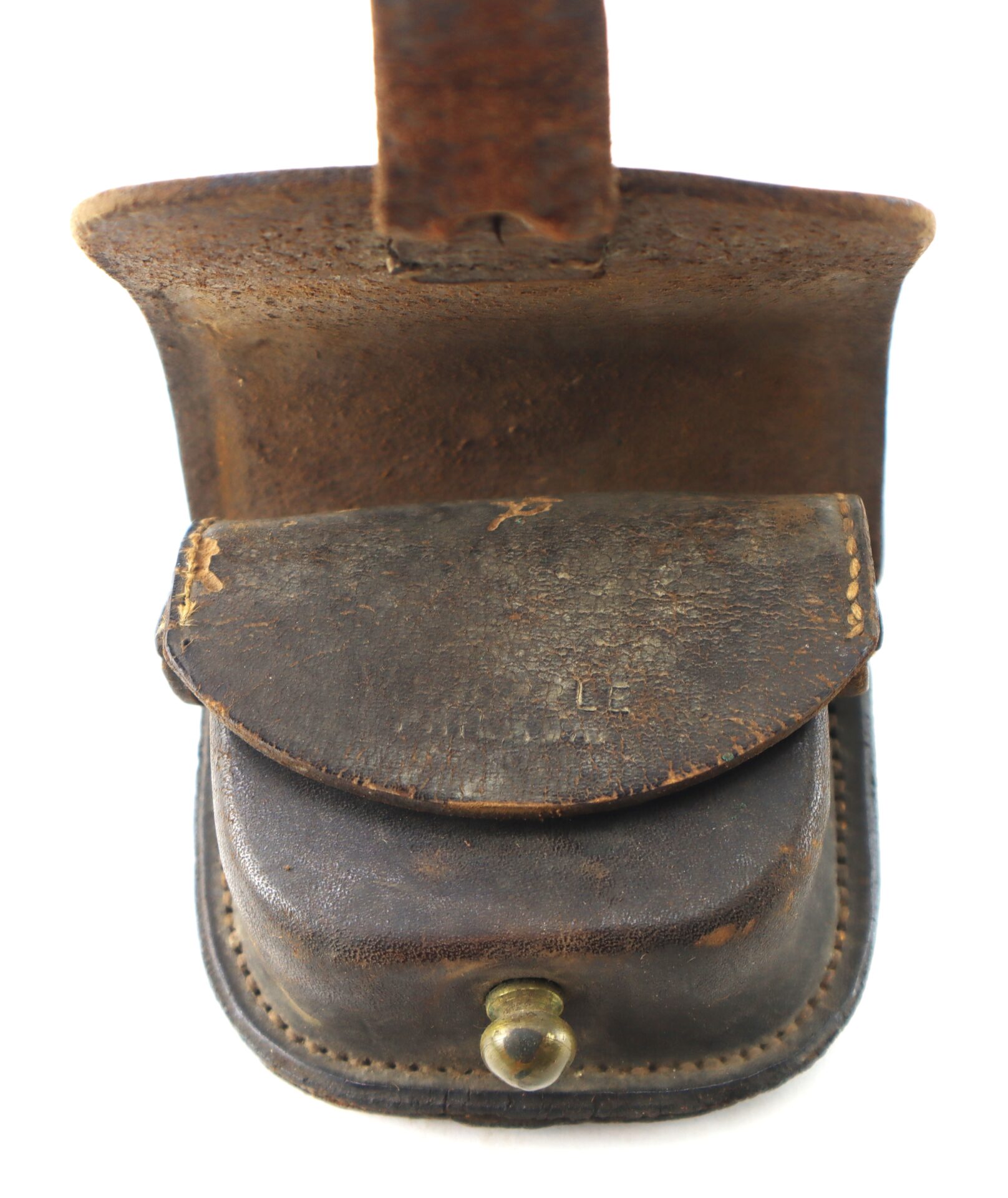 Nice original example of a Civil War shield front percussion cap box, with Philadelphia maker’s mark on the flap. Both belt loops are present and exhibit signs of distress from use.