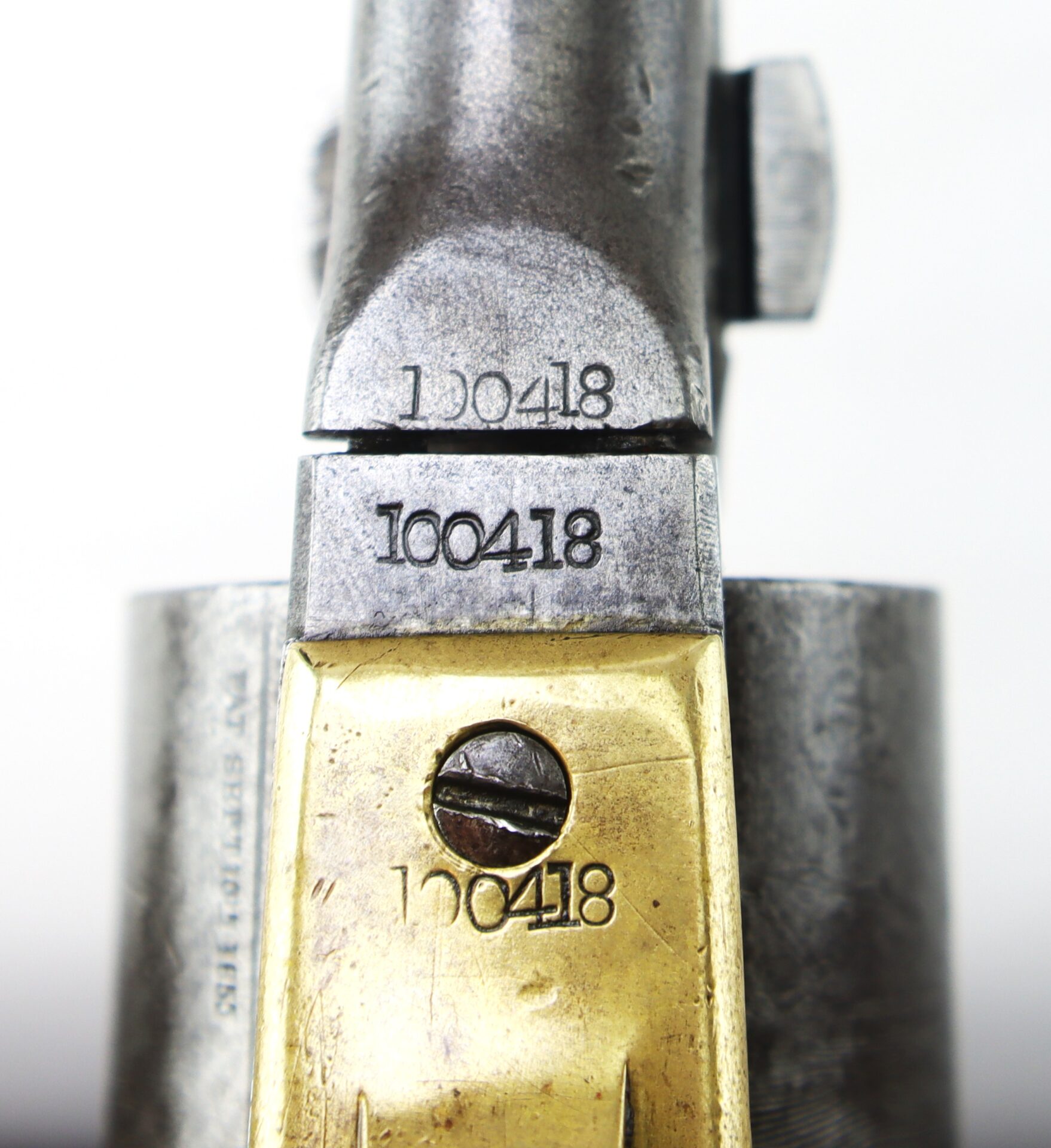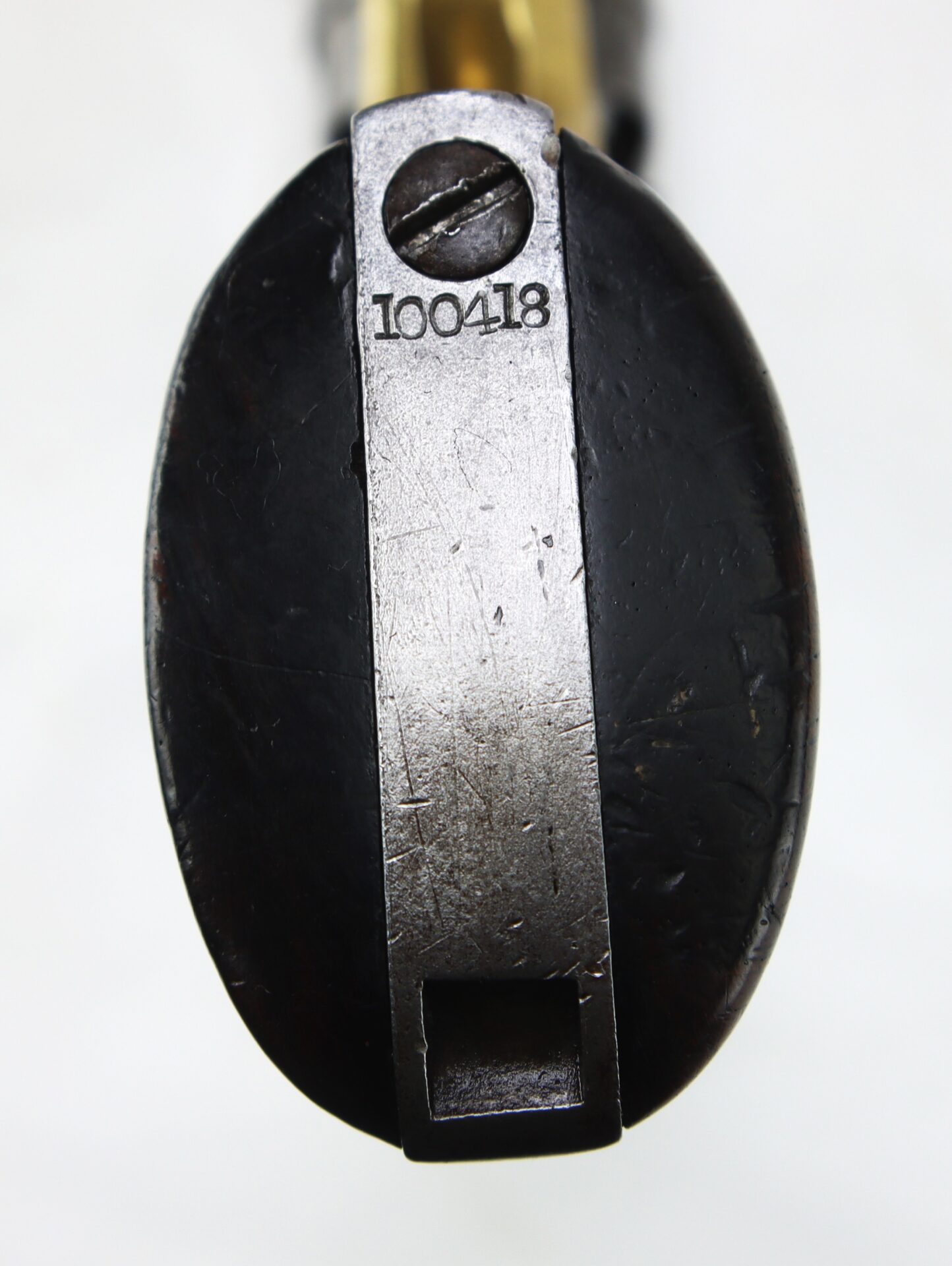 This .44 caliber percussion revolver retains an even, untouched gray-brown patina across the metal surfaces, showing honest service wear without signs of modern refinishing. The brass trigger guard displays a deep, natural mustard tone. Markings remain legible and well-defined.