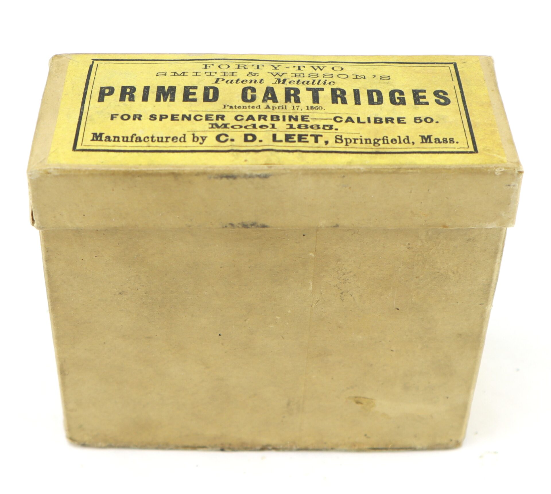The packet bears the prominent imprint of C.D. LEET of Springfield, Massachusetts, one of the most important subcontractors supplying primed cartridge cases to the Federal government and to private arms manufacturers during the conflict. Leet’s marked packets—especially complete, unopened examples—have long been prized for their scarcity and association with the iconic Spencer repeating carbine.