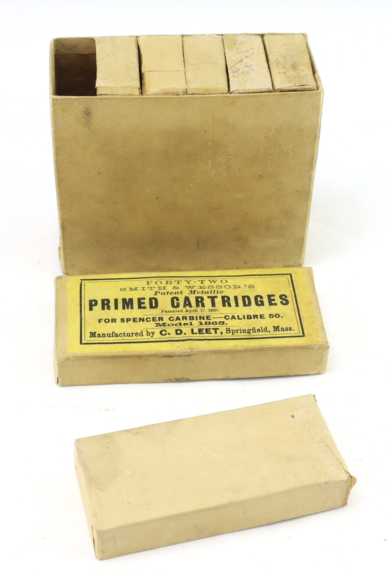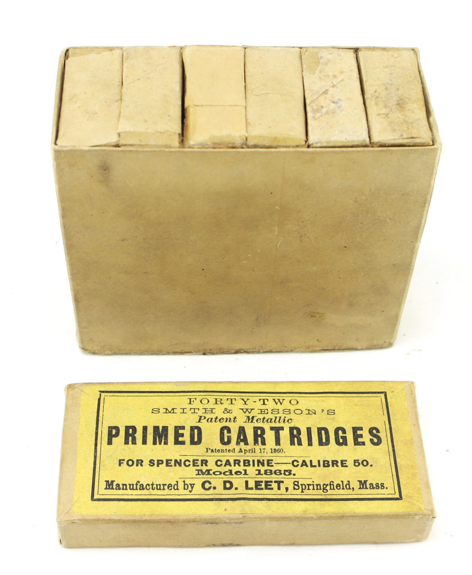 Complete Packet of Forty-Two Smith and Wesson’s Patent Metallic Primed Cartridges for the Model 1865 Spencer Carbine – Manufactured by C.D. Leet, Springfield, Mass.