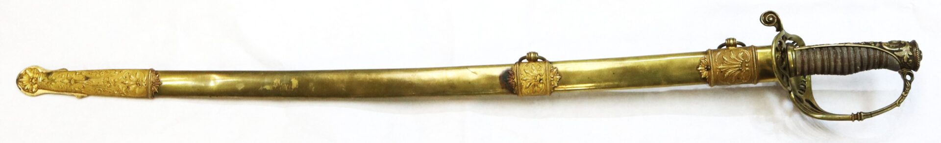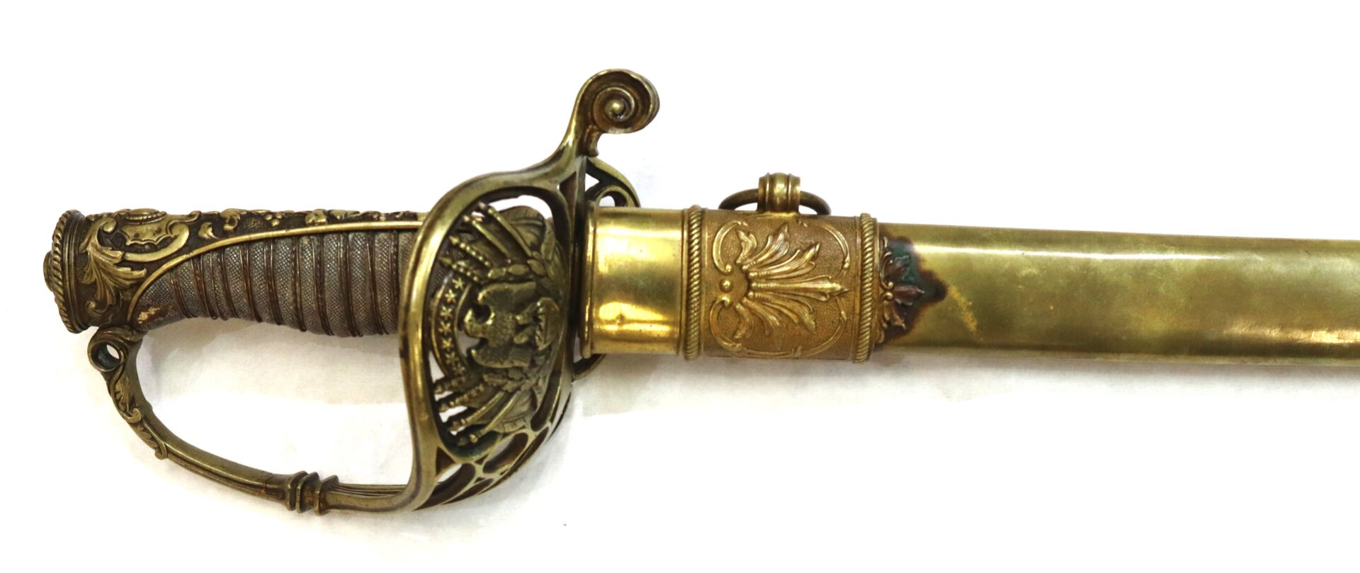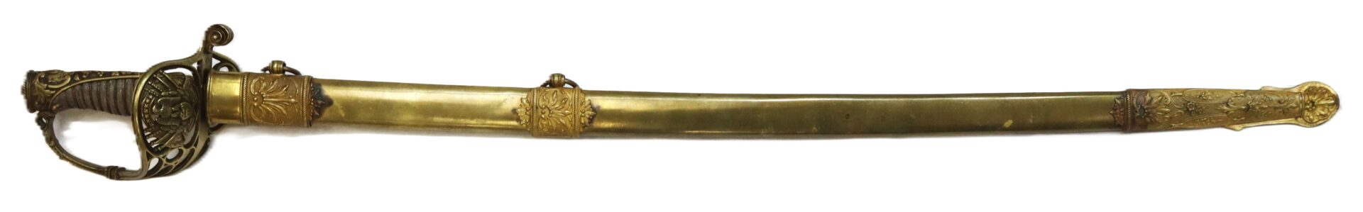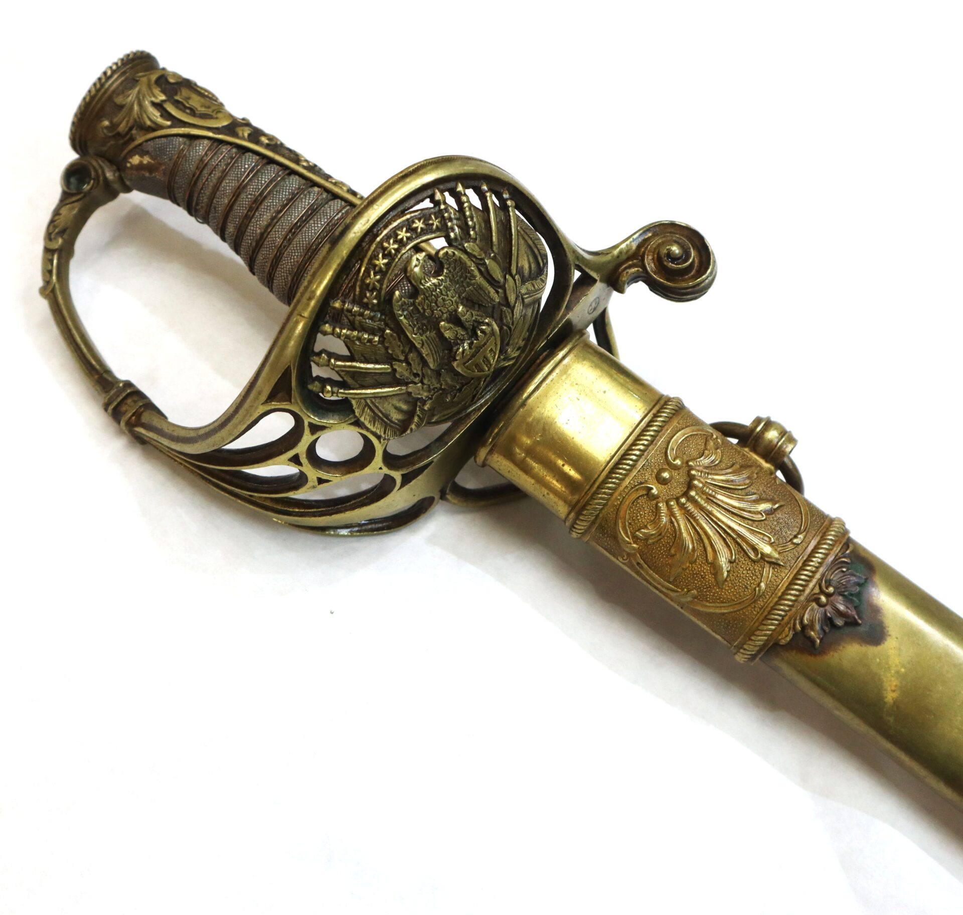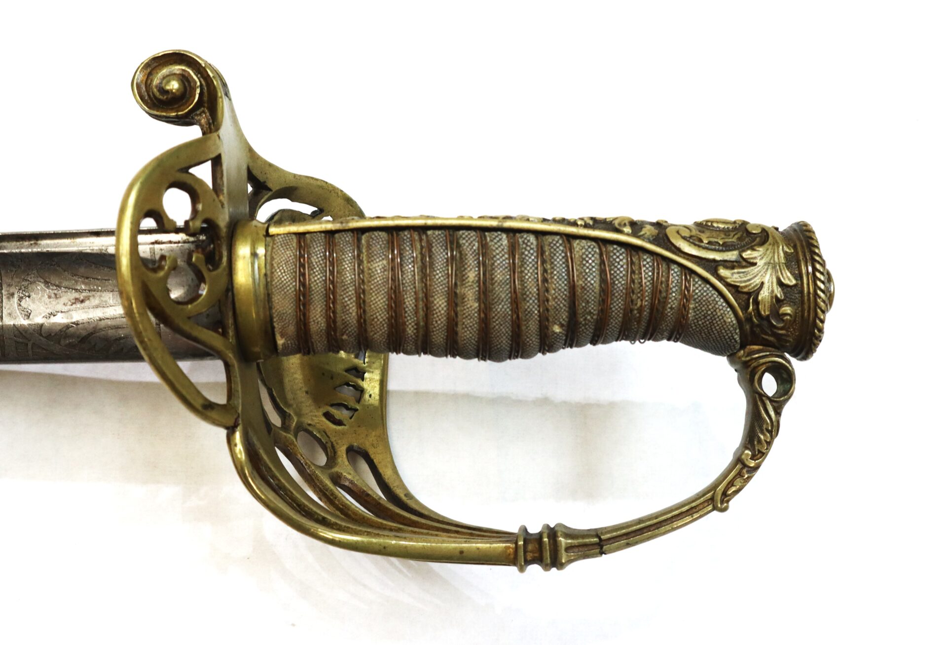 The large, ornate French-styled, cast brass hilt is typical on the sword and displays a cutout backstrap integrated which is slightly bent and as is the knucklebow with small structurally sound hairline cracks. Hilt is tight to the tang with leather washer present. Pommel exhibits a flat, almost oval brass disc that covers the tang mound. All brass has a bright gold gilt overall with one small area of discoloration. Grip is in wonderful condition and features the original shagreen covered wooden handle secured with fine double-twisted copper wire flanked on each side by a single thread of dark wire, all tightly wound around the handle. Grips excellent with no cracking or major loss.