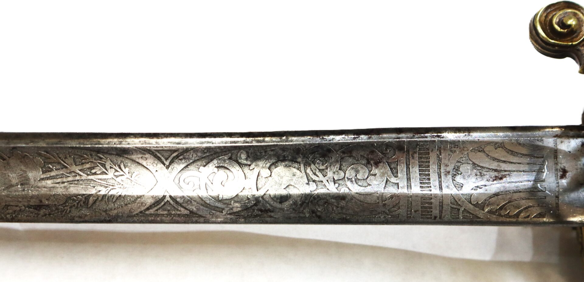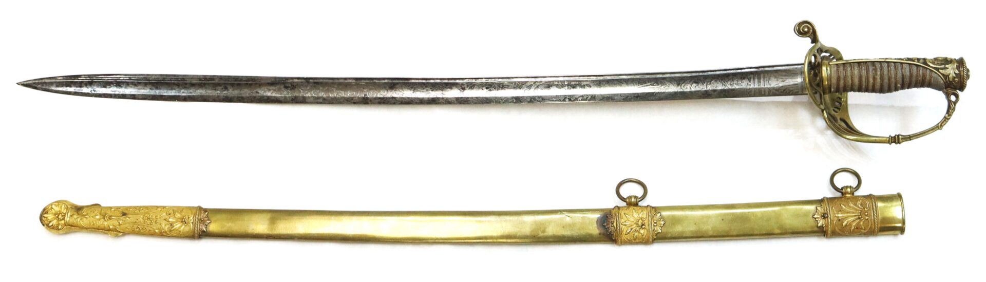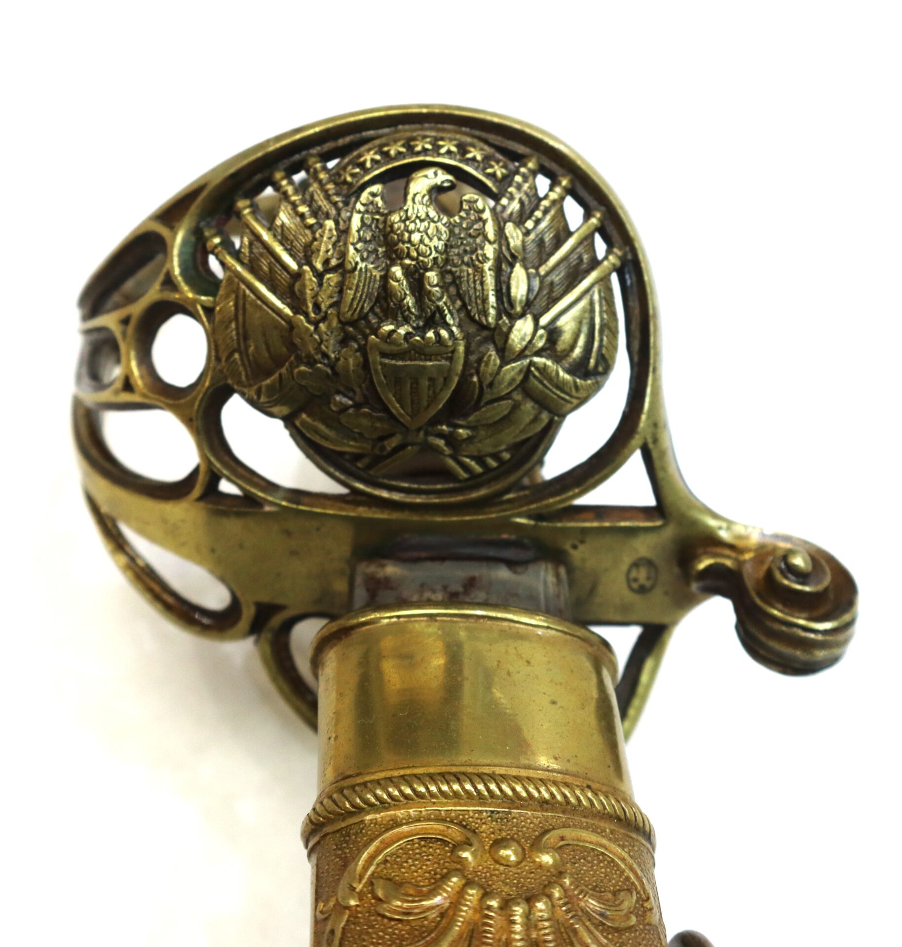 This Civil War sword is a very fine example of an original, non-regulation Model 1850 Staff and Field Officer’s sword manufactured by the Newark, New Jersey firm of Henry Sauerbier. The high quality, highly embellished sword is complete with its deluxe brass scabbard adorned with ornate brass mountings. The handsome, slightly curved steel blade measures 31” long and has a width of 1 1/8” with a 24” long unstopped fuller and 20” narrow fuller. Both flats of the bright blade exhibit the Sauerbier style of both military and leafy floral motifs with fancy acid etching in like-new condition. All etchings are excellent with high detail. As with many of Sauerbier’s pieces, this blade is not etched with his name. But Sauerbier’s sword characteristics are evident in the large unstopped fuller, unique bulbous serifs or fishtail serifs on the letters “US”, the X-pattern etched on the reverse ricasso, the turned-down pommel and the ornate French embellished face guard. Slightly rounded blade back exhibits no stampings. Blade is fine with only very slight spots of oxidation.
