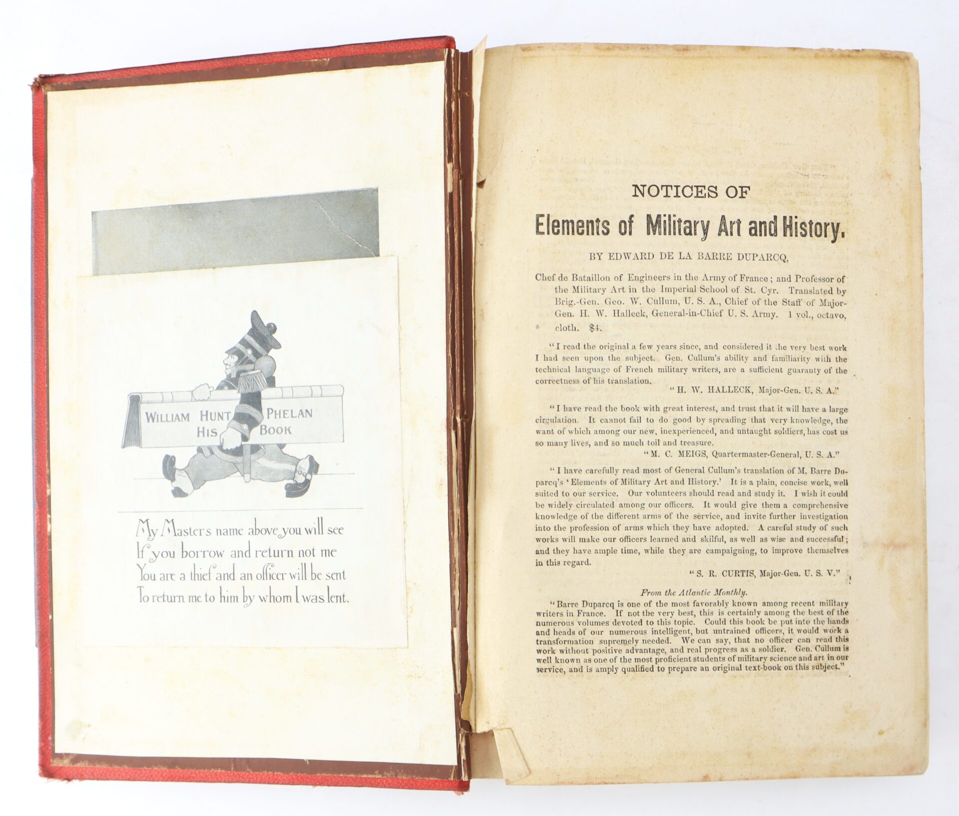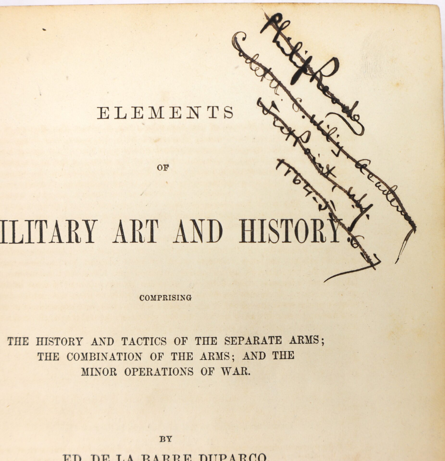 A significant mid-19th century military text, Elements of Military Art and History by Edward de la Barre Duparcq, translated for American use by Brig. Gen. George W. Cullum, U.S.A. This influential work was widely read among professional officers and cadets, offering instruction in tactics, combined arms operations, and the theory of warfare at a time when the United States Army was preparing—knowingly or not—for the coming conflict of the 1860s.
