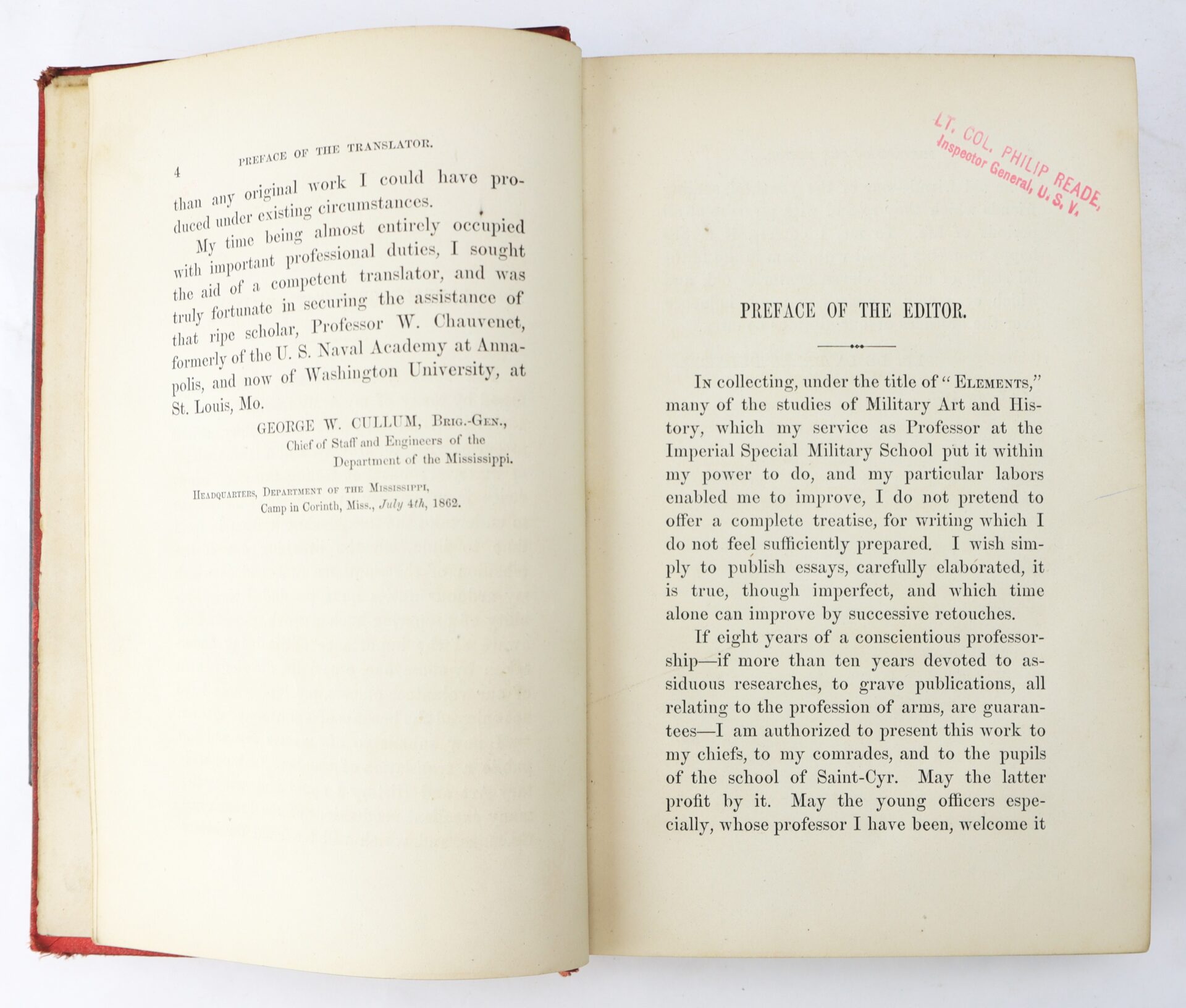 Of particular note is the clear ownership stamp of Lt. Col. Philip Reade, Inspector General, U.S.V., a documented Union officer who served with distinction during the Civil War. Reade saw service in multiple campaigns and his association adds meaningful historical interest and potential for further research. Also present is an earlier decorative bookplate, suggesting prior ownership before its wartime use.