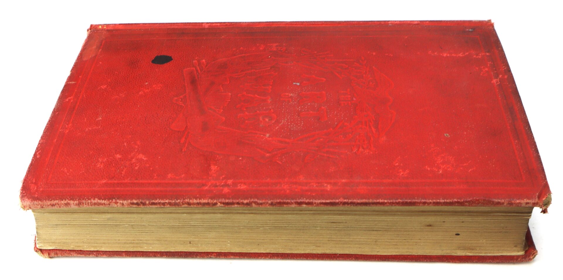 Bound in its original red publisher’s cloth with decorative blind-stamped cover and gilt spine titling, the volume presents with expected wear, including fraying at the head and foot of the spine and general handling marks to the boards. The binding remains intact. Internally, the book shows typical age toning and scattered foxing, with a few condition issues including a loose front hinge and period repairs.