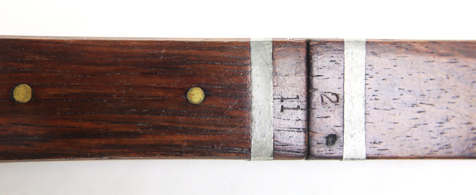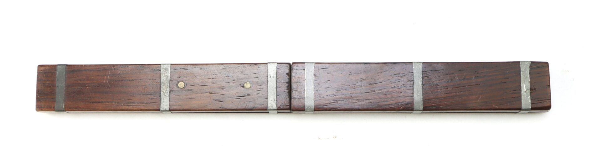 The knife retains a strong, honest surface with a smooth, untouched patina, the spine crisply stamped and fully legible. The handle is fashioned of hardwood, attractively inlaid with pewter bands—both decorative and functional—providing reinforcement and a distinctive early aesthetic. The construction remains tight and well-preserved, with pleasing age throughout.