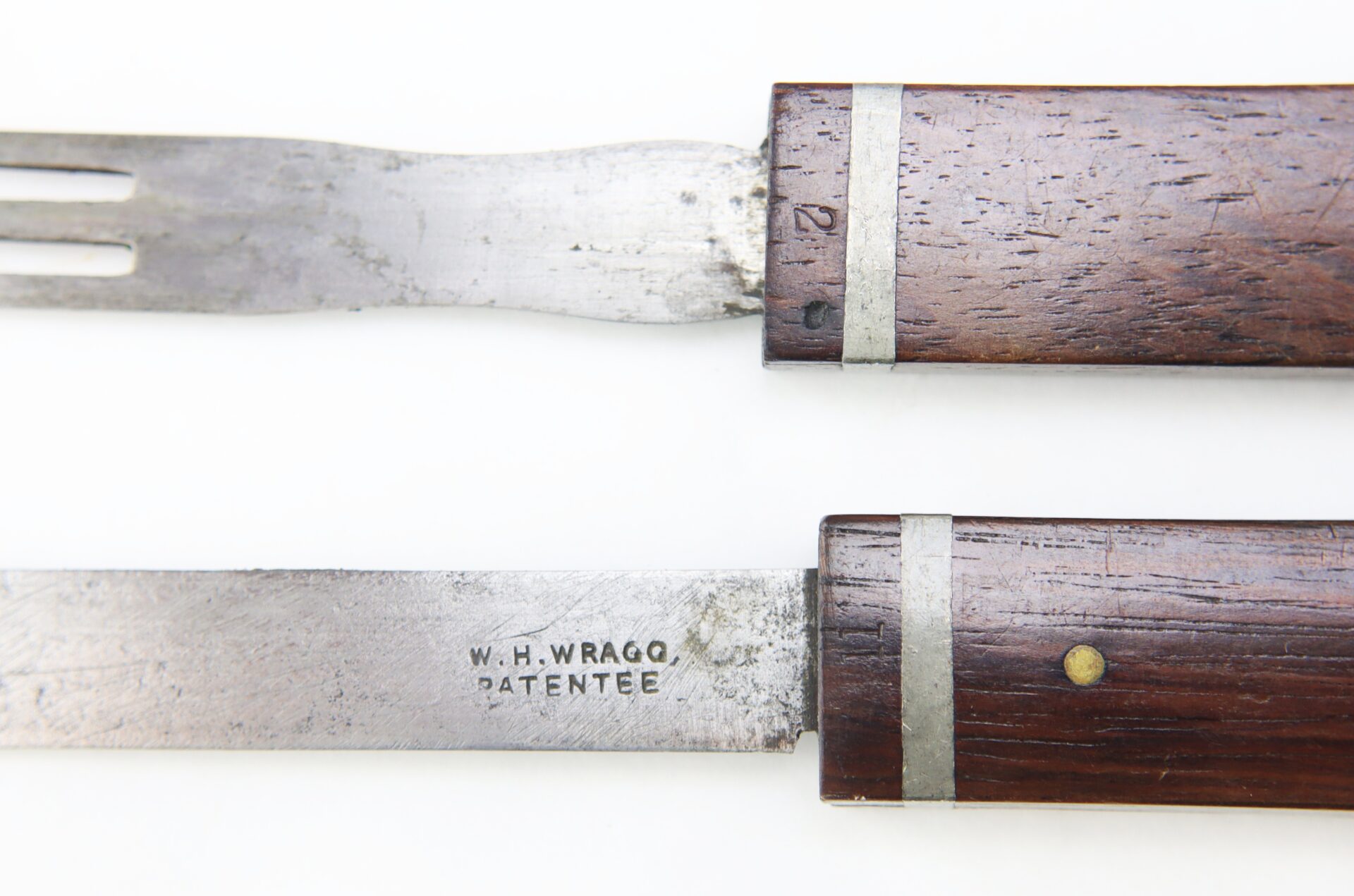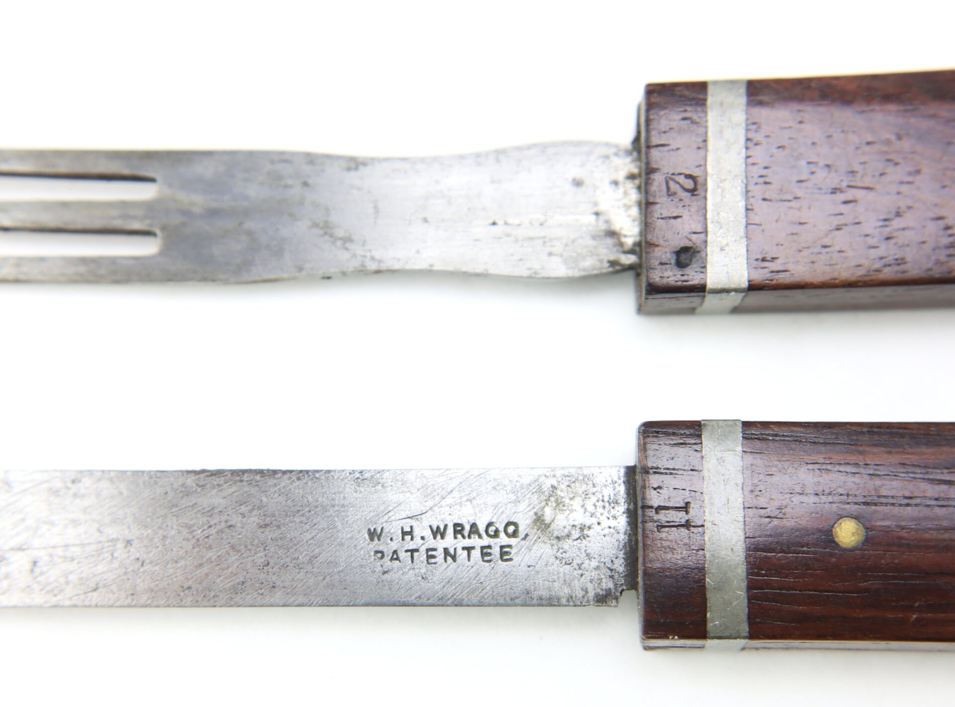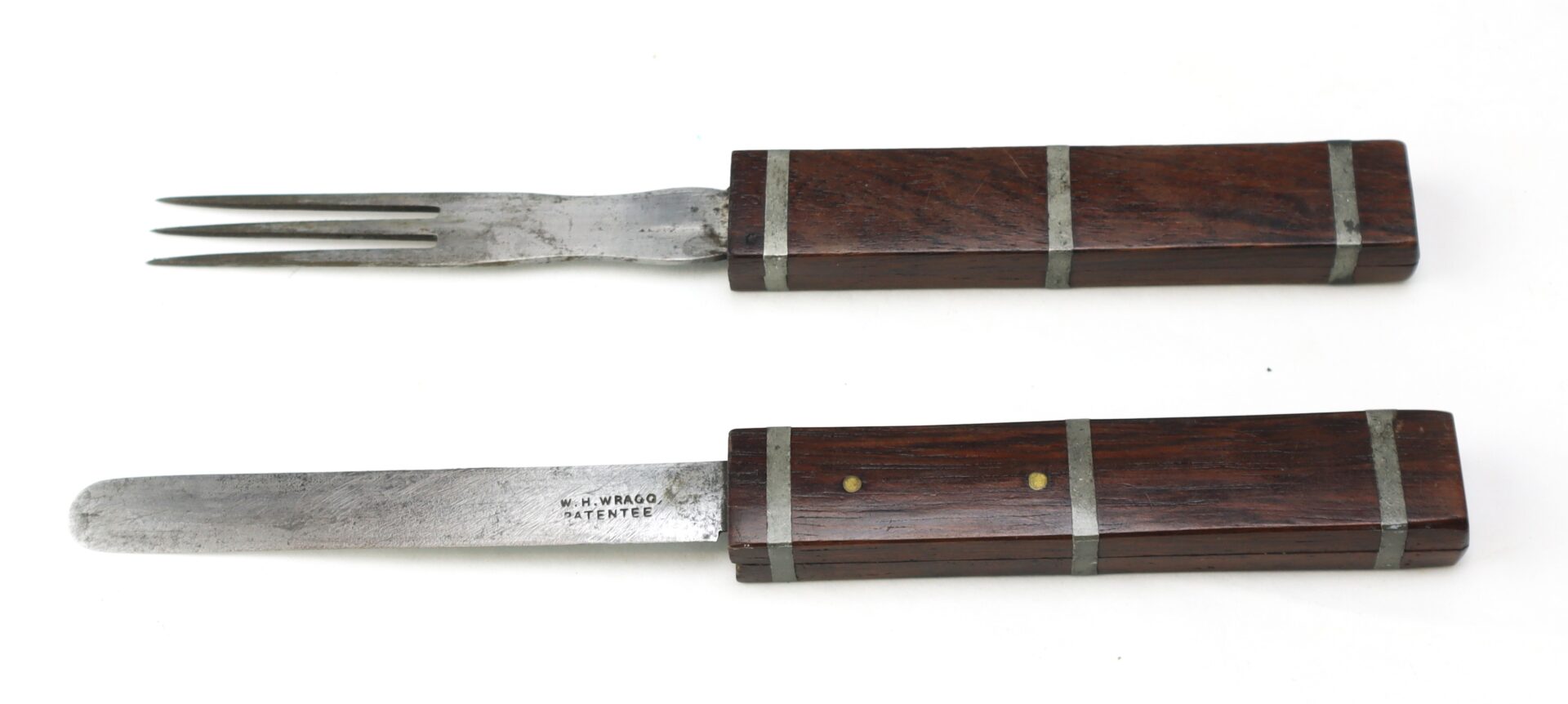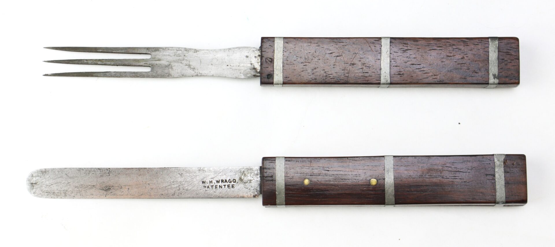 A scarce and early example of the ingenious folding traveling knife and fork combination, bearing the desirable “W.H. WRAGG – PATENTEE” marking, indicating production prior to or at the time of patent issuance. These compact eating implements were designed for portability and saw practical use during the Civil War, commonly carried by officers and soldiers in the field who required personal mess equipment beyond standard issue.