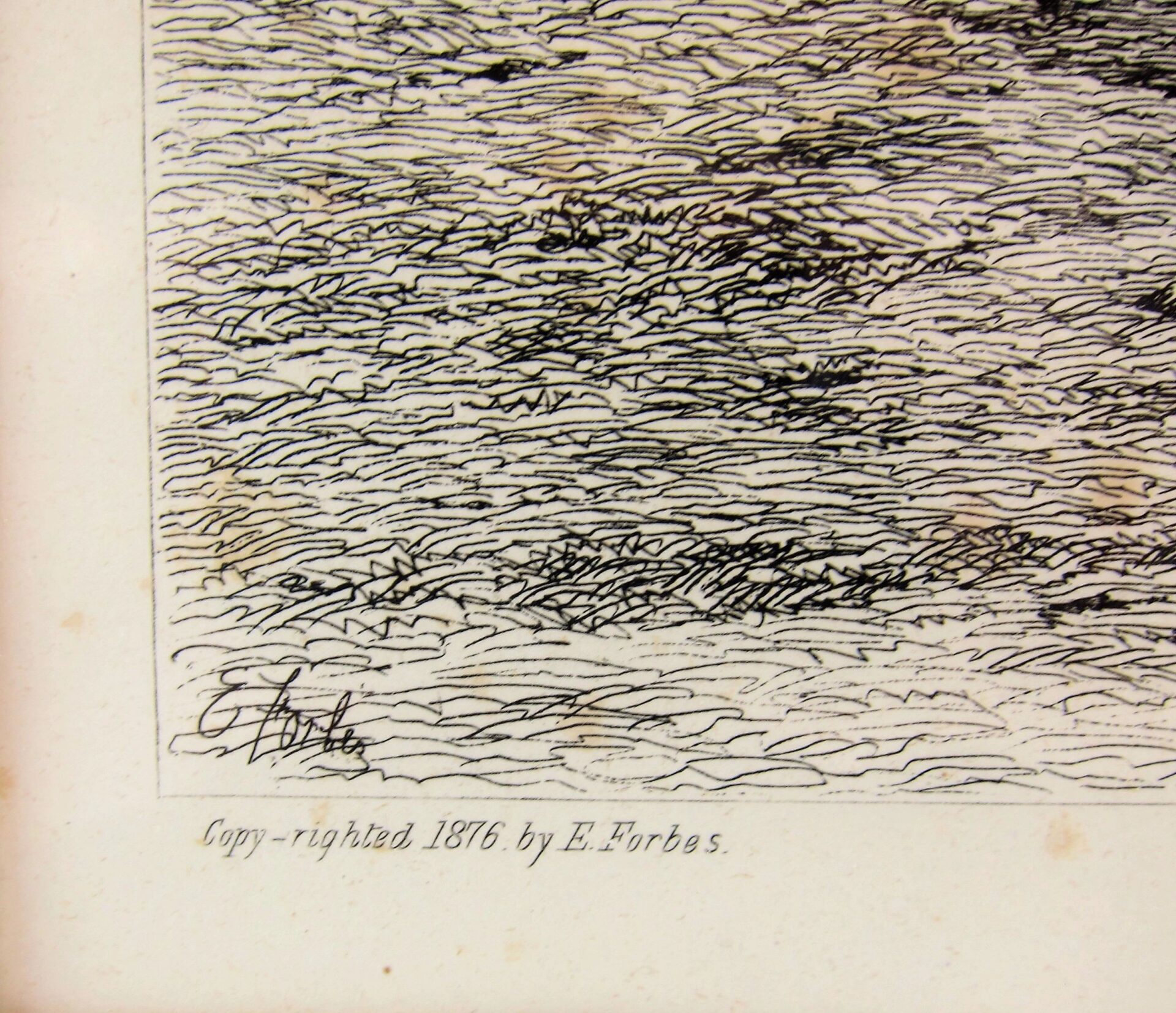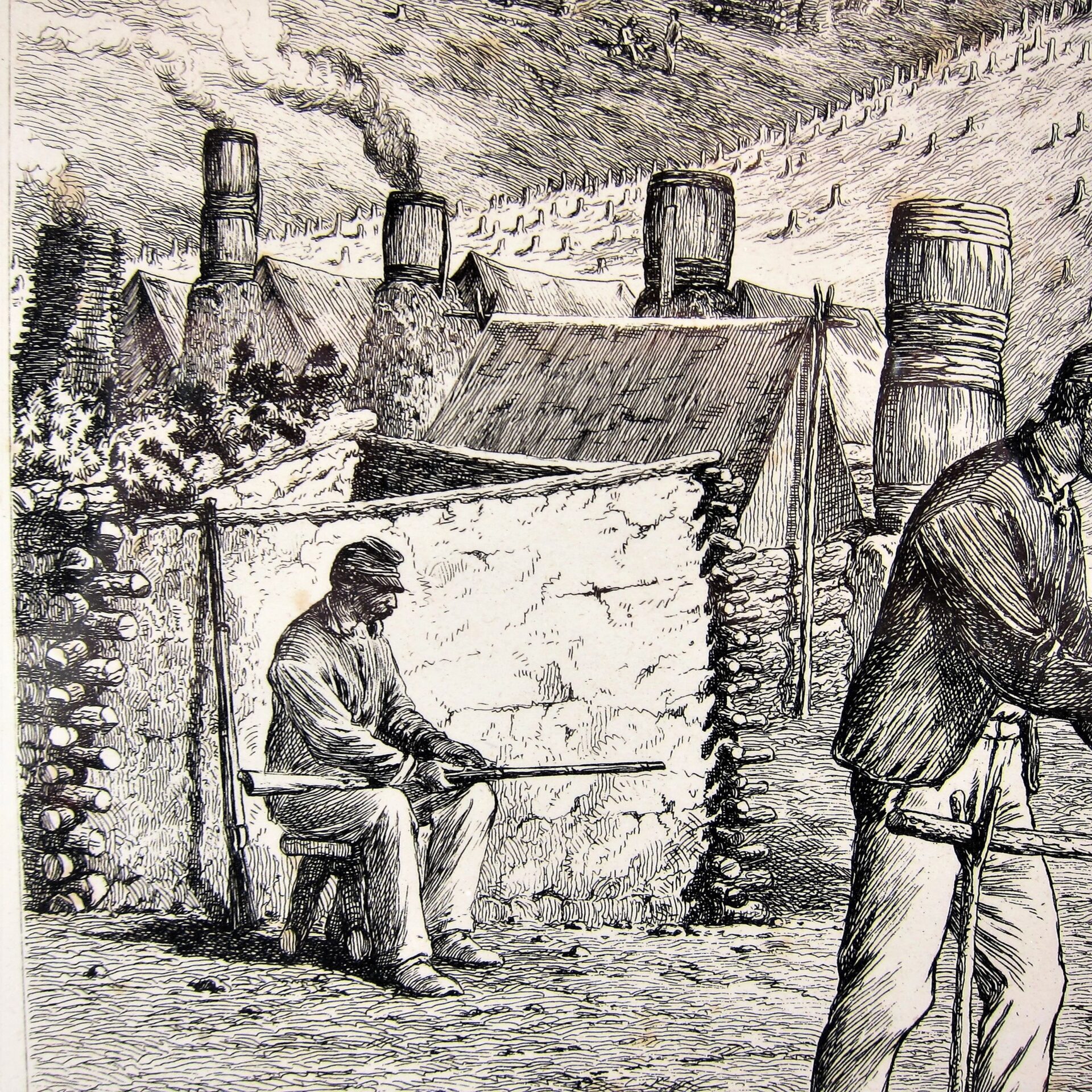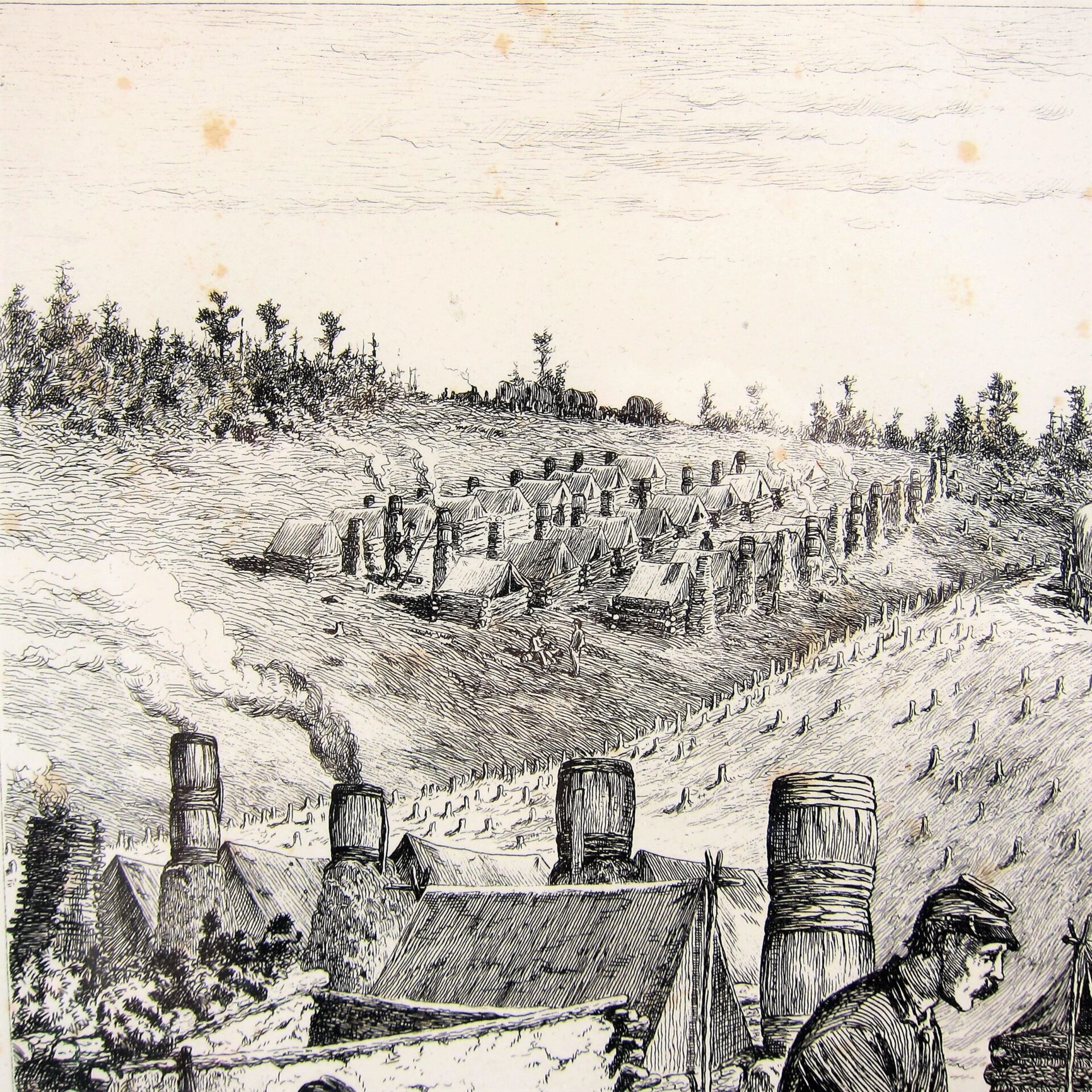 This unframed print measures 24″ x 19″ is titled “Fall In For Soup” and is Plate No. 20 out of 40. It is signed in the lower left corner, “E. Forbes.” In excellent condition this is an original engraving from his portfolio. The scene depicted shows a winter camp, giving a general idea of the style of huts built and occupied by the troops. A wagon train is coming down the road from the distant camp on its way to the depot for forage. Edwin Forbes (1839-1895) was an American landscape painter and etcher, best known for his Life Studies of the Great Army. He was born in New York City to Joseph C. and Ann Forbes. At the age of eighteen he began his study of art and by the age of twenty became a pupil of Arthur F. Tait. His early work involved painting animals, but he later expanded to genre scenes and landscapes. In 1861 he was hired as a staff artist for Frank Leslie’s Illustrated Newspaper where he covered the Army of the Potomac from 1862 to 1864. With his primary interest being that of recording the everyday activities of soldiers, Forbes would making quick sketches on the battlefield and later refine them with great detail. The sketches were sent back to New York where copper plate etchings were made from the detailed drawings. His drawings were published in Leslie’s newspaper and in 1876, Forbes made etchings of his own illustrations and published them in portfolio form on better quality paper as Life Studies of the Great Army: A Historical Artwork in Copper Plate Etching Containing Forty Plates. His work, considered to be the finest drawings of the Civil War, is now preserved in the War Office at Washington D.C. because of the historic significance and value. Less than 200 of these superb large size etchings were ever made. His Life Studies of the Great Army would go on to receive an award at the Centennial Exposition in Philadelphia. After his death the Library of Congress acquired Forbes originals through a gift of John Pierpont Morgan in 1919. They included about 300 drawings as well as forty-three etched plates and the original impressions used in Life Studies of the Great Army.