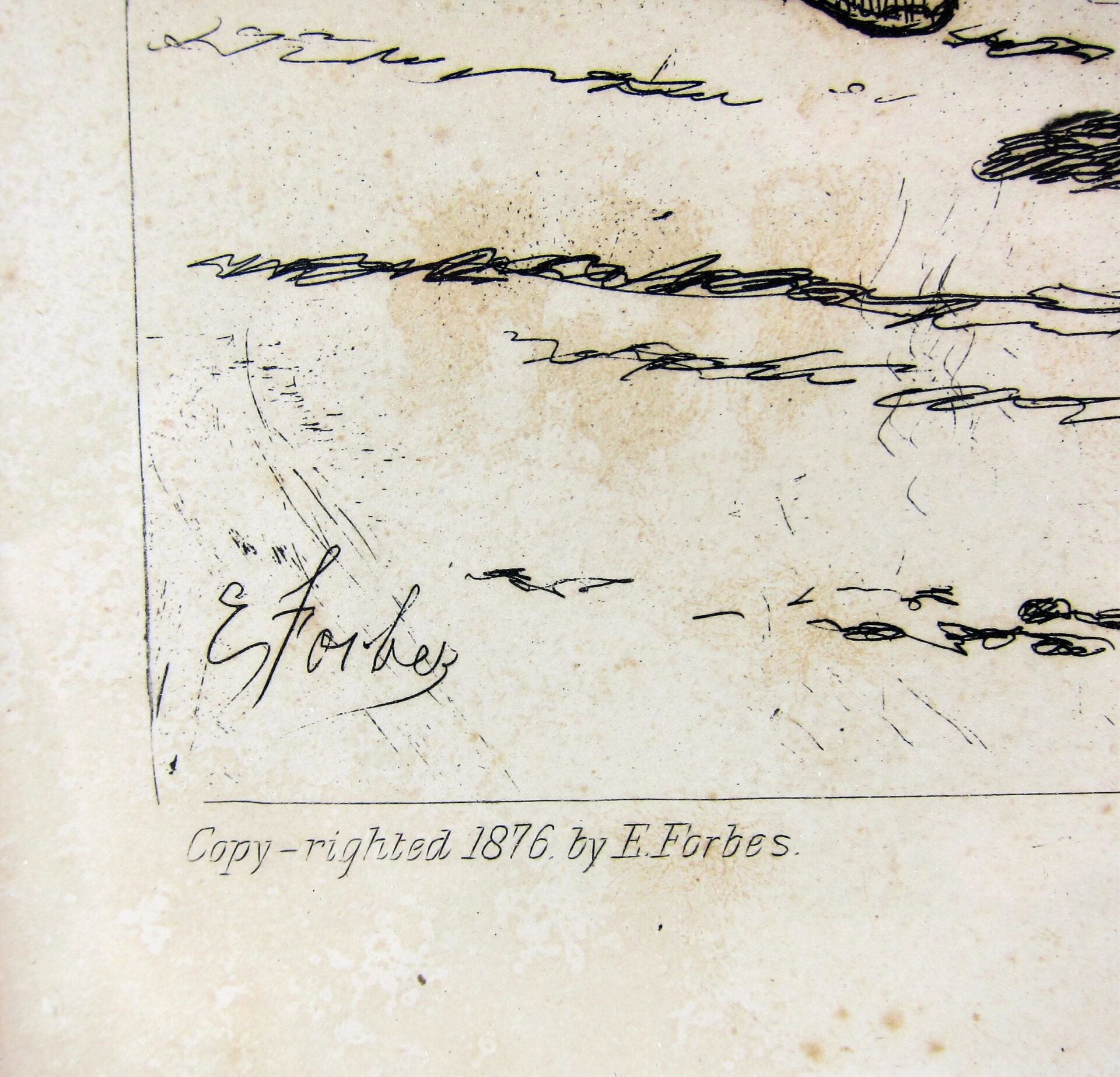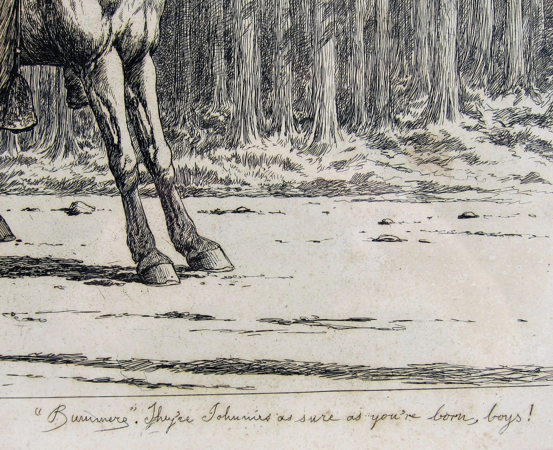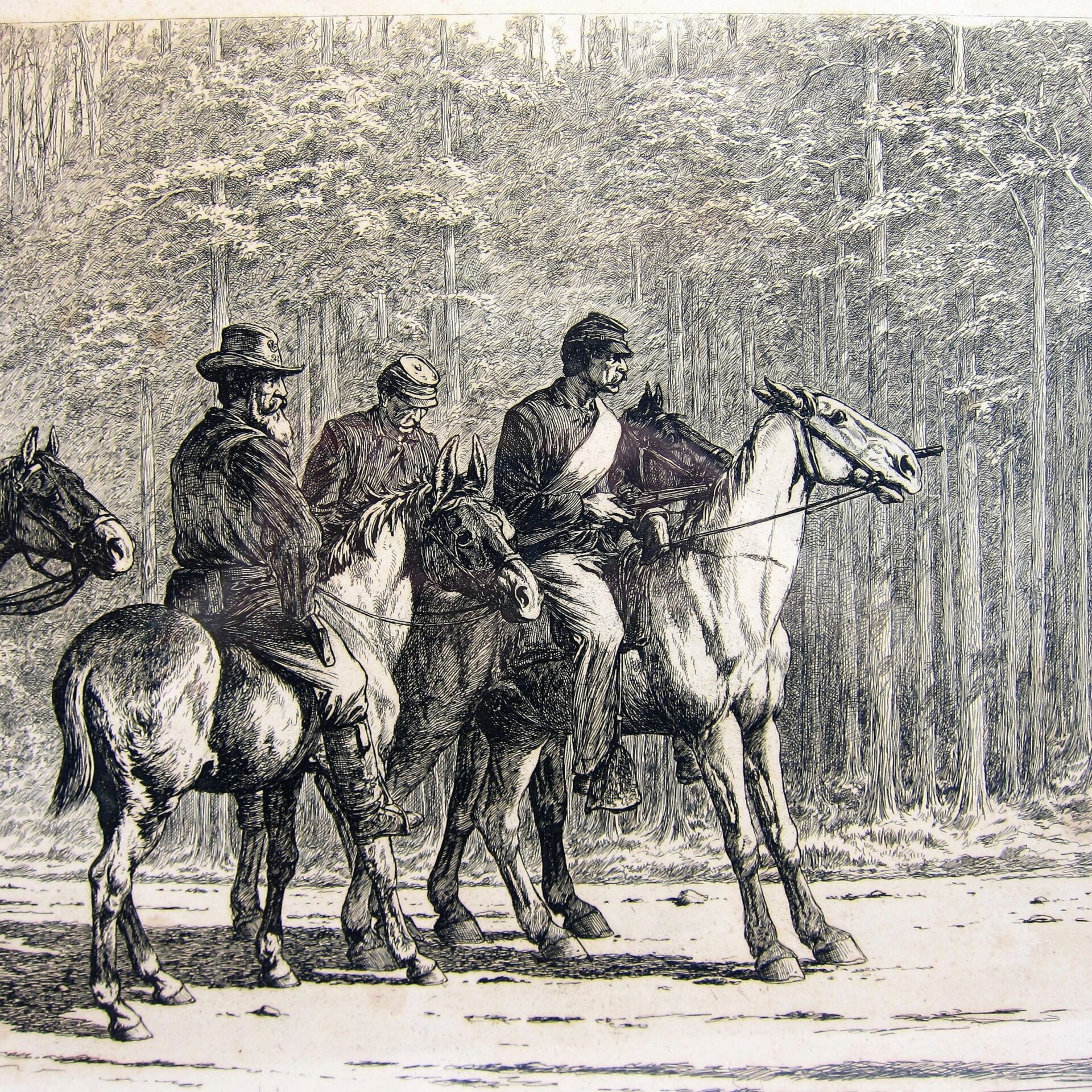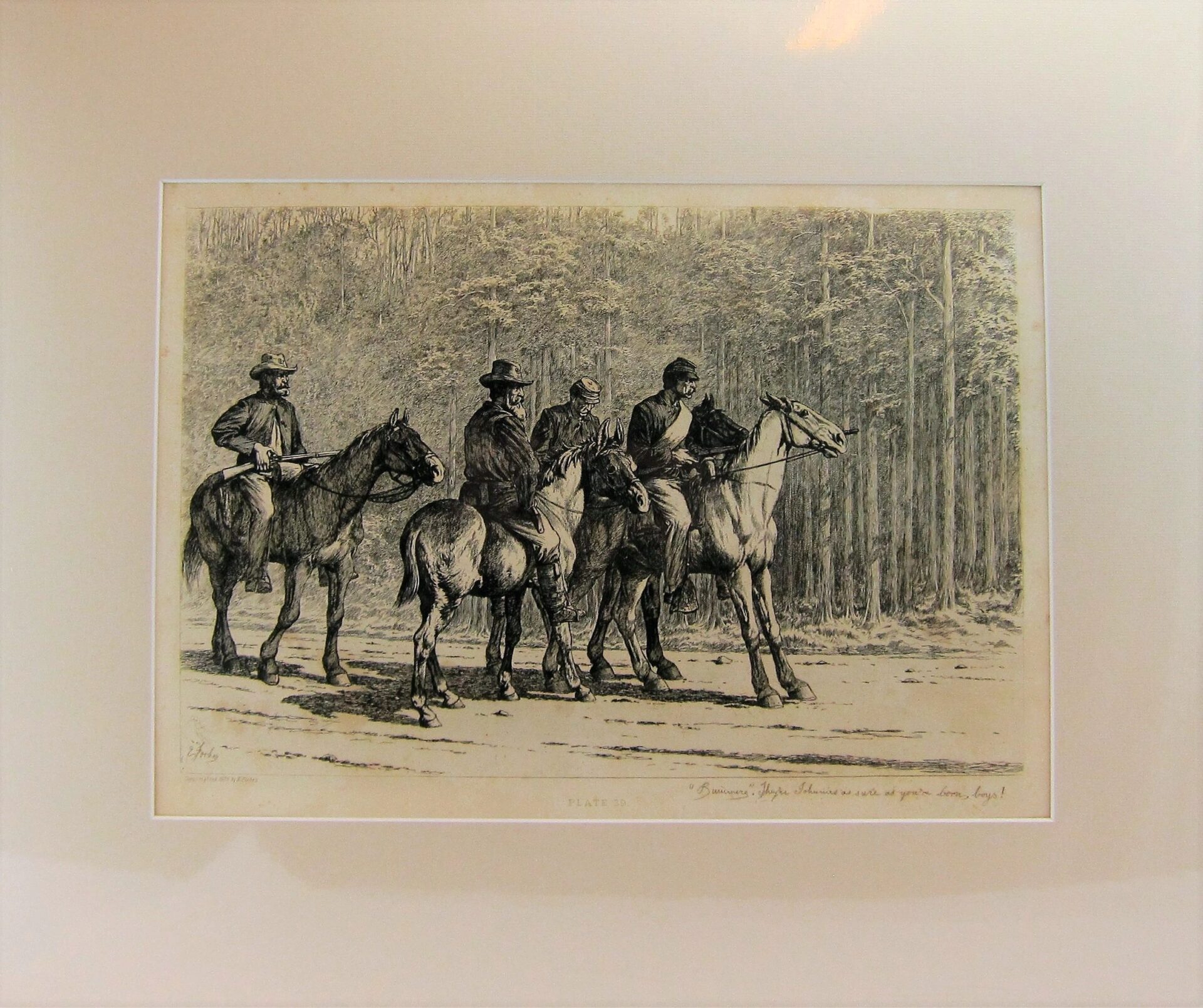 Edwin Forbes Plate No. 39 – This unframed print measures 24″ x 19″ is titled “Bummers” and is Plate No. 39 out of 40. It is signed in the lower left corner, “E. Forbes.” In excellent condition this is an original engraving from his portfolio.“They’re ‘Johnnies,’ boys, as sure as you’re born.” A group of bummers on horse and muleback, huddled in the road, anxiously watching a body of men who have just appeared at a turn in the road. Edwin Forbes (1839-1895) was an American landscape painter and etcher, best known for his Life Studies of the Great Army. He was born in New York City to Joseph C. and Ann Forbes. At the age of eighteen he began his study of art and by the age of twenty became a pupil of Arthur F. Tait. His early work involved painting animals but he later expanded to genre scenes and landscapes. In 1861 he was hired as a staff artist for Frank Leslie’s Illustrated Newspaper where he covered the Army of the Potomac from 1862 to 1864. With his primary interest being that of recording the everyday activities of soldiers, Forbes would making quick sketches on the battlefield and later refine them with great detail. The sketches were sent back to New York where copper plate etchings were made from the detailed drawings. His drawings were published in Leslie’s newspaper and in 1876, Forbes made etchings of his own illustrations and published them in portfolio form on better quality paper as Life Studies of the Great Army: A Historical Art Work in Copper Plate Etching Containing Forty Plates. His work, considered to be the finest drawings of the Civil War, is now preserved in the War Office at Washington D.C. because of the historic significance and value. Less than 200 of these superb large size etchings were ever made. His Life Studies of the Great Army would go on to receive an award at the Centennial Exposition in Philadelphia. After his death the Library of Congress acquired Forbes originals through a gift of John Pierpont Morgan in 1919. They included about 300 drawings as well as forty-three etched plates and the original impressions used in Life Studies of the Great Army. Inventory Number: SCU 012 / SOLD