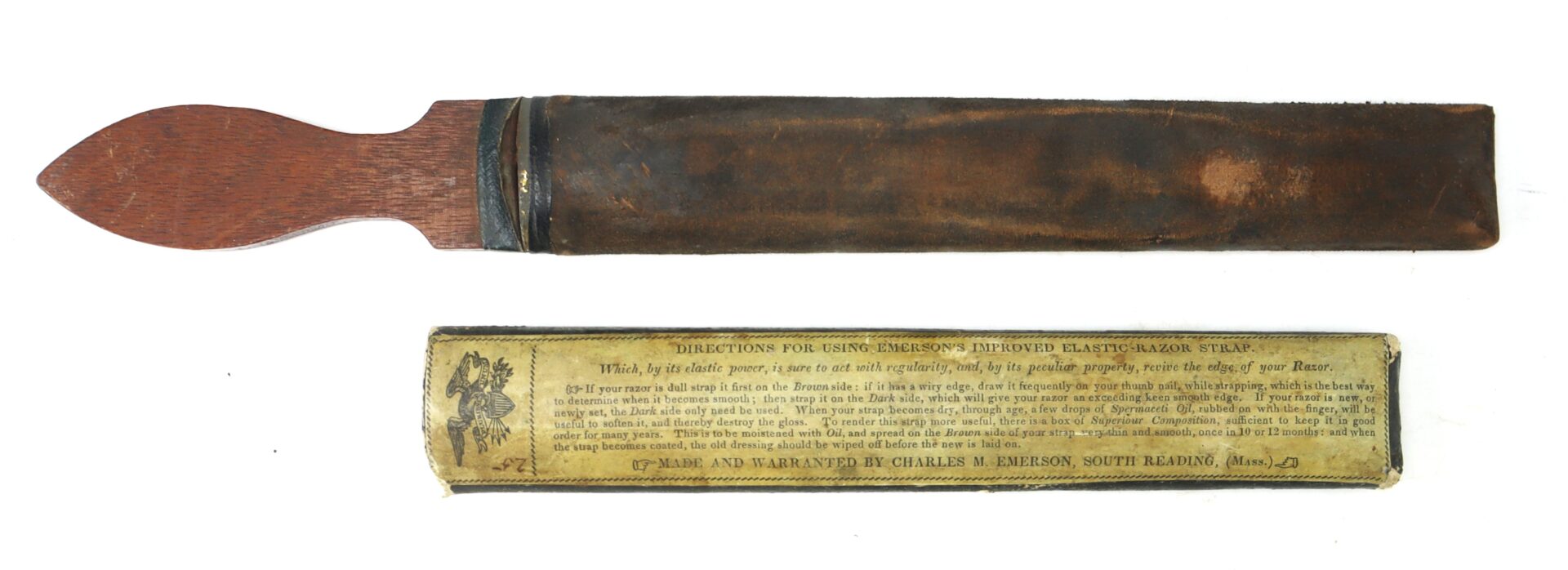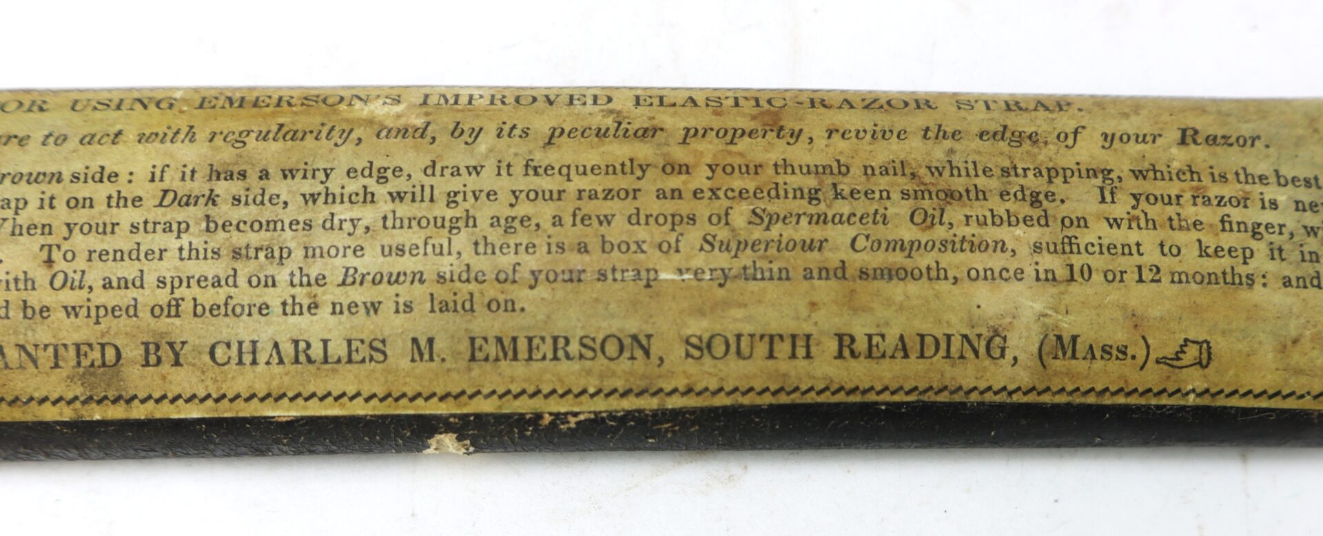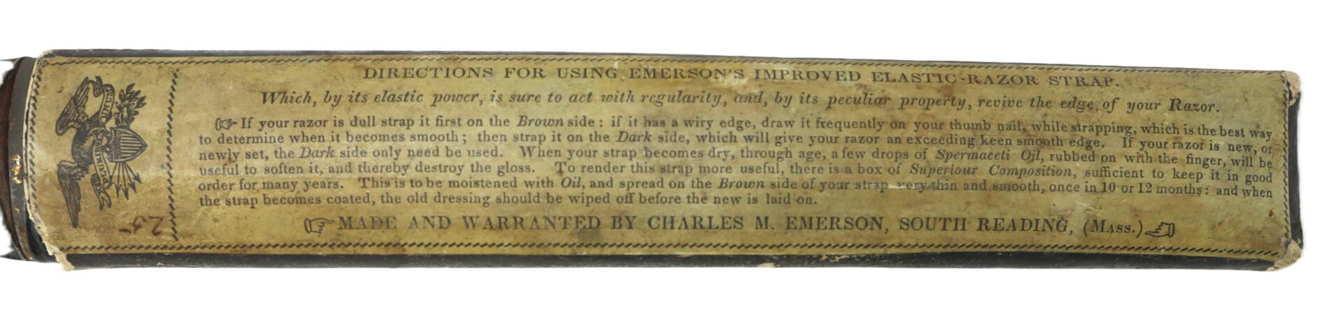 A scarce and highly desirable 19th-century razor strop, this example is Emerson’s Improved Elastic Razor Strap, manufactured and warranted by Charles M. Emerson of South Reading, Massachusetts.
