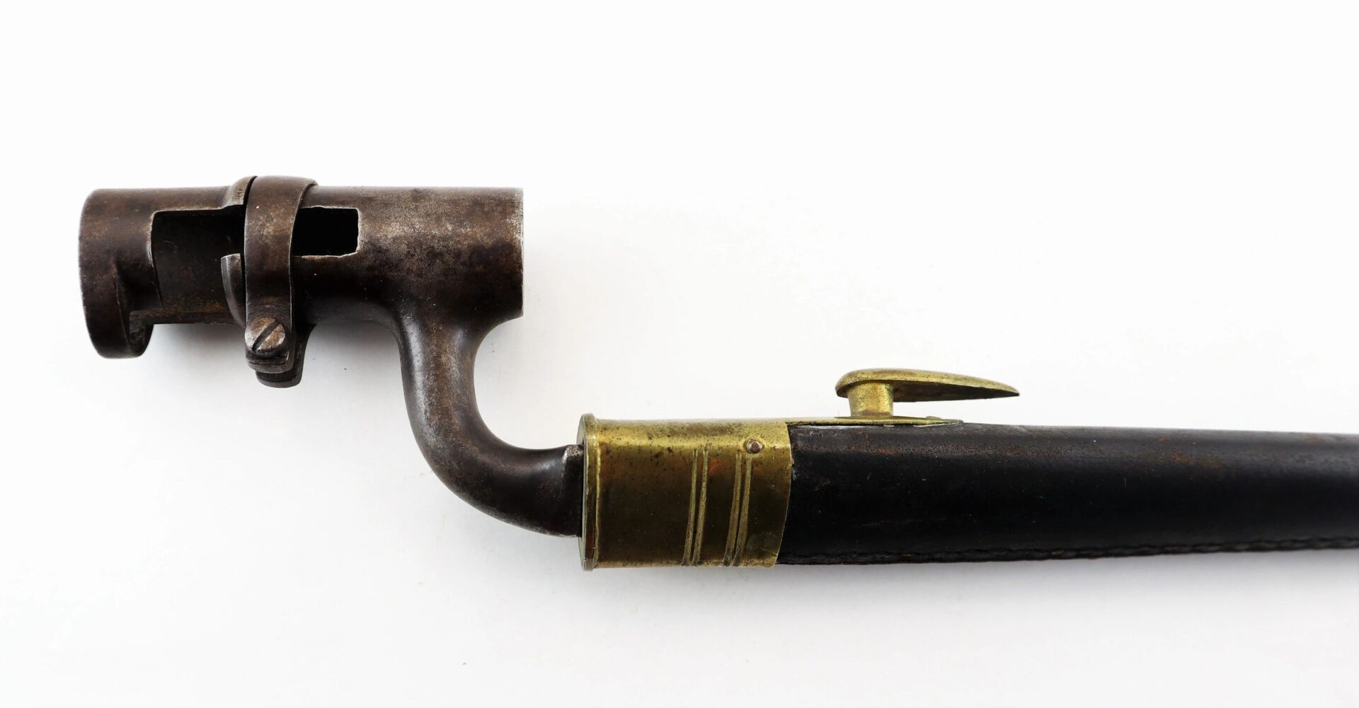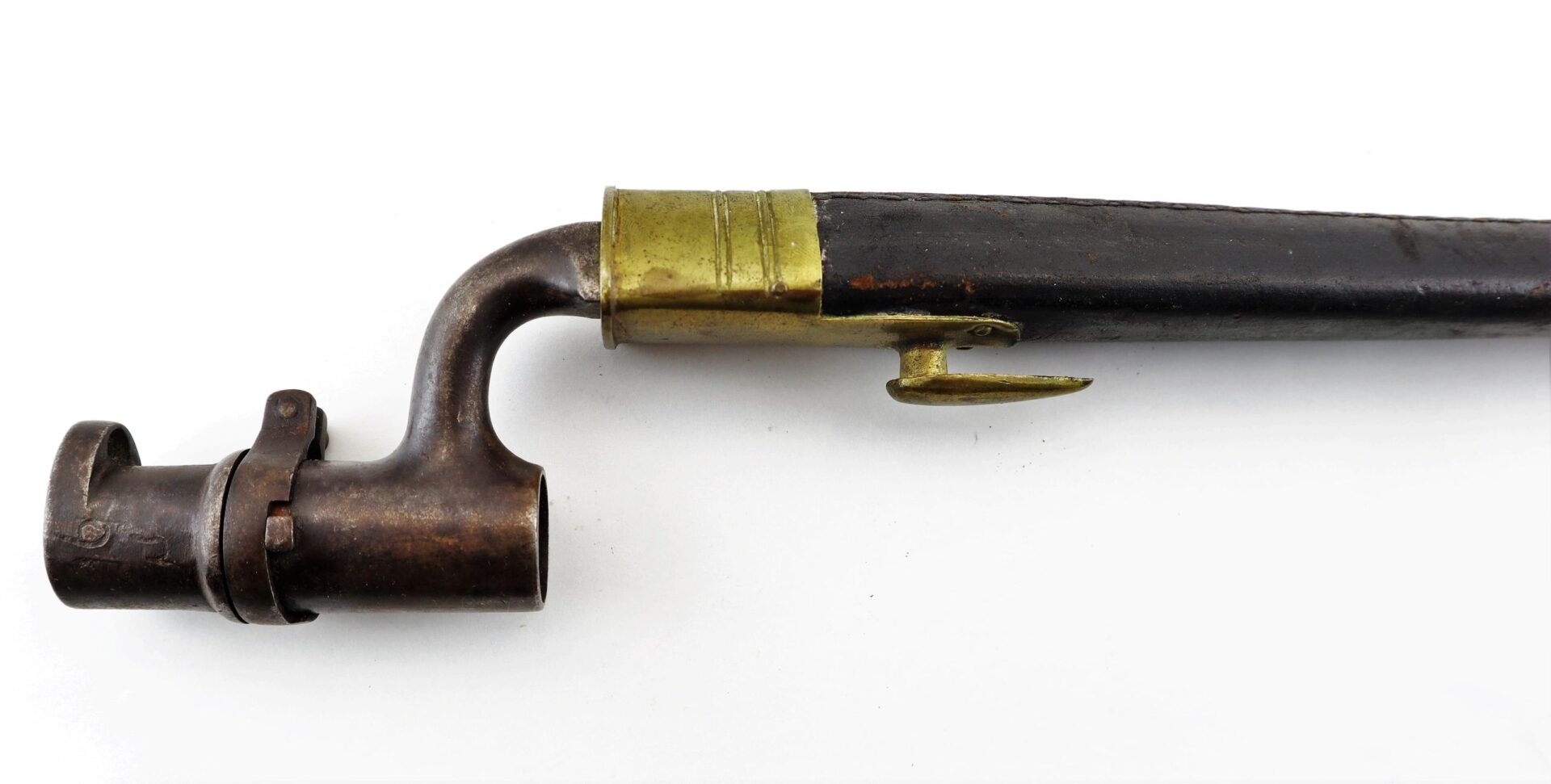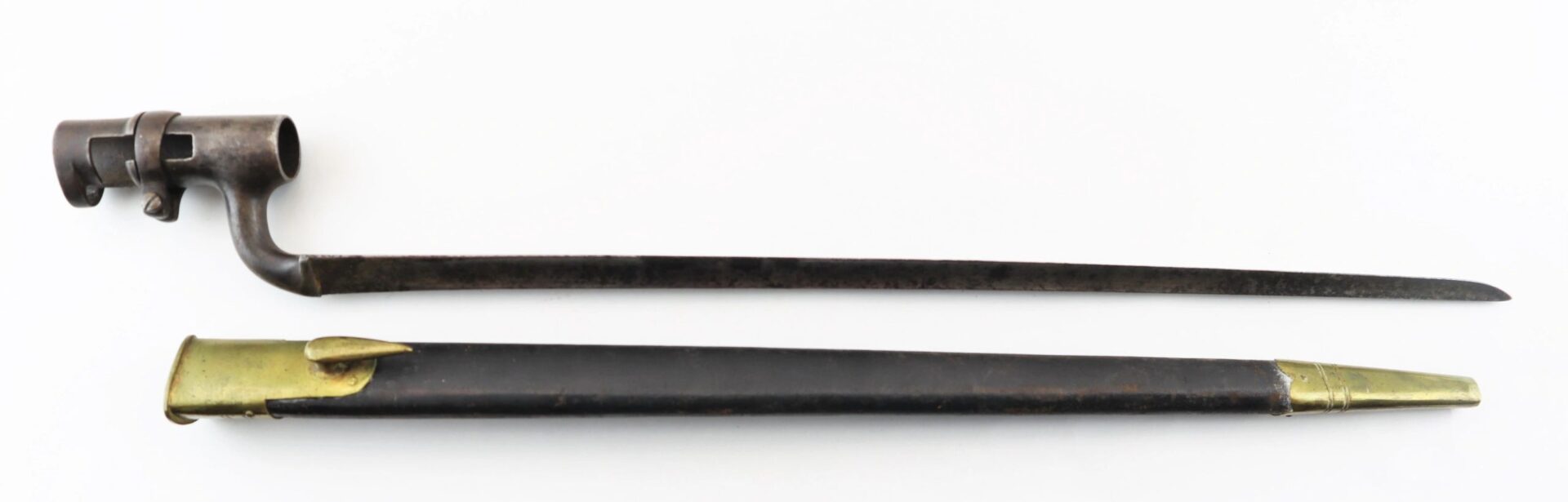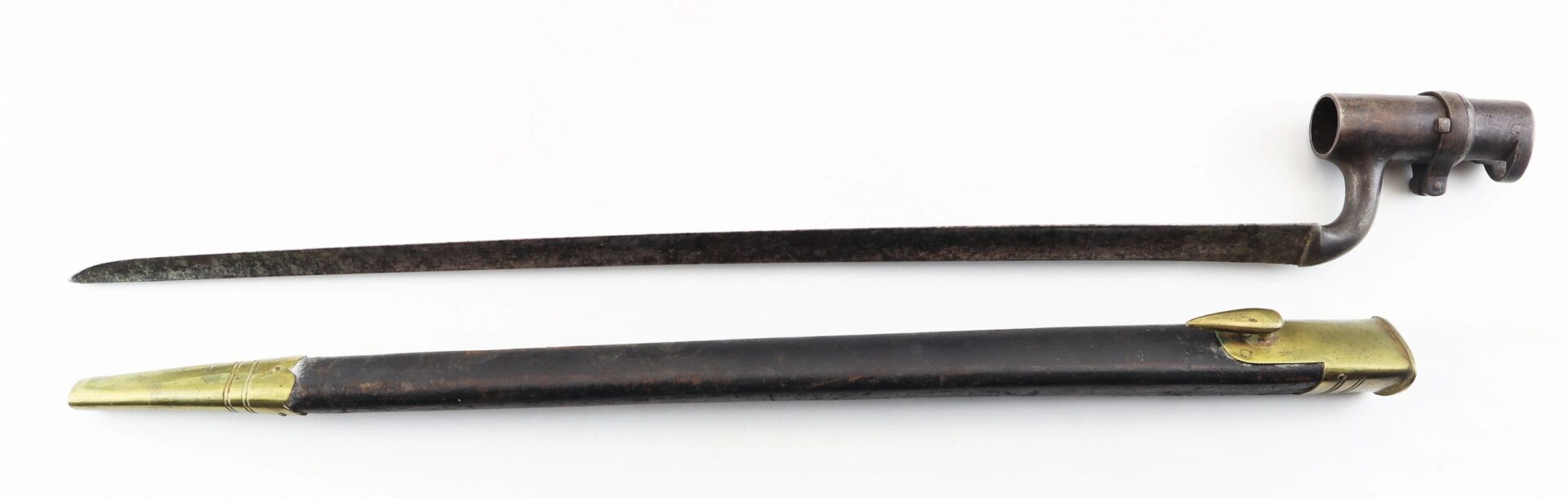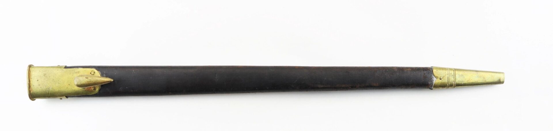 Enfield Bayonet and Scabbard – Inventory Number: BAY 171 Very good condition .original triangular socket bayonet with “Lawrence” marking at the base of the socket. Manufactured by the firm of Robins and Lawrence, these marked examples are scarce. The socket exhibits a nice plum brown even patina with no pitting on metal. The original leather scabbard is in exemplary condition with both brass mounts and stud device to mount frog. A wonderful example. Inventory Number: BAY 171
