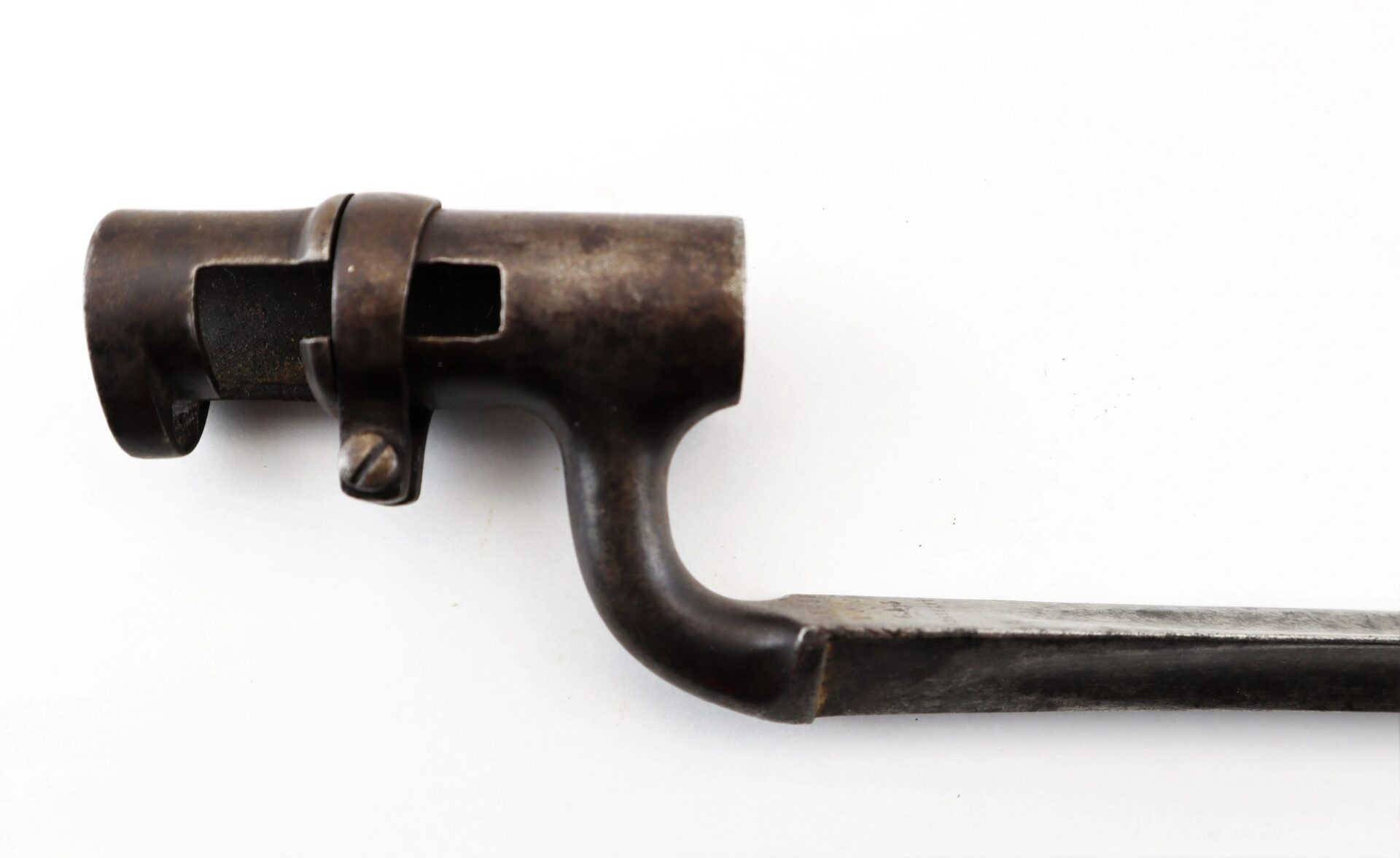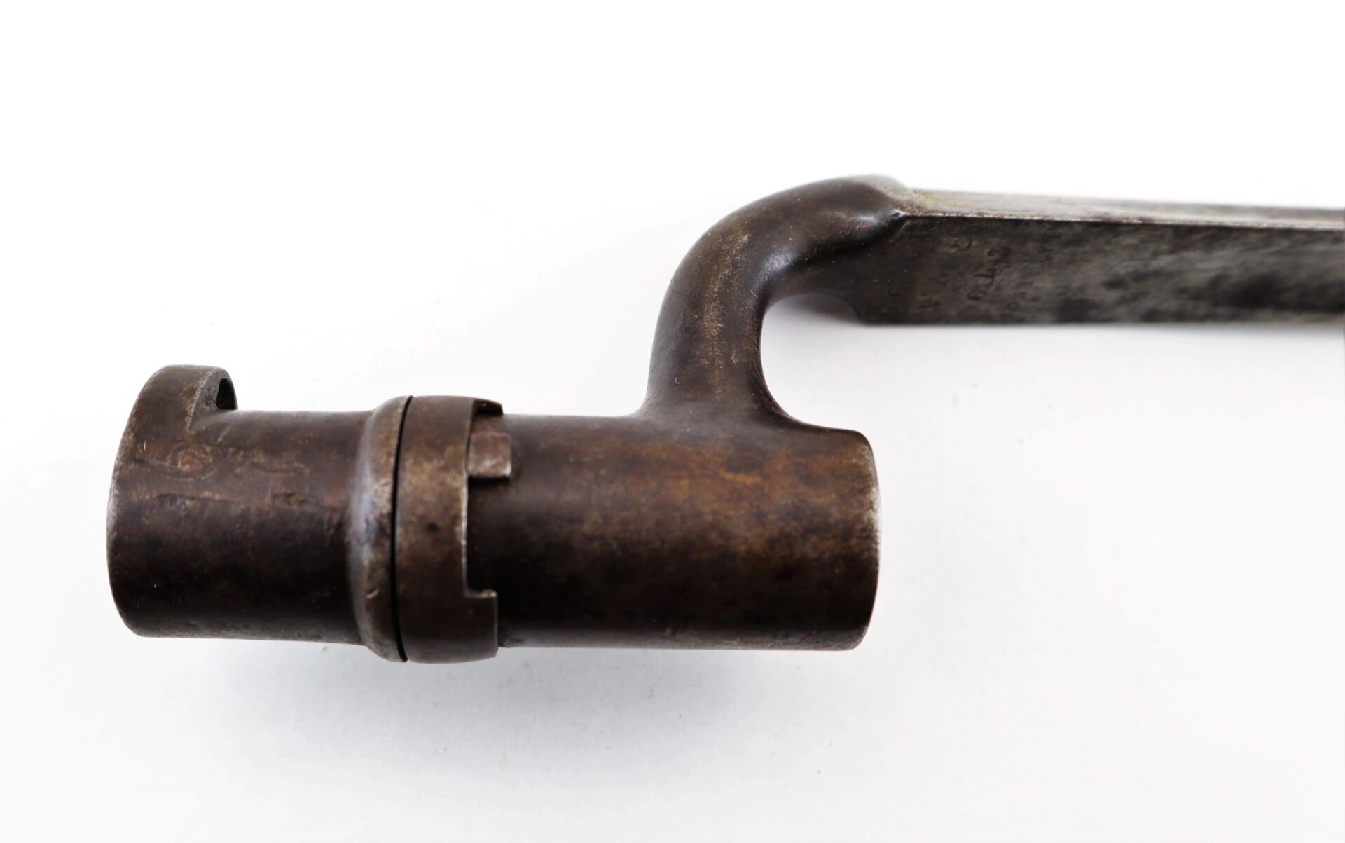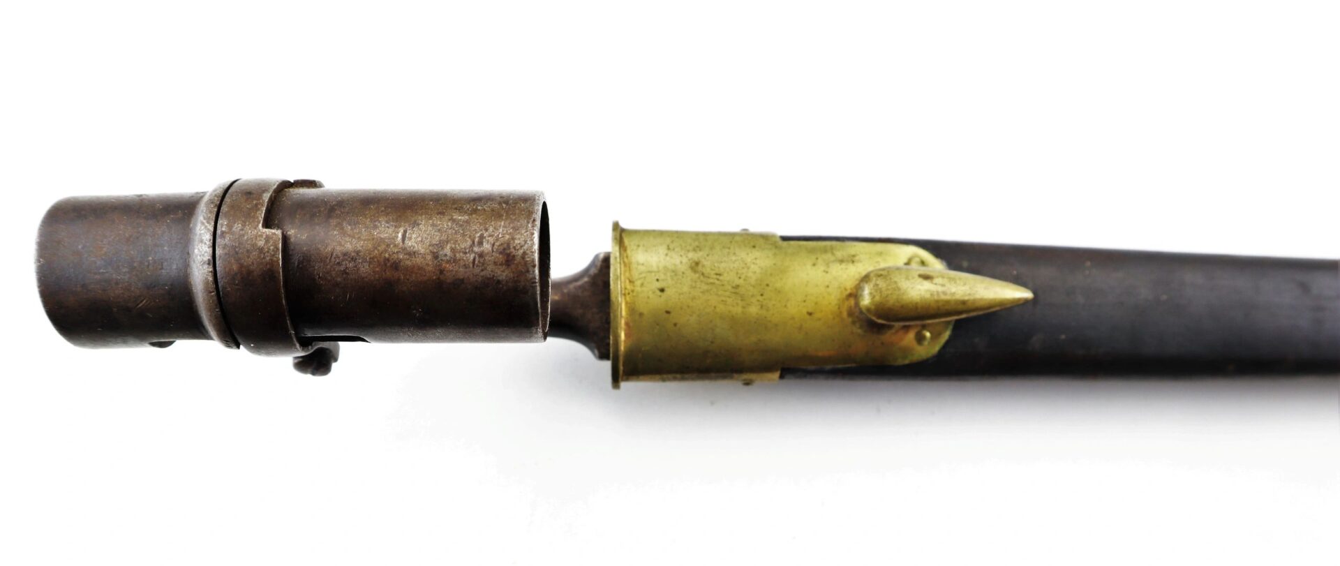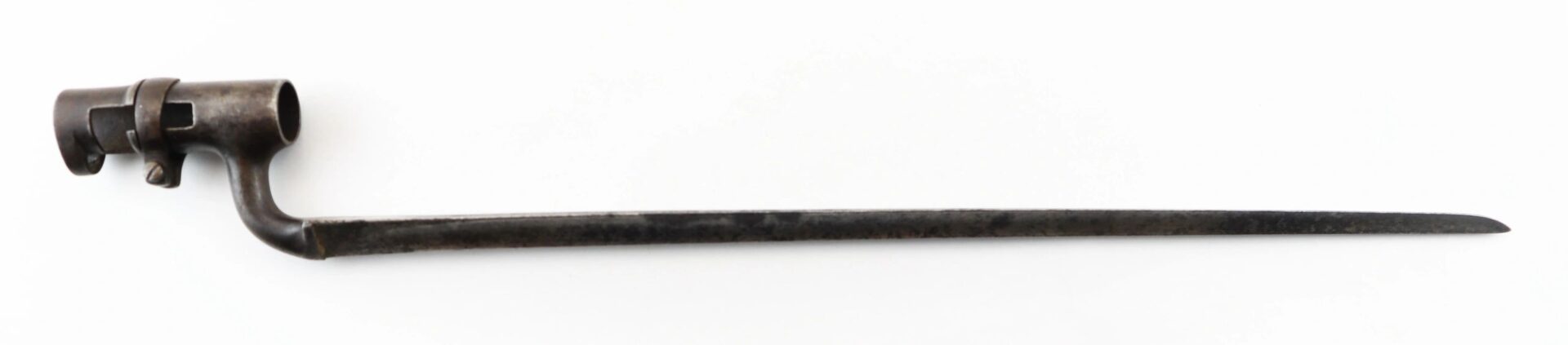 Enfield Bayonet and Scabbard – Inventory Number: BAY 171 Very good condition .original triangular socket bayonet with “Lawrence” marking at the base of the socket. Manufactured by the firm of Robins and Lawrence, these marked examples are scarce. The socket exhibits a nice plum brown even patina with no pitting on metal. The original leather scabbard is in exemplary condition with both brass mounts and stud device to mount frog. A wonderful example. Inventory Number: BAY 171