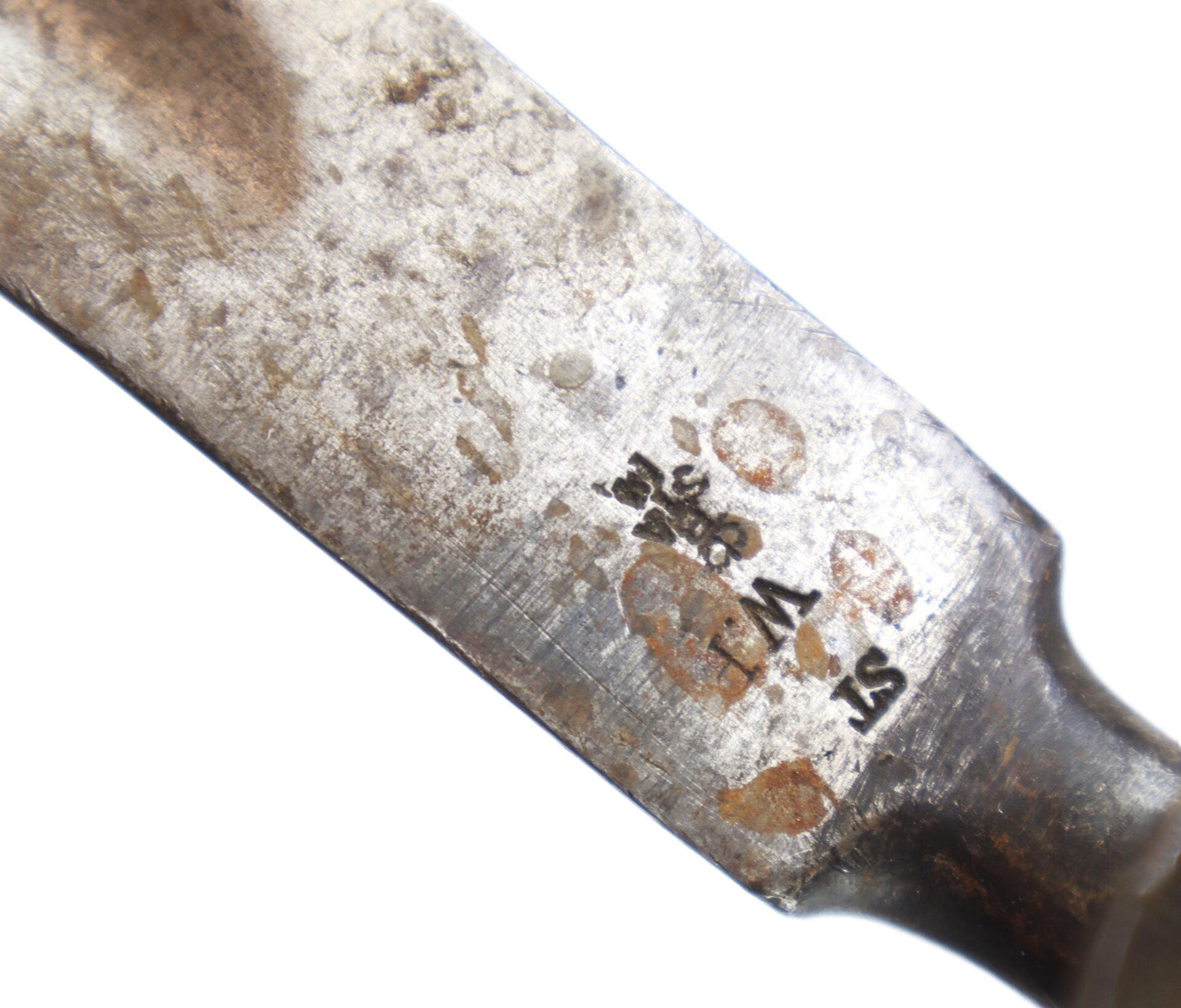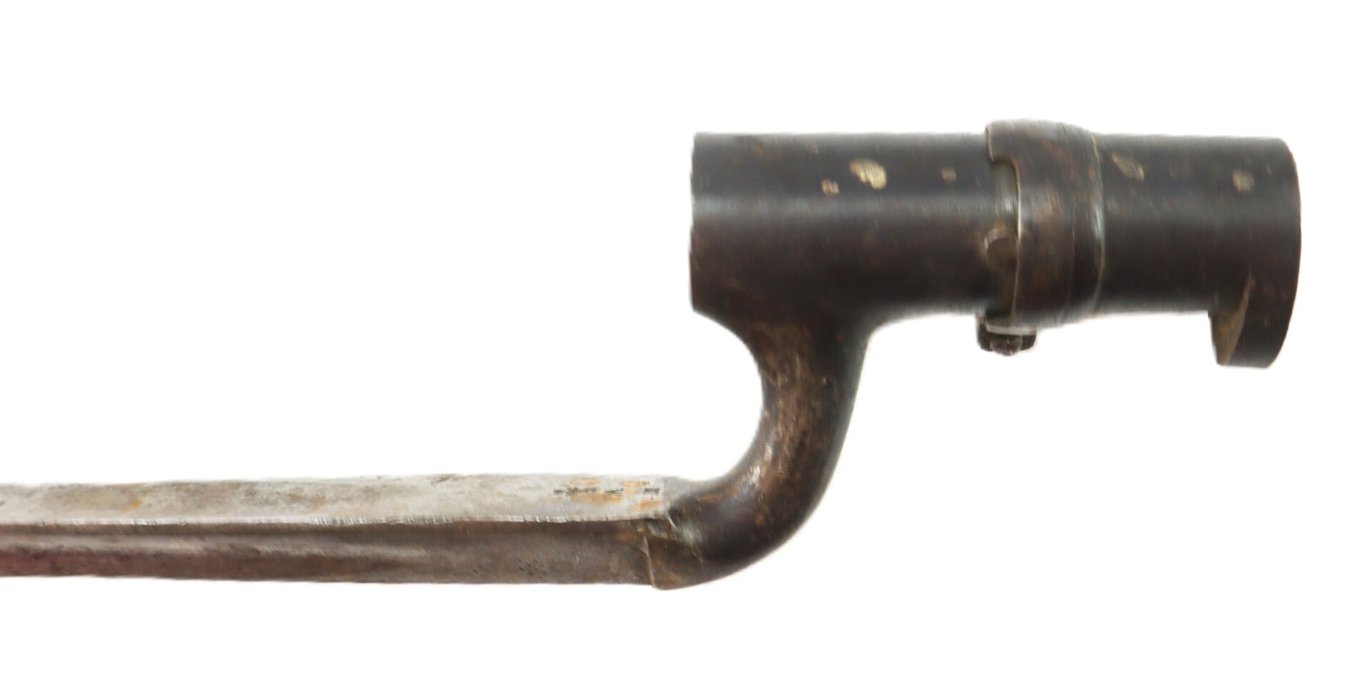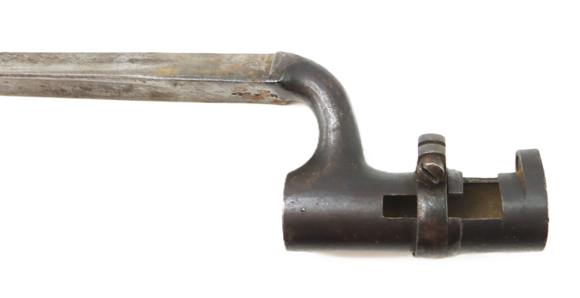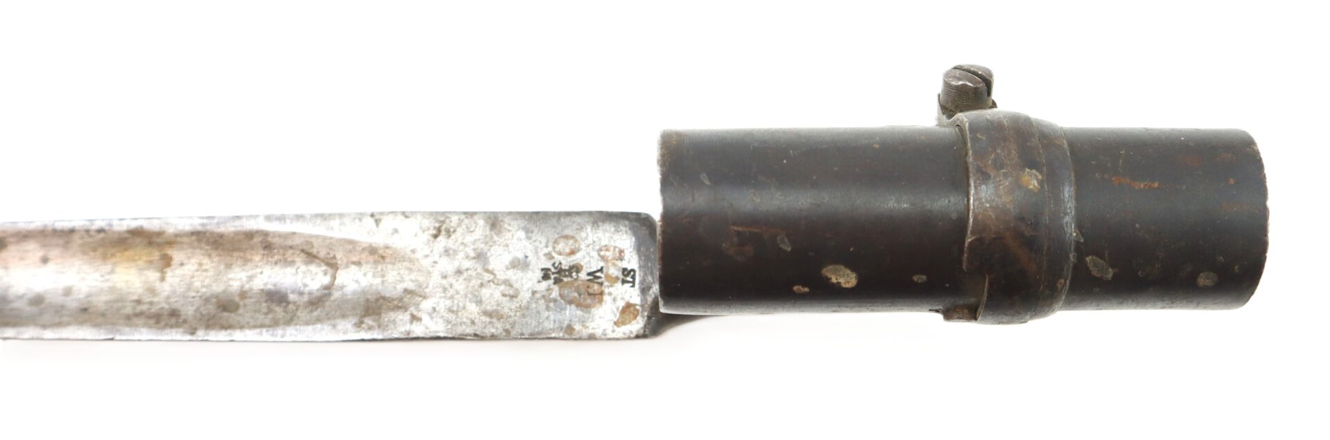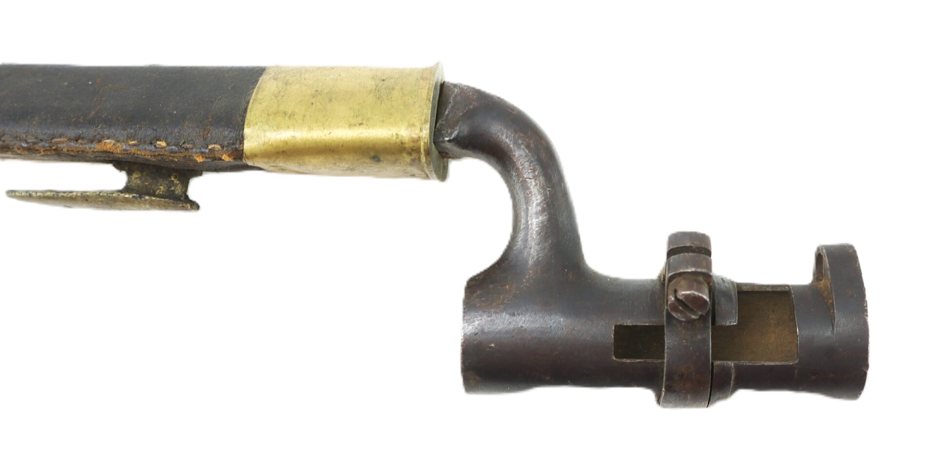 The triangular blade shows appropriate age and surface oxidation consistent with wartime manufacture and use. The socket retains its locking ring and sight slot, allowing secure mounting to the rifle’s muzzle. The scabbard remains intact and displays honest wear, with visible age to the leather and brass fittings.