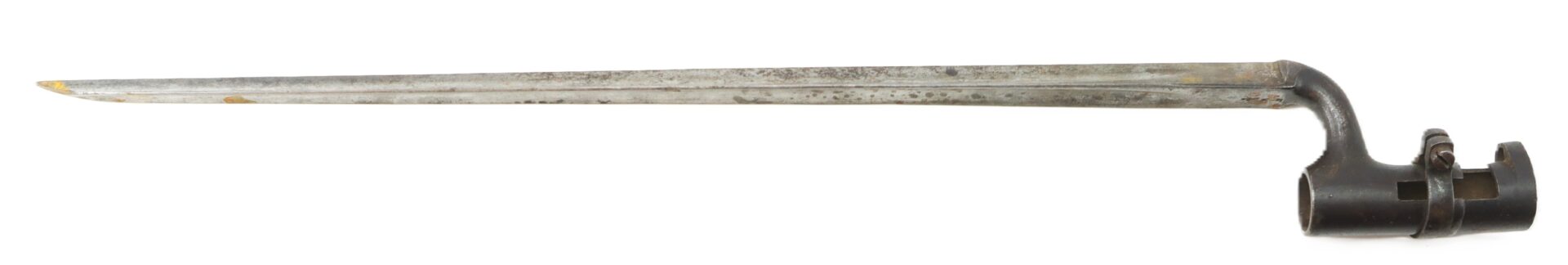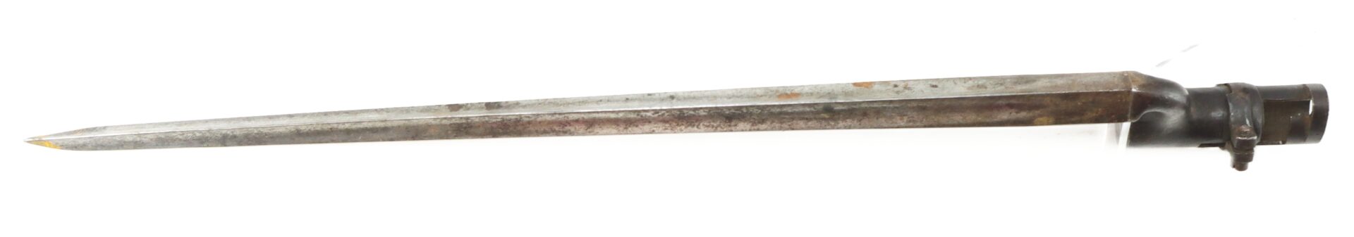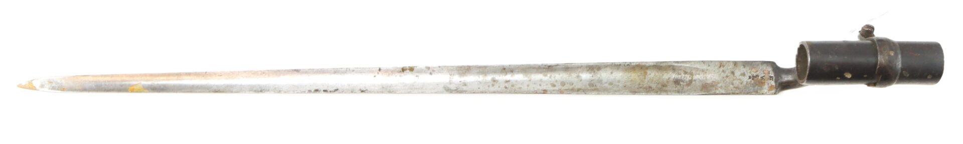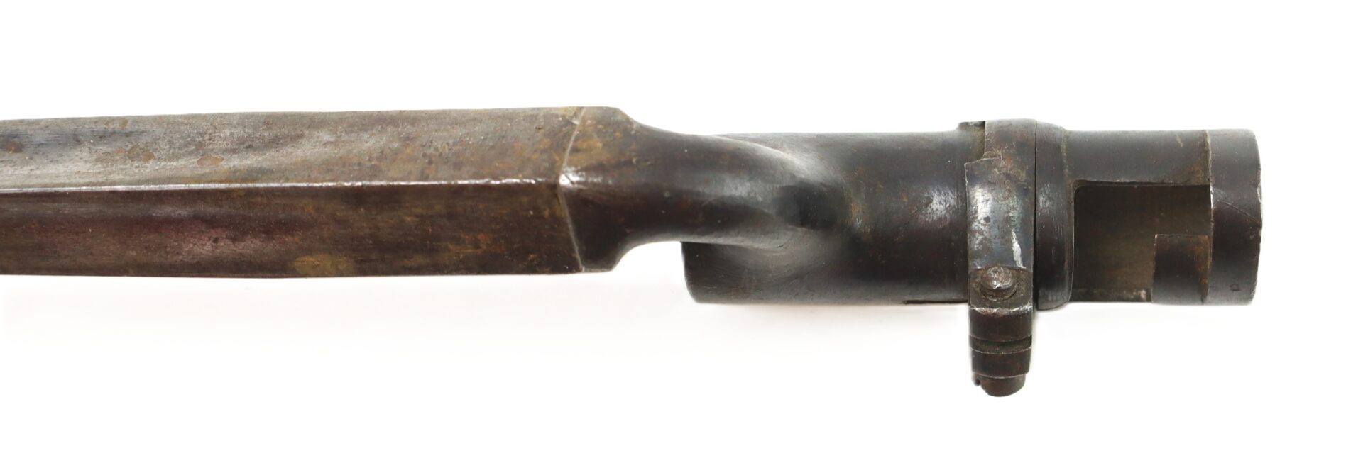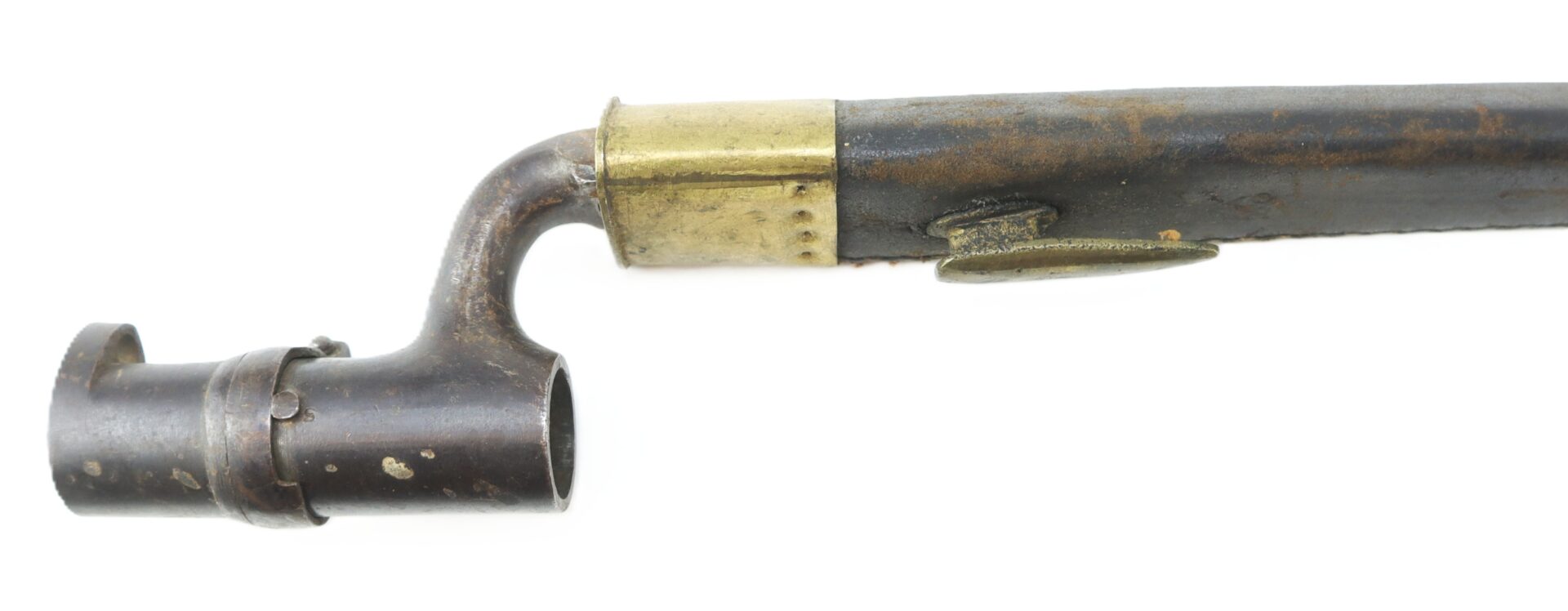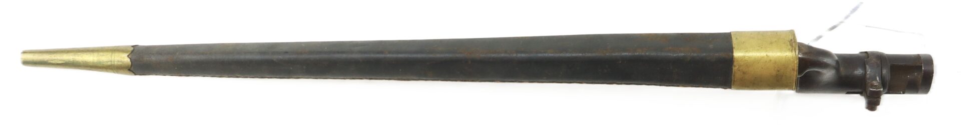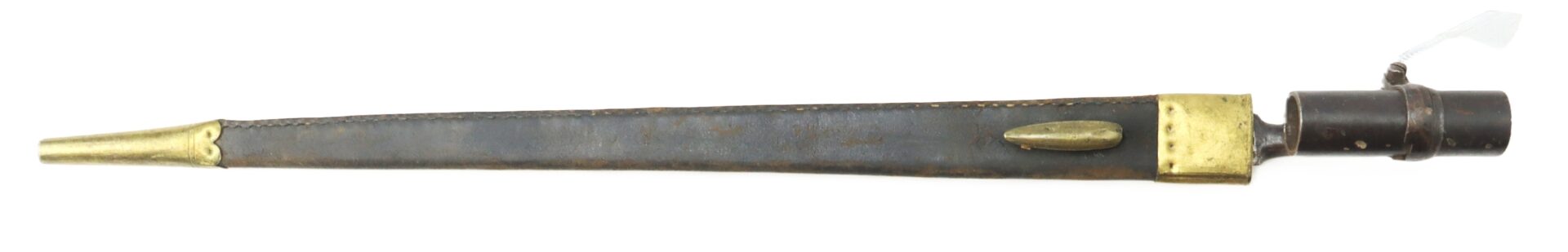 Enfield-pattern socket bayonet, accompanied by its period scabbard. This bayonet is of the type produced for use with the British Pattern 1853 Enfield rifle-musket, one of the most widely imported long arms used during the American Civil War by both Union and Confederate forces.
