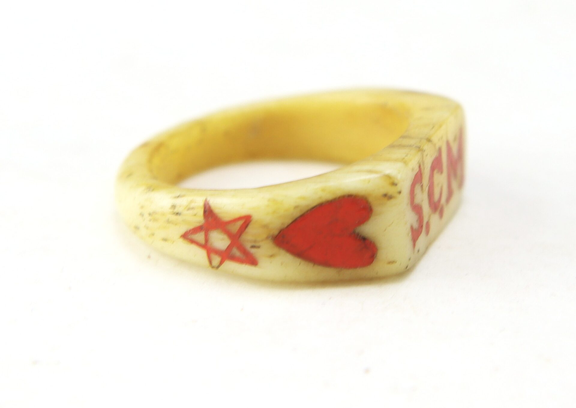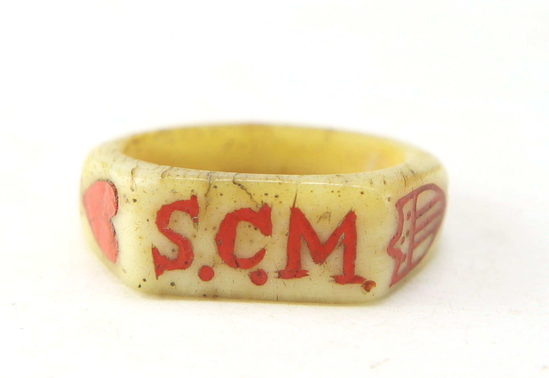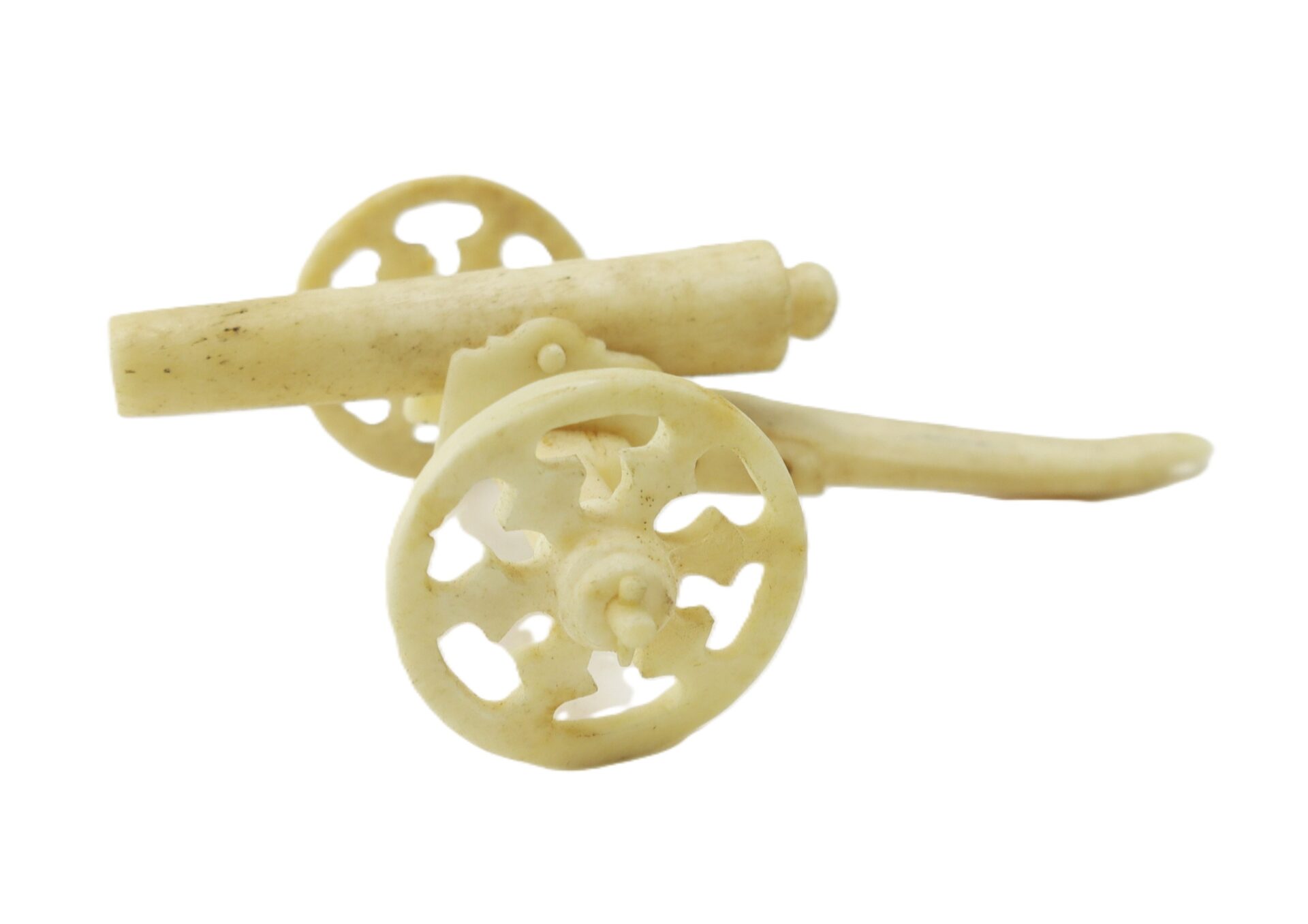 The cannons are expertly executed with turned wheels and detailed carriage construction, displaying strong craftsmanship and symmetry—suggestive of a skilled hand, likely a soldier-made creation. The carved bone ring is particularly notable, inlaid with red and black wax decoration and bearing the carver’s initials, adding a rare level of personalization and identity to the group.