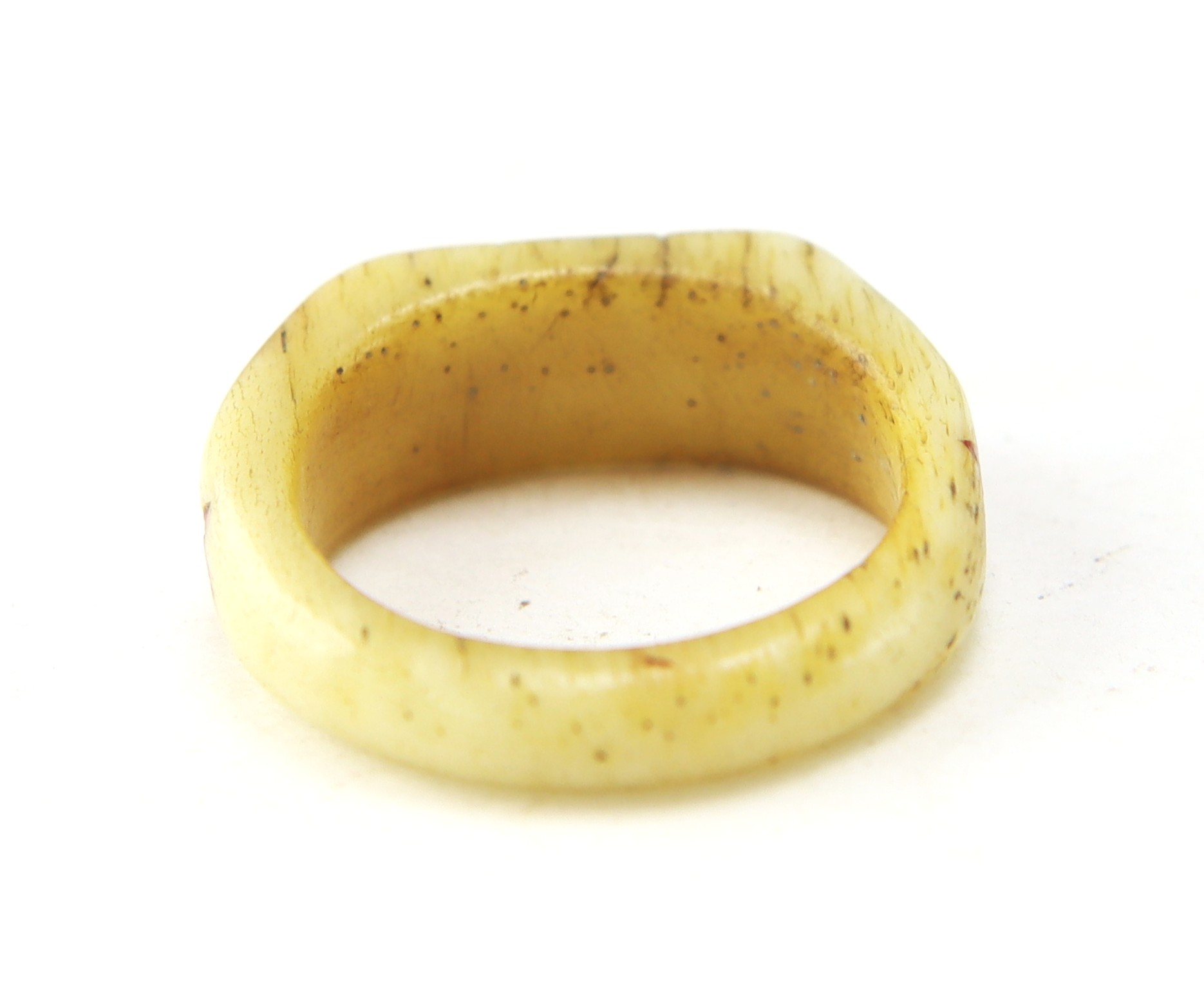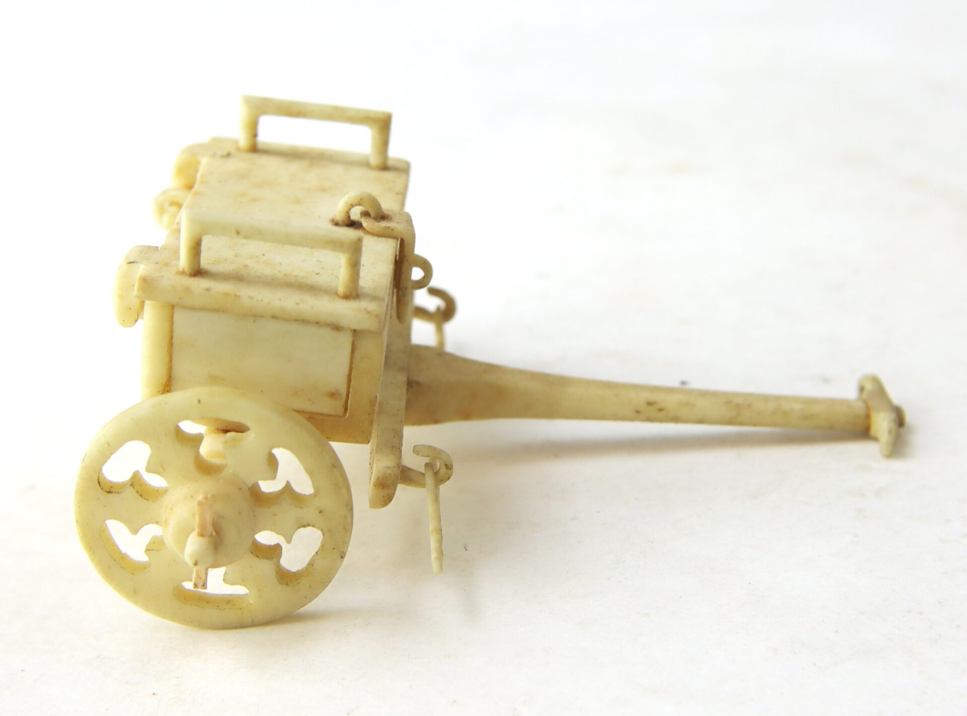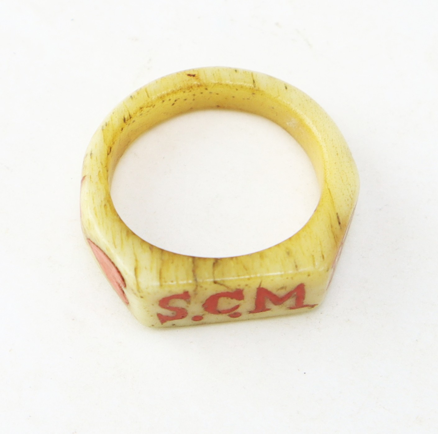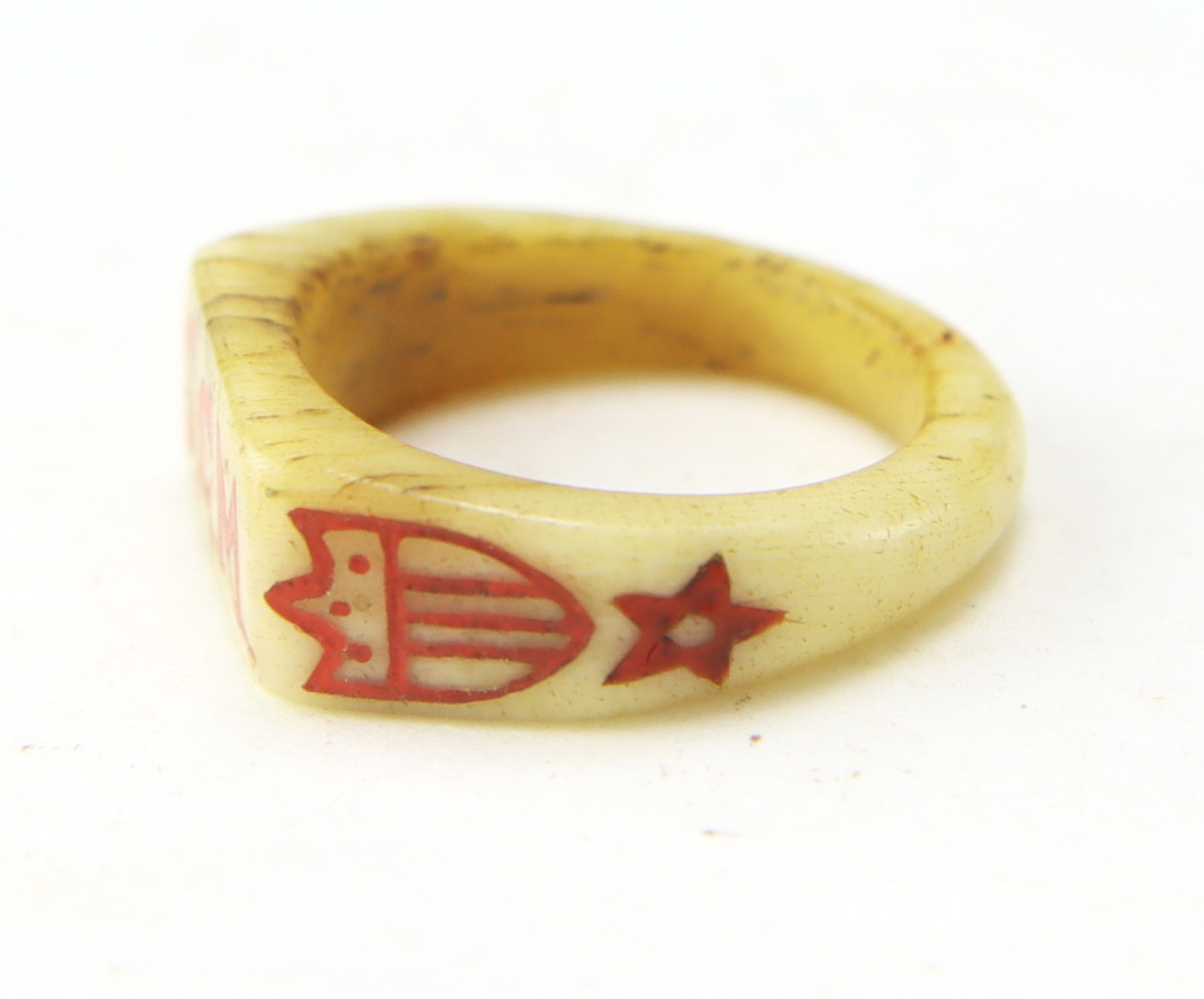 The cannons are expertly executed with turned wheels and detailed carriage construction, displaying strong craftsmanship and symmetry—suggestive of a skilled hand, likely a soldier-made creation. The carved bone ring is particularly notable, inlaid with red and black wax decoration and bearing the carver’s initials, adding a rare level of personalization and identity to the group.
