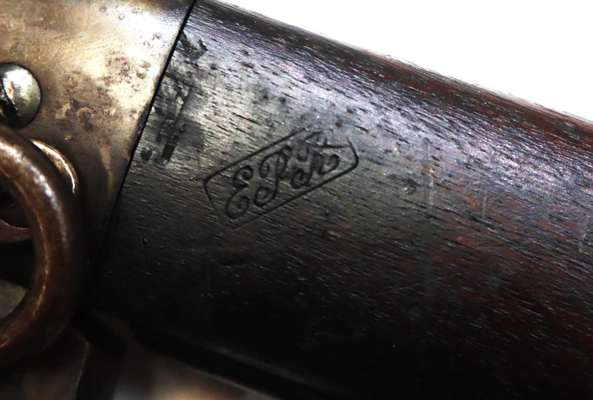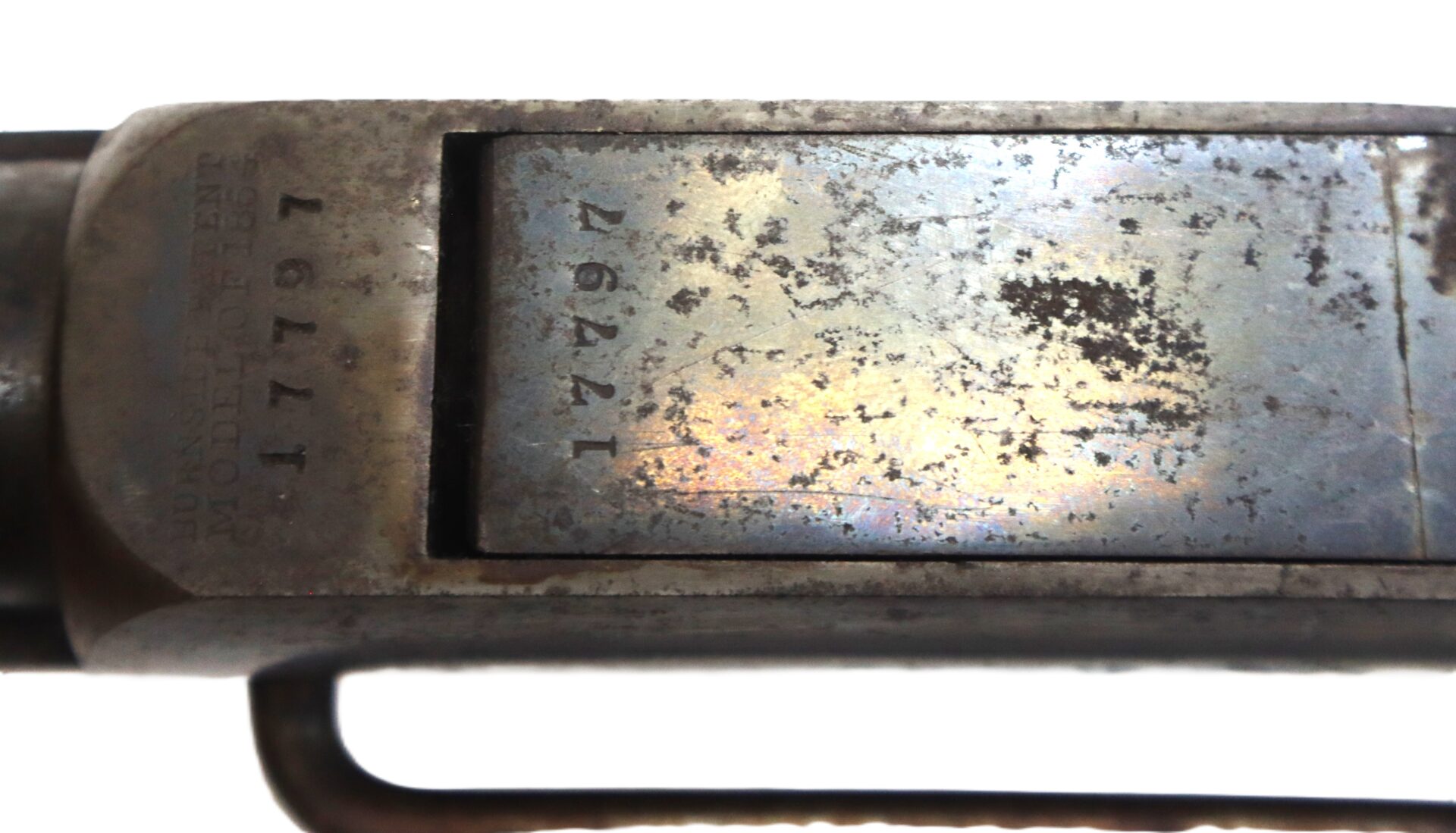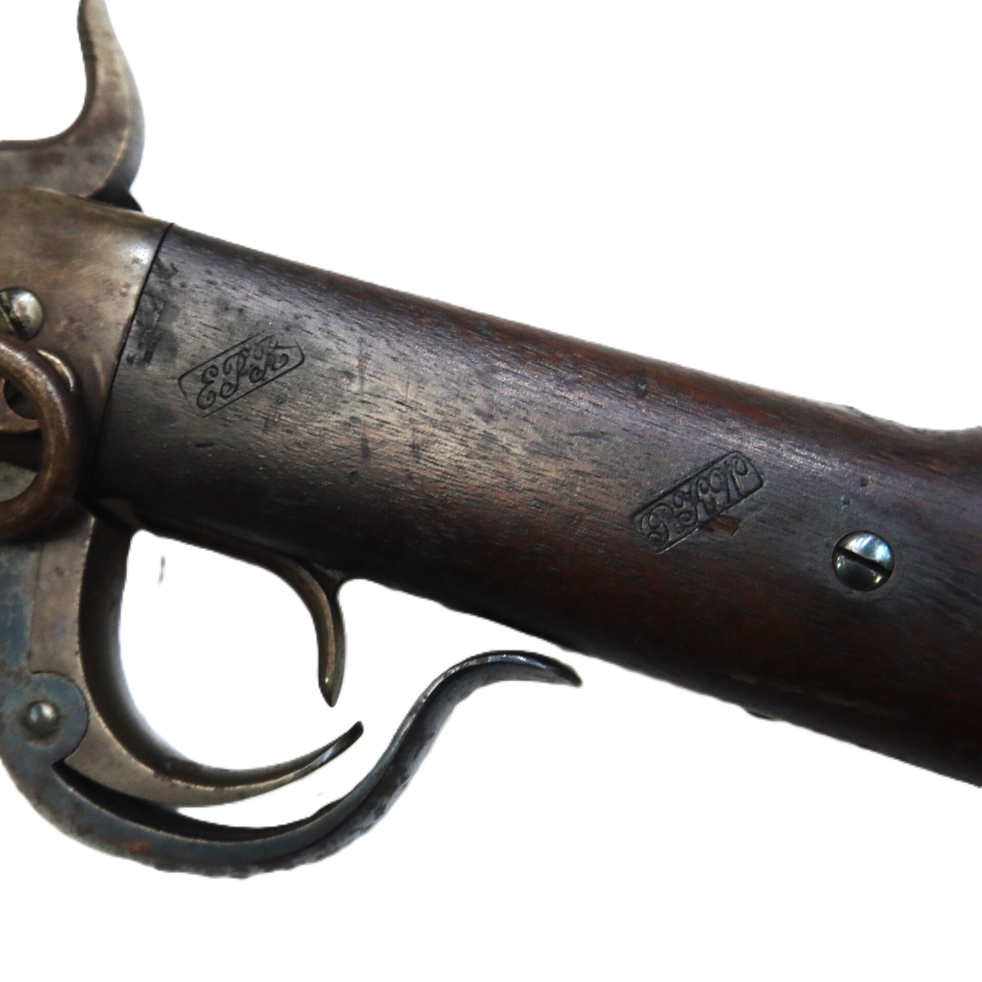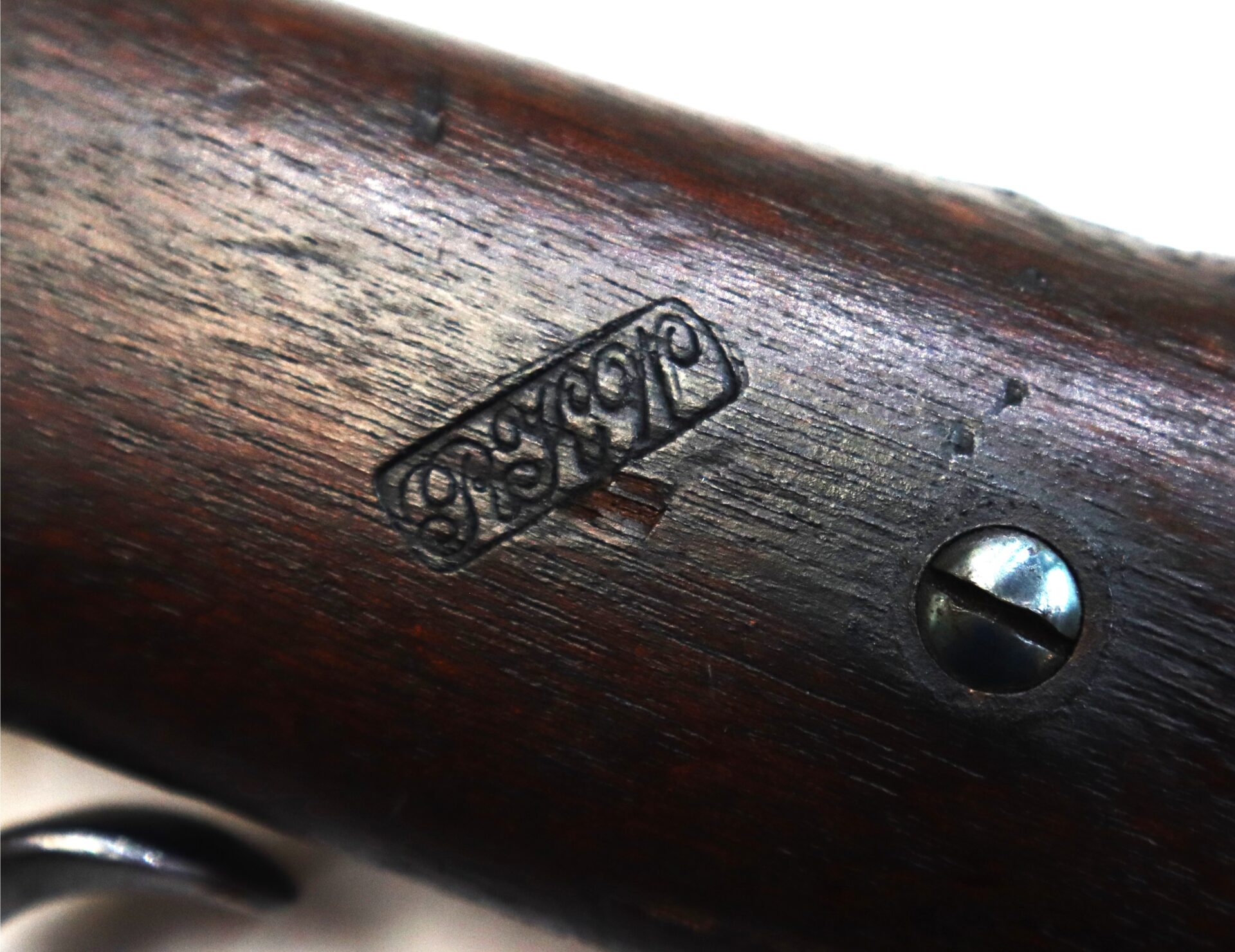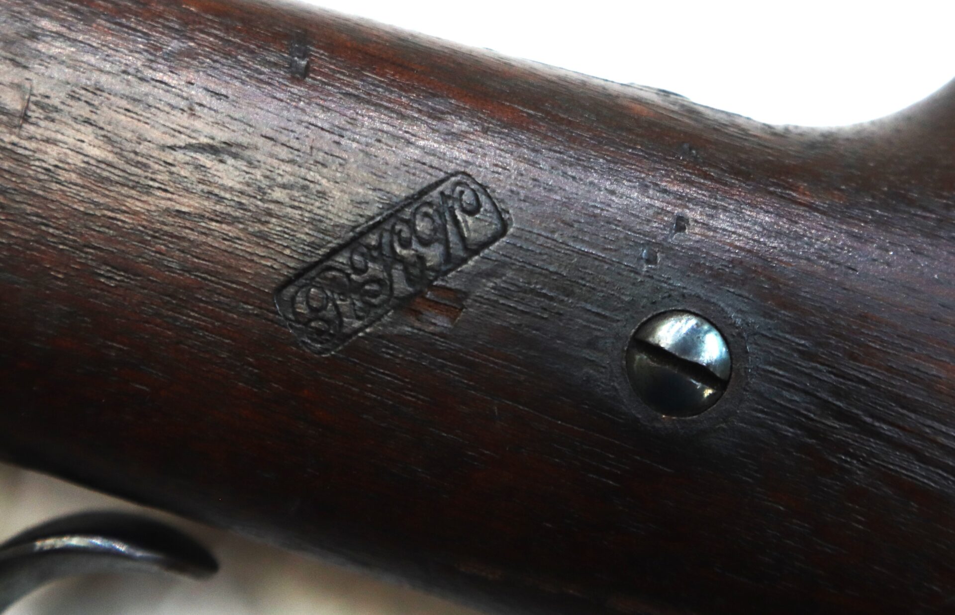 The top of the frame shows clear manufacturer markings, and the overall metal has an even, honest tone consistent with careful long-term preservation. The walnut stock remains sound with attractive age coloration and tight fit to the metal.