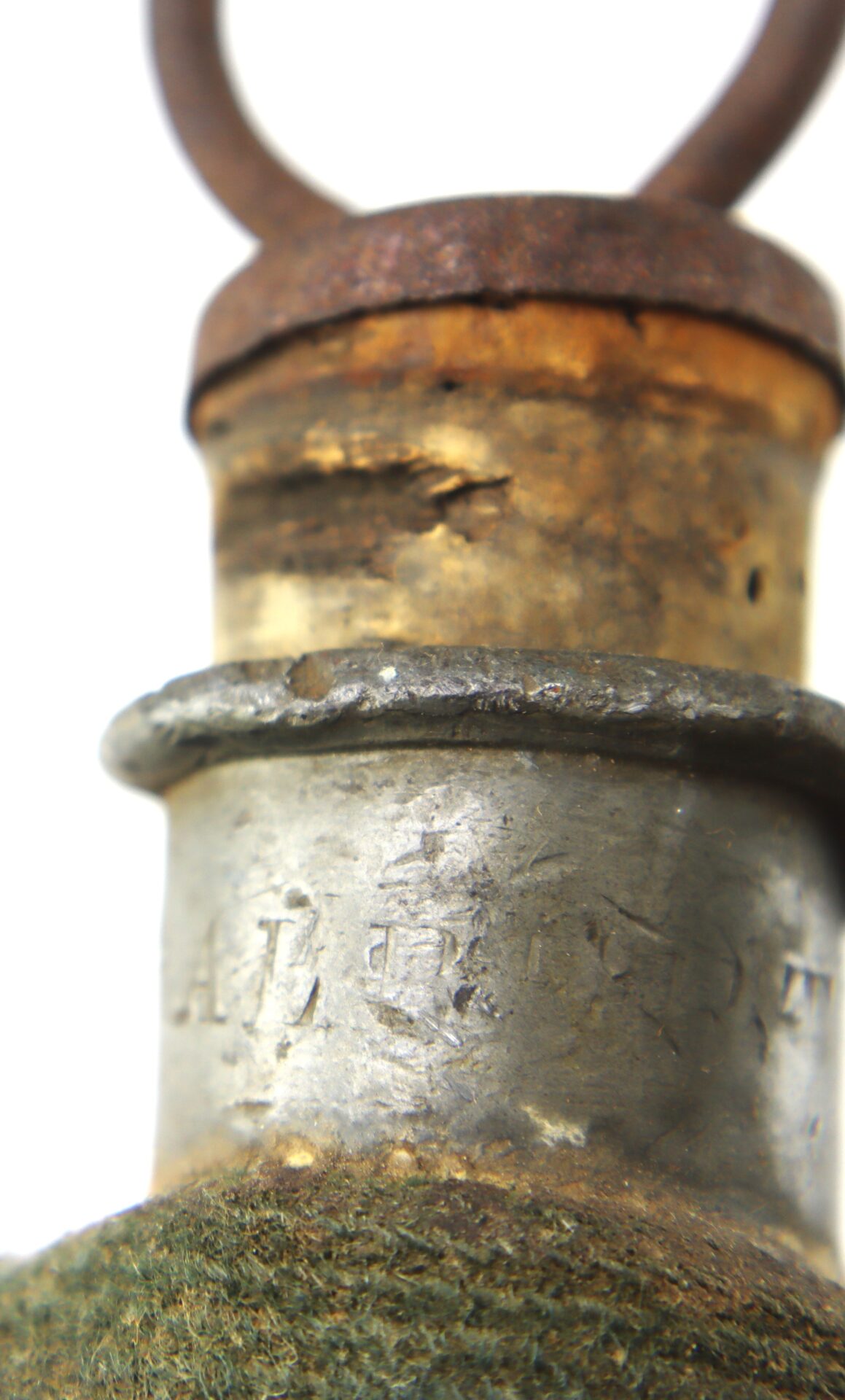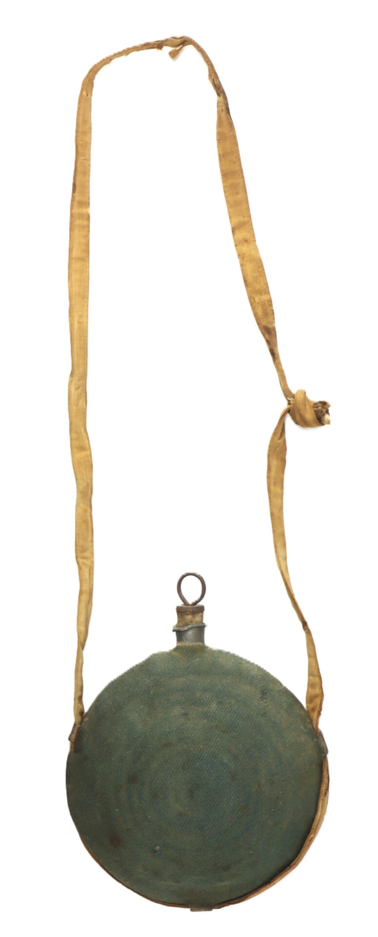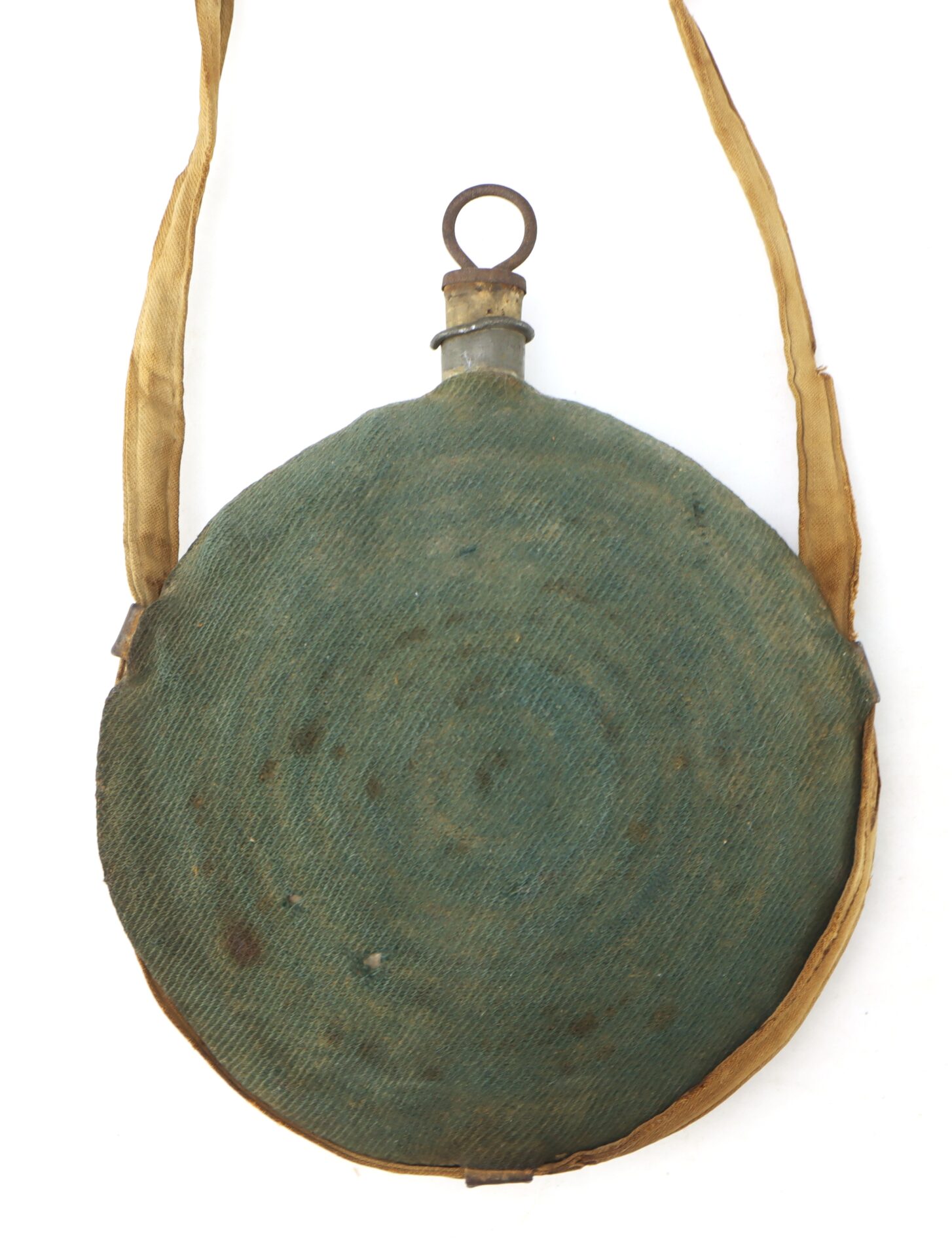 This cover, made of original, sky blue material, is handsewn along the canteen seams. The cover is in very good condition with a great blue hue. Canteen consists of two circular sections of pressed-tin, formed in an oblate spheroid pattern and soldered together at the rim. Pewter spout is unmarked. The iron pull ring is intact and the cork stopper is complete. The linen carrying strap has turned to a darker beige color and exhibits light soiling in spots from use in the field. This complete ‘Bullseye’ or corrugated pattern canteen is a very good example, carried and as essential to the soldier as his musket.