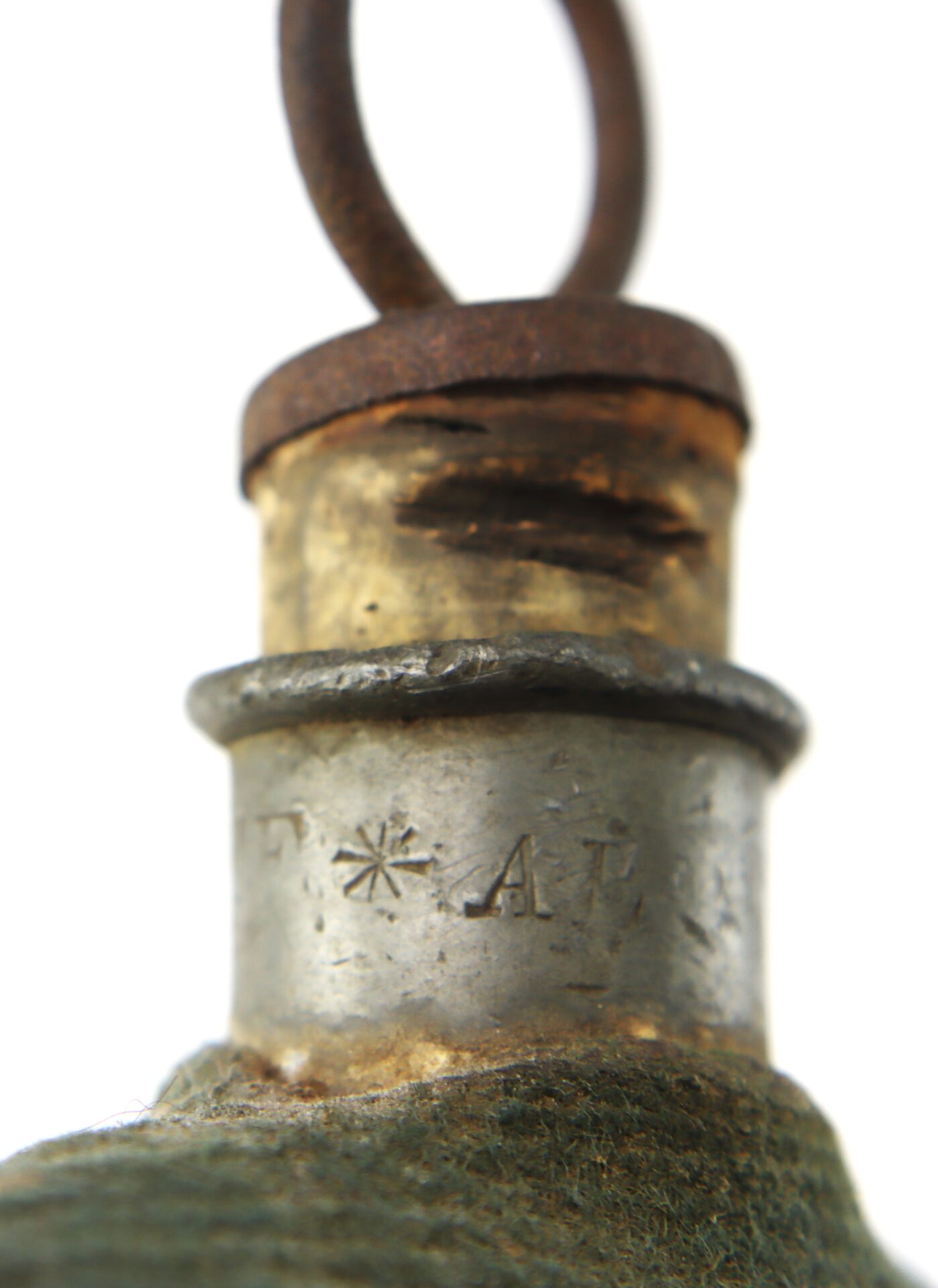 This example has a series of reinforcing rings extruded on each side. Its original cork stopper and iron pull ring are complete as is the cotton twine string which is typically broke or lacking in general making it as complete an example as they come.