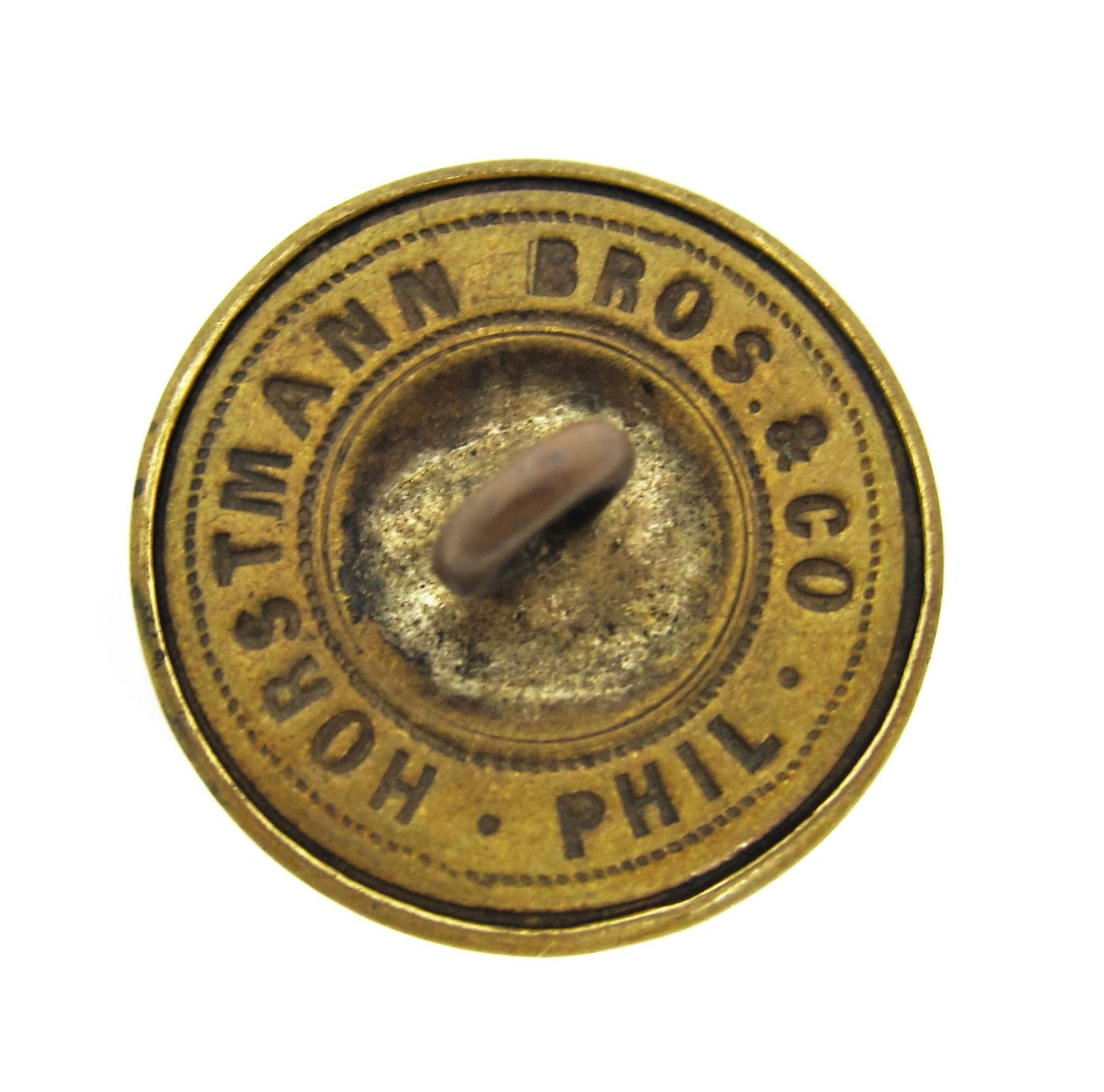 Union Veteran’s Gand Army of the Republic Coat Button, “GAR”, officer, staff, with backmark, “Horstmann Bros & CO. Phil”.  The  Grand Army of the Republic was formed after the war representing Union veterans.    Has script “GAR” upon lined field on the face of the button.  The reverse of the button has a b ackmark of,  “HORSTMANN BROS & CO. PHIL”.    Three part staff officer style button, coat size, gilded.   All non-dug examples.    Inventory Number: VET 029