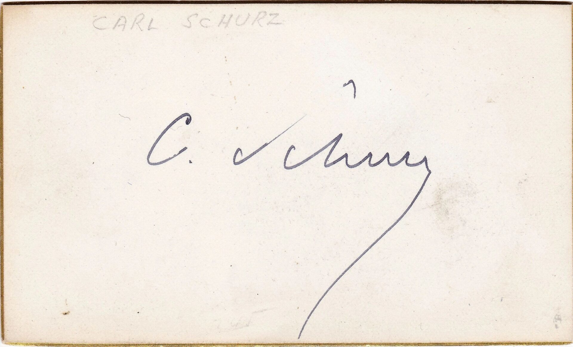 General Carl Schurz – Inventory Number: AUT 032 / SOLD Cdv and ink signature of General Carl Schurz During the American Civil War, Schurz served with distinction as a general in the Union Army. Persuading Lincoln to grant him a commission in the Union army, Schurz was commissioned brigadier general of Union volunteers in April 1862. In June, he took command of a division, first under John C. Frémont, and then in Franz Sigel’s corps, with which he took part in the Second Battle of Bull Run in August 1862. He was promoted to major general in 1863 and was assigned to lead a division in the XI Corps at the battles of Chancellorsville and Gettysburg, both under General Oliver O. Howard. A bitter controversy began between Schurz and Howard over the strategy employed at Chancellorsville, resulting in the routing of the XI Corps by the Confederate corps led by Thomas J. “Stonewall” Jackson. Two months later, the XI Corps again broke during the first day of Gettysburg. Containing several German-American units, the XI Corps performance during both battles was heavily criticized by the press, fueling anti-immigrant sentiments. Following Gettysburg, Schurz’s division was deployed to Tennessee and participated in the Battle of Chattanooga. There he served with the future Senator Joseph B. Foraker, John Patterson Rea, and Luther Morris Buchwalter, brother to Morris Lyon Buchwalter. Senator Charles Sumner (R-MA) was a Congressional observer during the Chattanooga Campaign. Later, he was put in command of a Corps of Instruction at Nashville. He briefly returned to active service, where in the last months of the war he was with Sherman’s army in North Carolina as chief of staff of Henry Slocum’s Army of Georgia. He resigned from the army after the war ended in April 1865. In the summer of 1865, President Andrew Johnson sent Schurz through the South to study conditions. They then quarreled because Schurz supported General Slocum’s order forbidding the organization of militia in Mississippi. Schurz’s report, which suggested the readmission of the states with complete rights and the investigation of the need of further legislation by a Congressional committee, was ignored by the President. Inventory Number: AUT 032 / SOLD