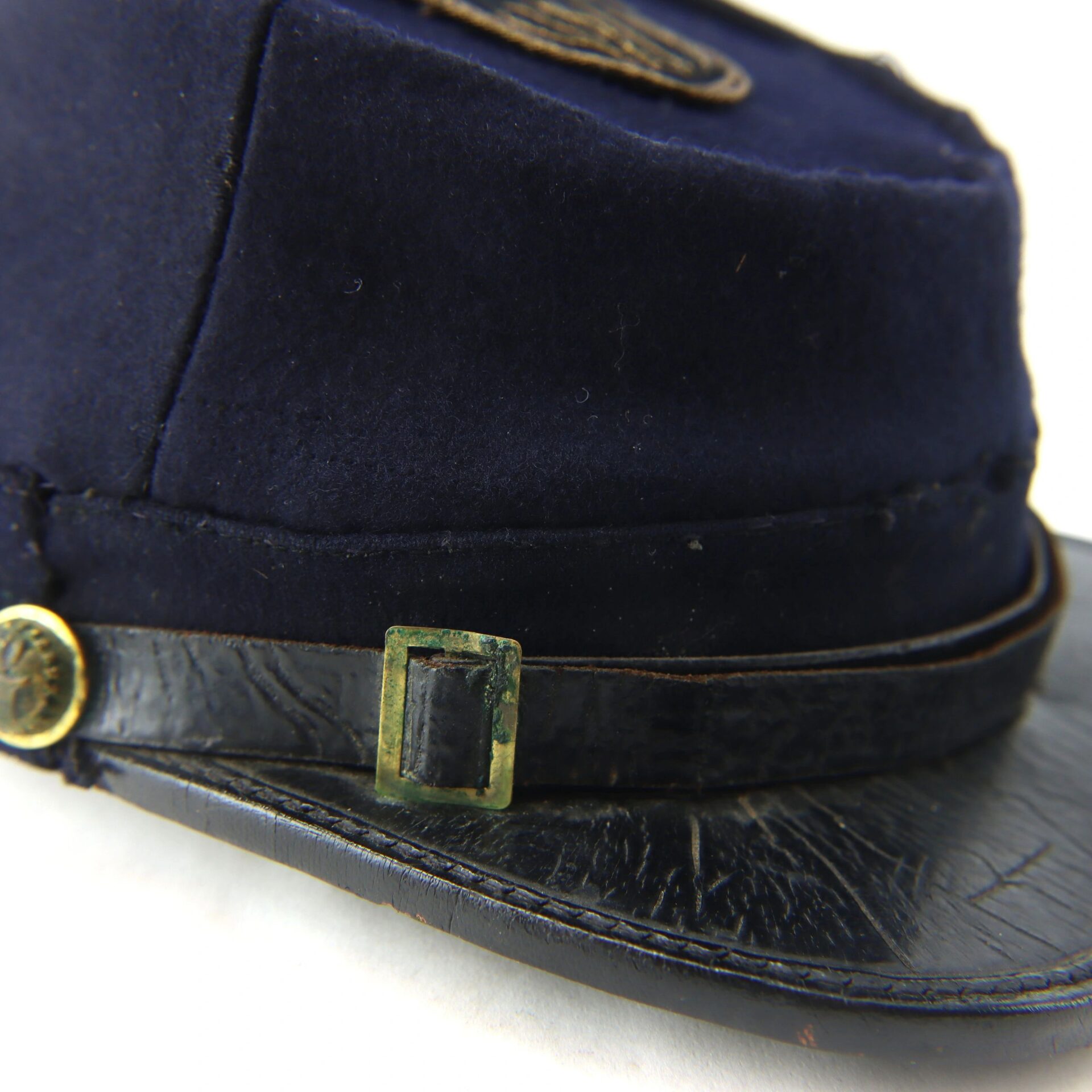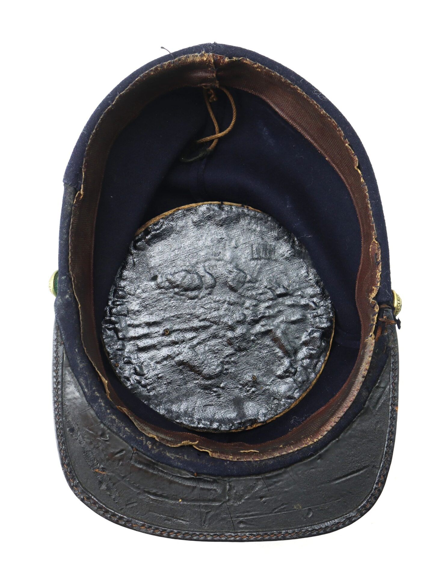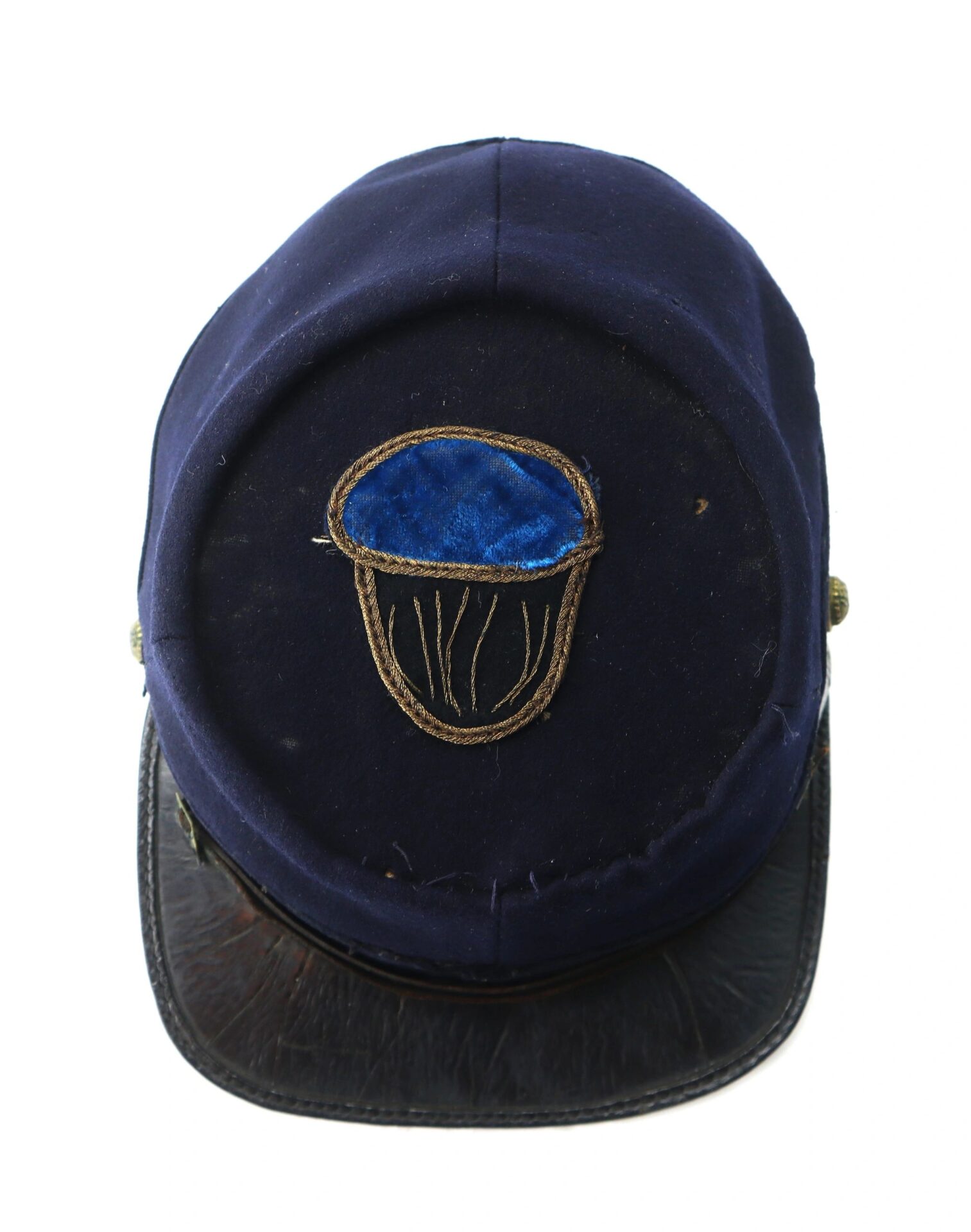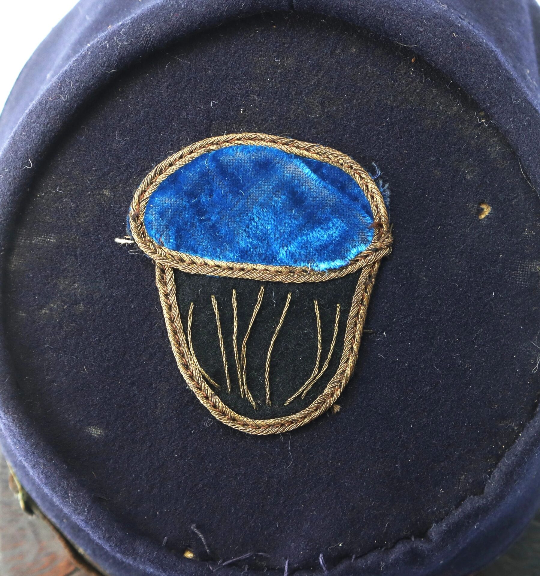 Grand Army of the Republic Kepi with War time 14 Corps Badge – Inventory Number: UNI 189 / SOLD The 14 th Corps badge s ymboliz es the soldier’s resilience in the field hen nearly starved , reverted to roasting and eating acorns to sustain themselves. Superb G.A.R. kepi mounted with a n exquisite blue velvet and gold tape bullion corps badge that appears to be a wartime example . Internal features of this cap are of a black lining with the complete leather sweatband. In excellent condition. Inventory Number: UNI 189 / SOLD