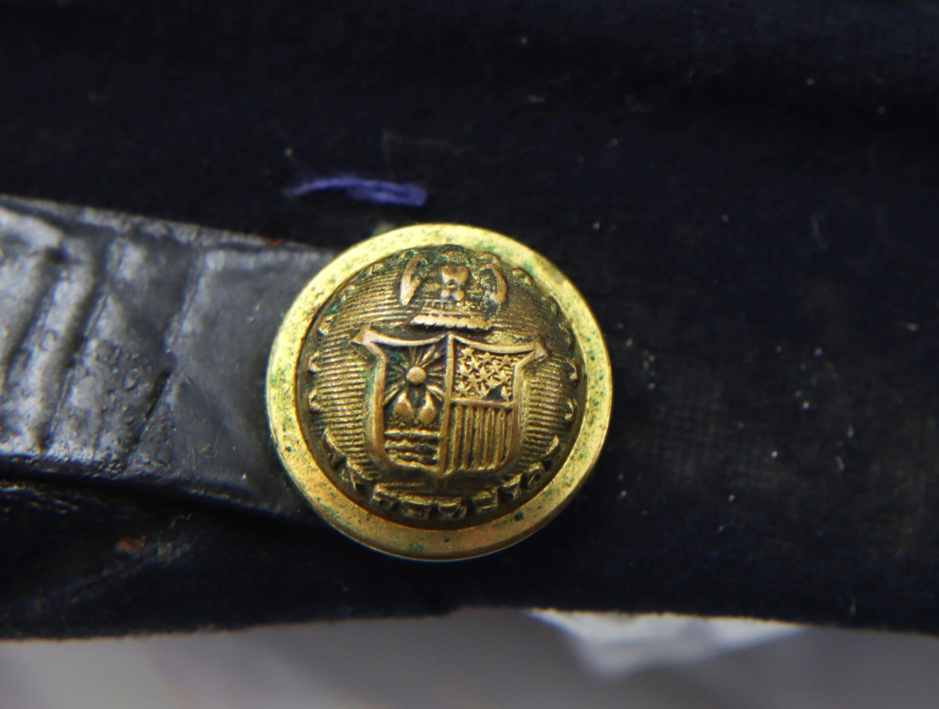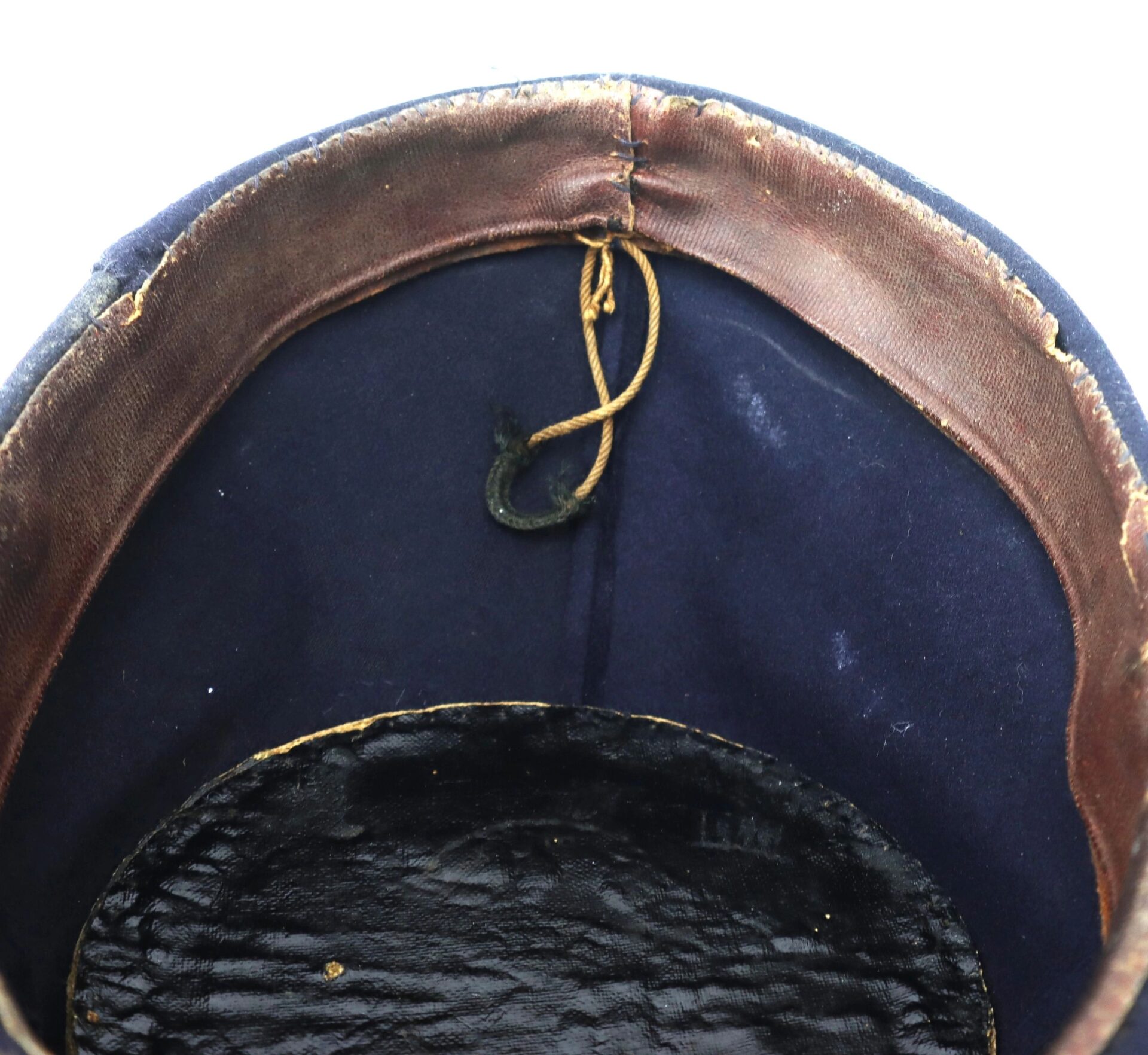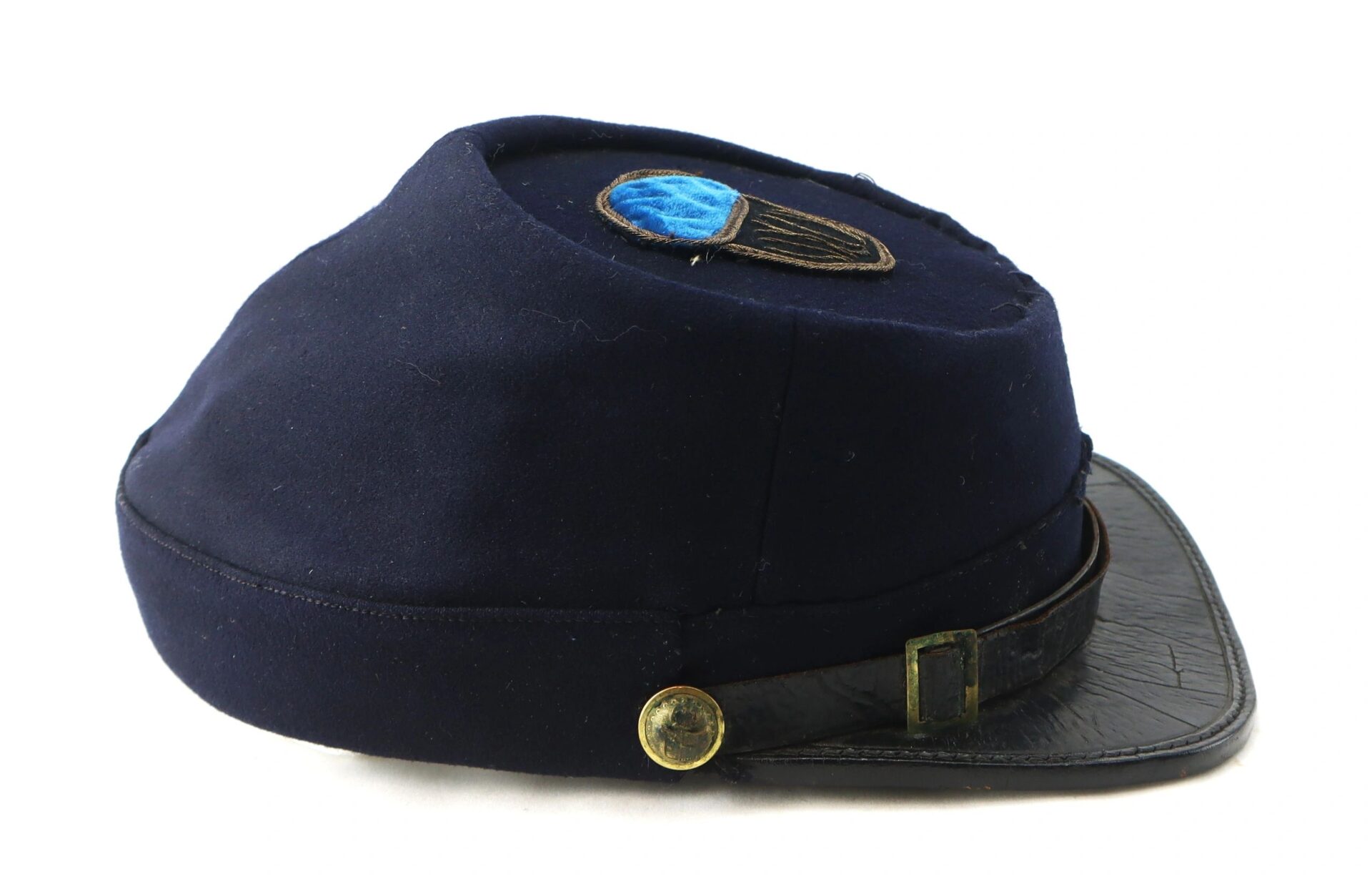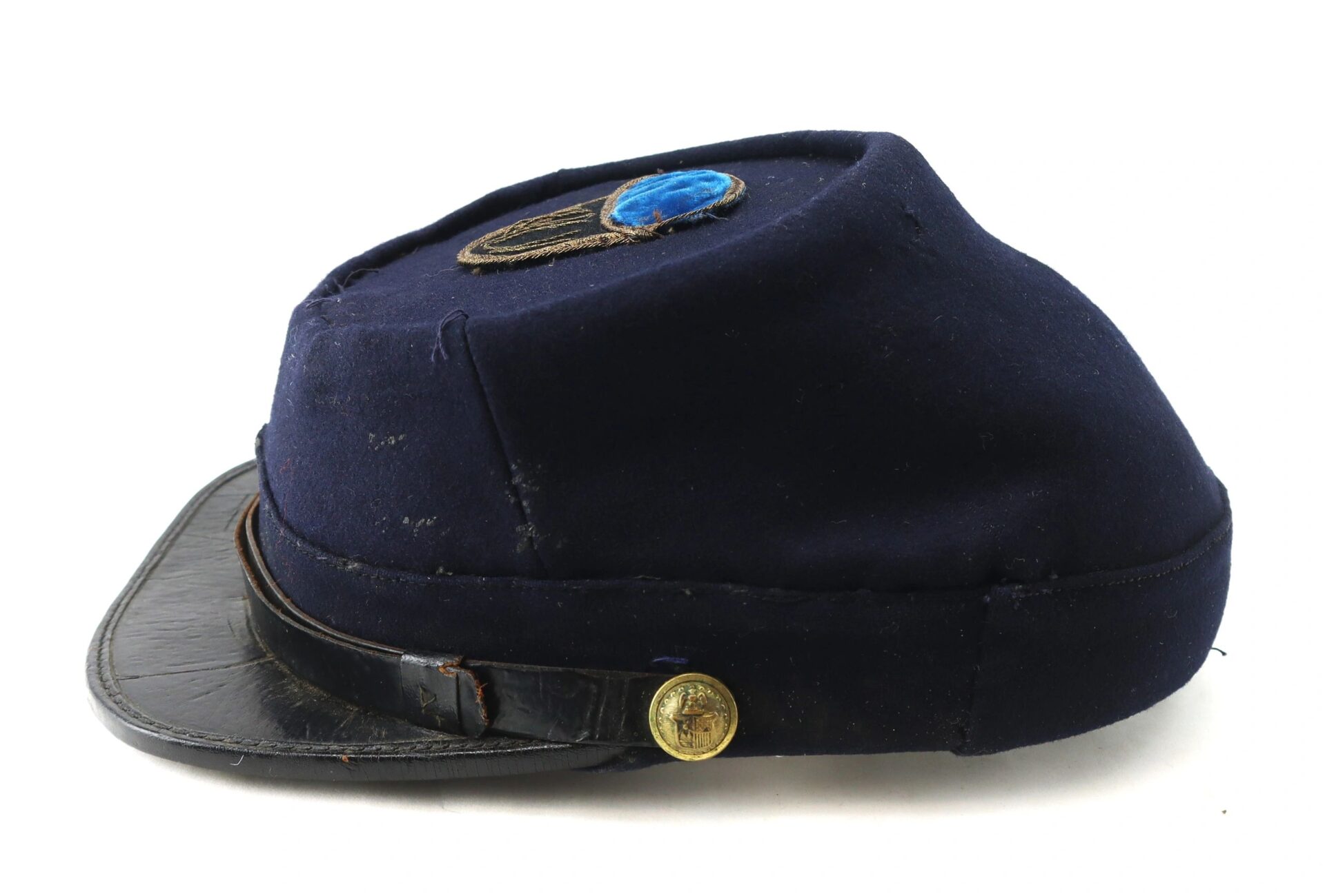 Grand Army of the Republic Kepi with War time 14 Corps Badge – Inventory Number: UNI 189 / SOLD The 14 th Corps badge s ymboliz es the soldier’s resilience in the field hen nearly starved , reverted to roasting and eating acorns to sustain themselves. Superb G.A.R. kepi mounted with a n exquisite blue velvet and gold tape bullion corps badge that appears to be a wartime example . Internal features of this cap are of a black lining with the complete leather sweatband. In excellent condition. Inventory Number: UNI 189 / SOLD