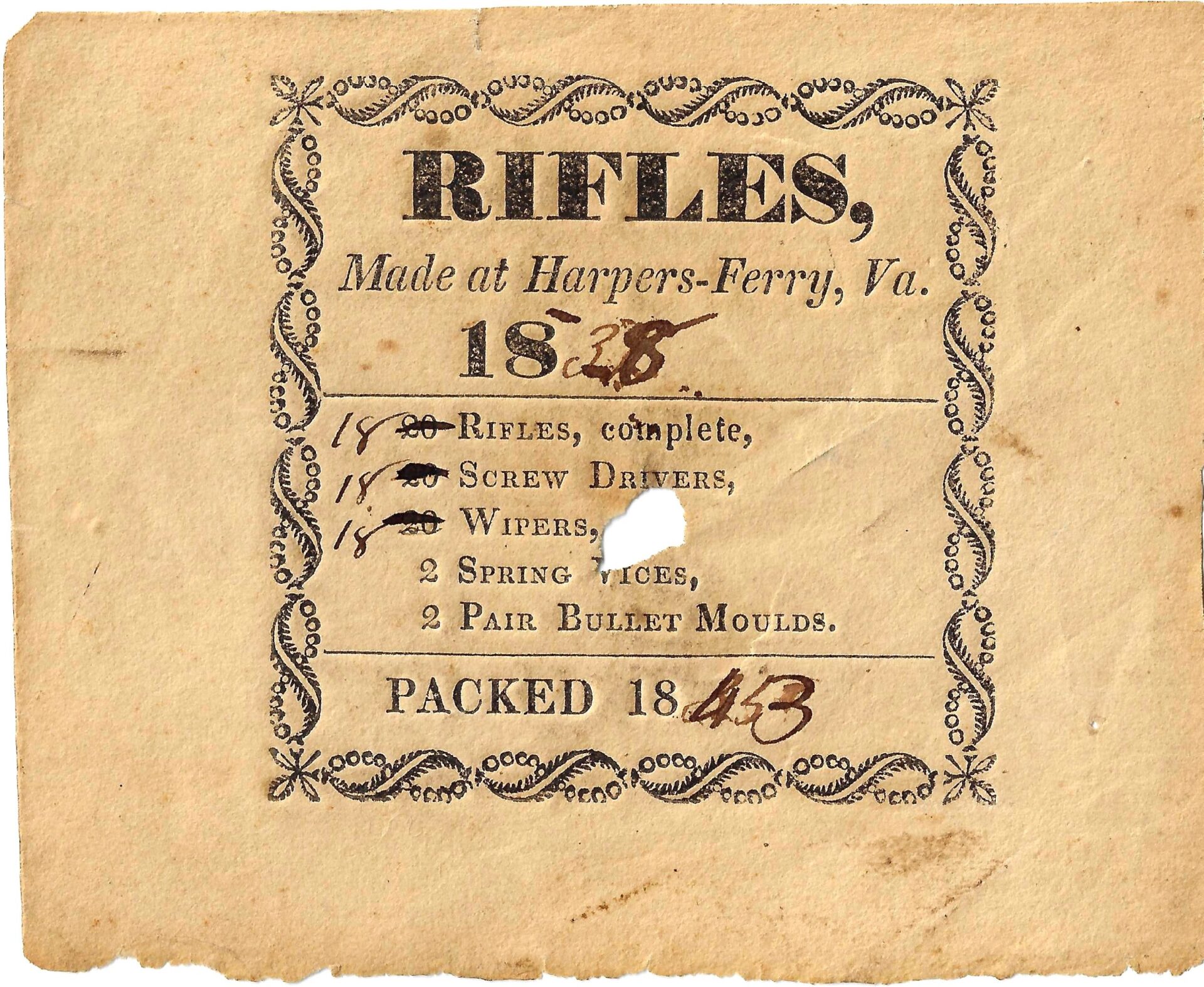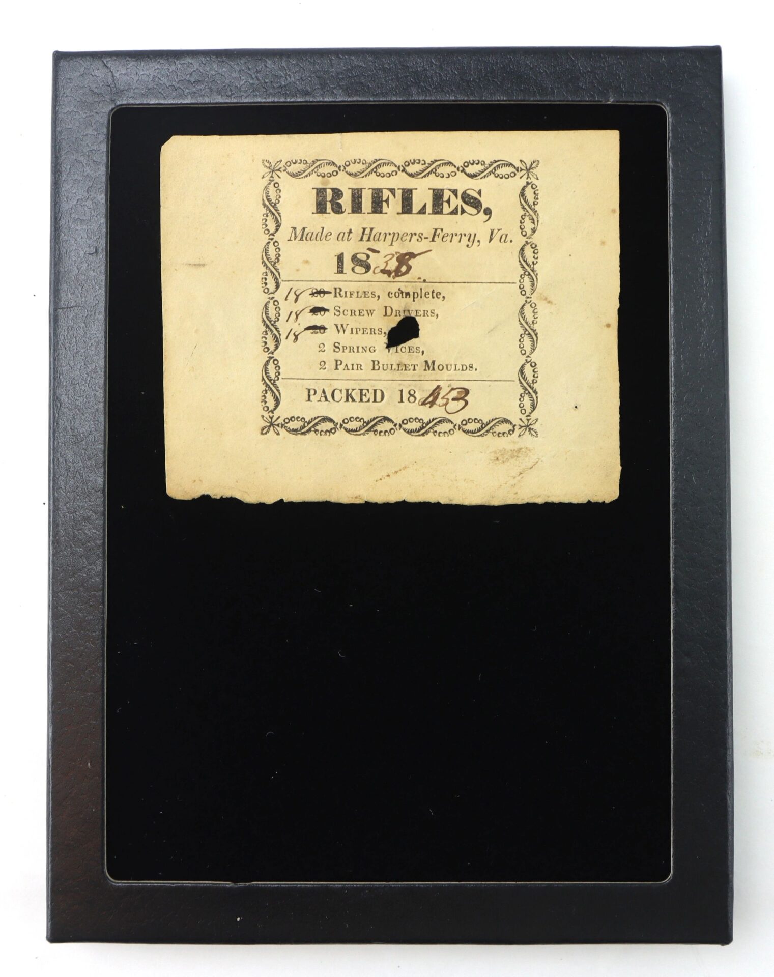 Harper’s Ferry Crate Label – Inventory Number: RIF 232 RIFLES, Made at Harpers-Ferry, Va. 1838 18 Rifles, complete, 18 Screw Drivers, 18 Wipers, 2 Spring Vices, 2 Pair Bullet Moulds. PACKED 1843 Comes housed in 6 x 8 riker display case with black velvet and descriptive card. *To purchase this item directly with a credit card, please click on this link.   Inventory Number: RIF 232