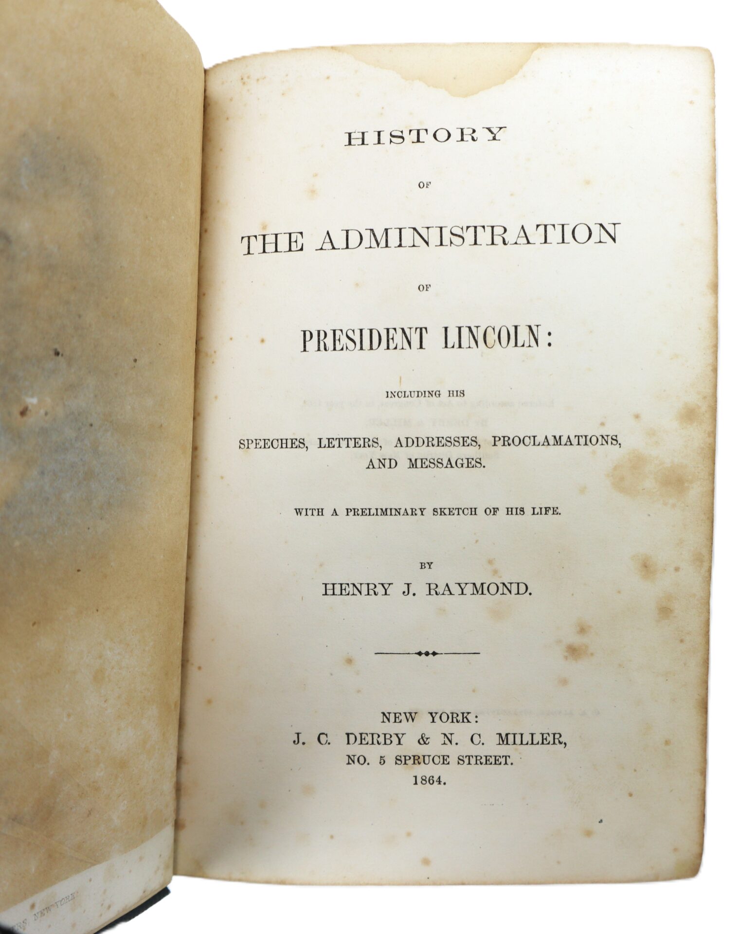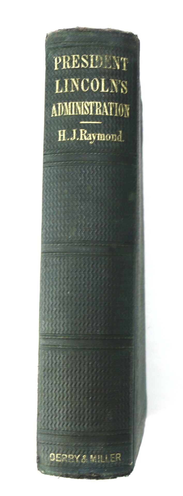 Scarce 1864 first edition of History of the Administration of President Lincoln, written by journalist Henry J. Raymond, co-founder of the New York Times. Published in New York by J. C. Derby & N. C. Miller in 1864 during Lincoln’s re-election campaign, this work was issued as a contemporary defense and record of Lincoln’s first term. Written prior to Lincoln’s assassination.