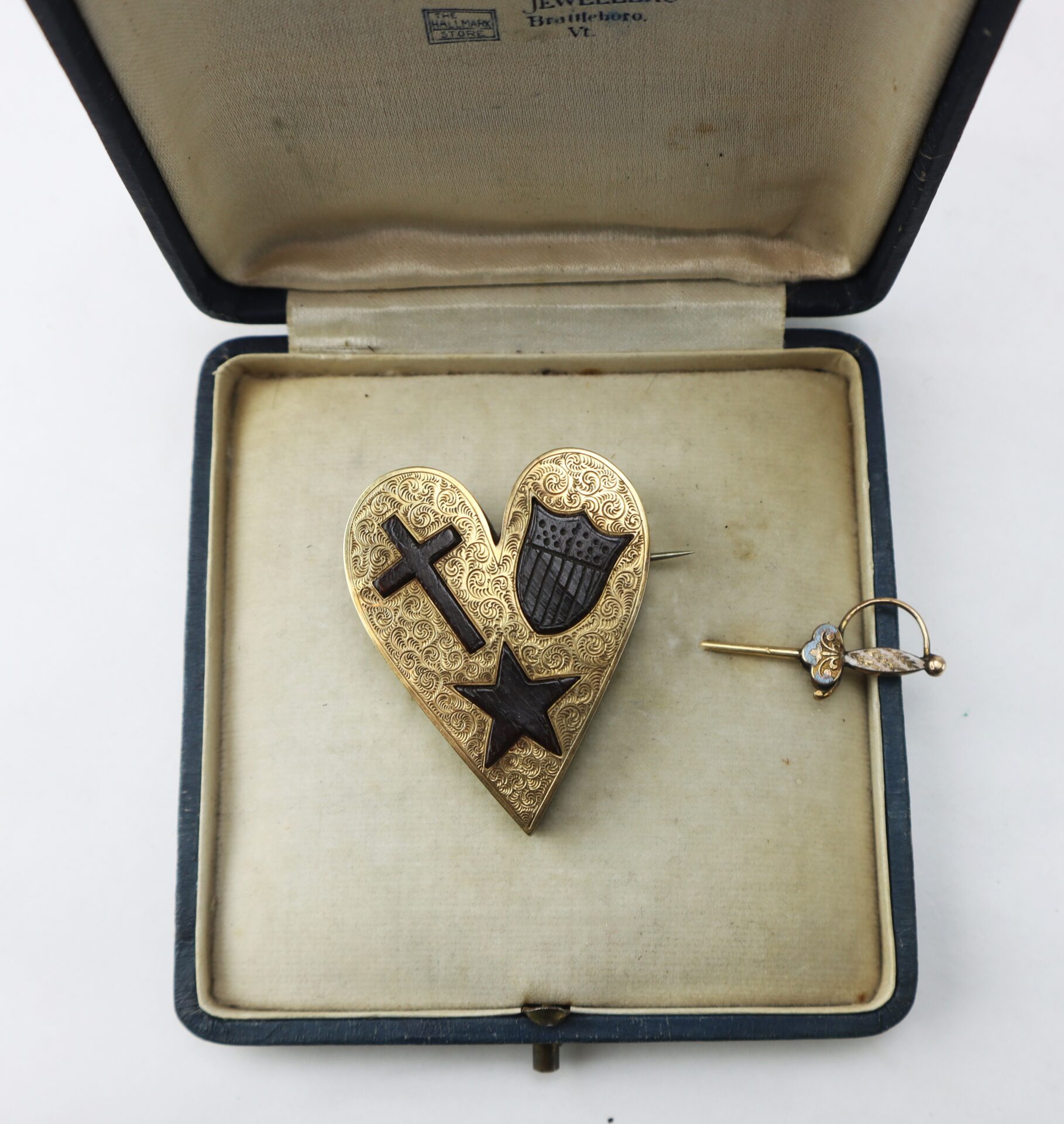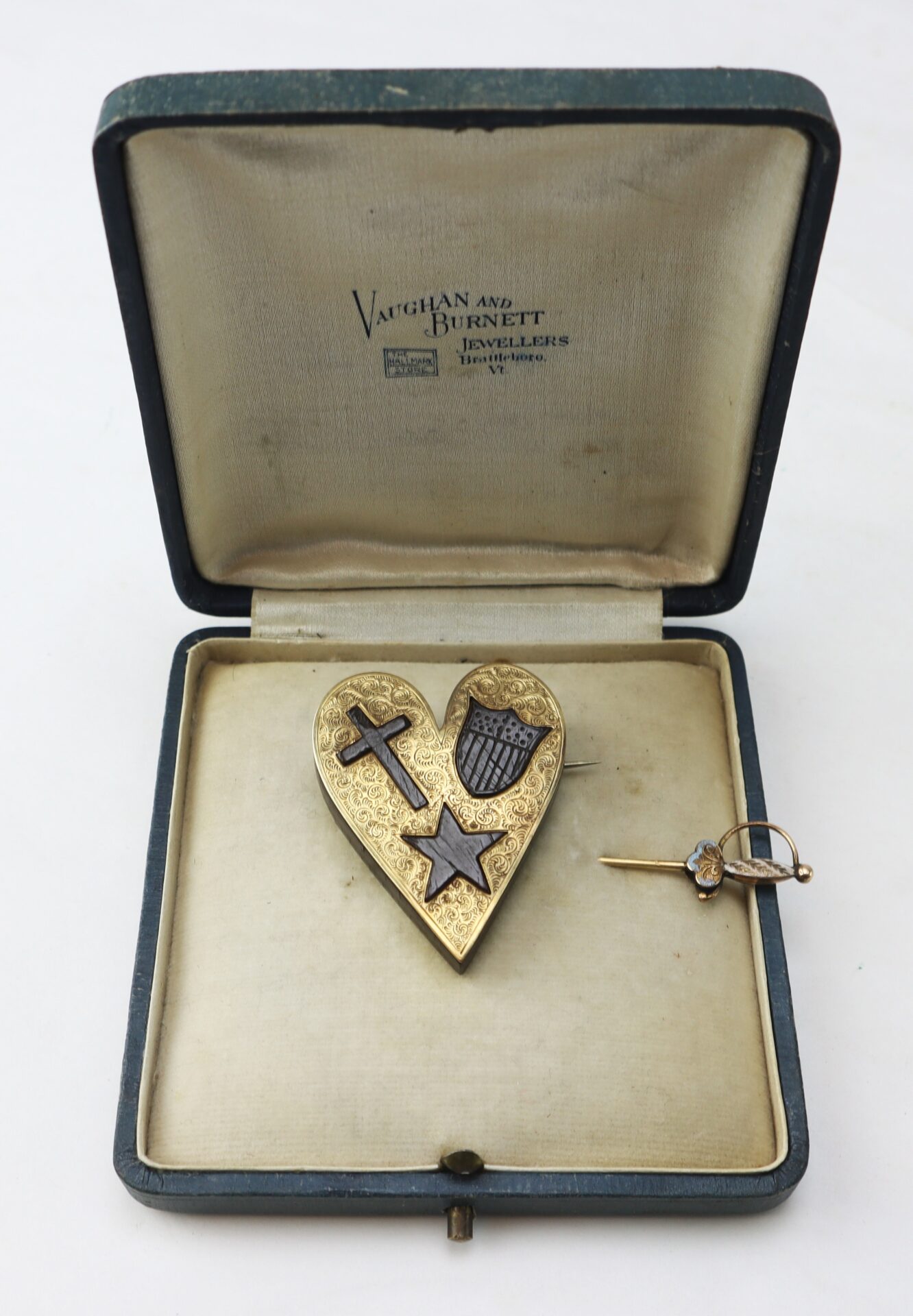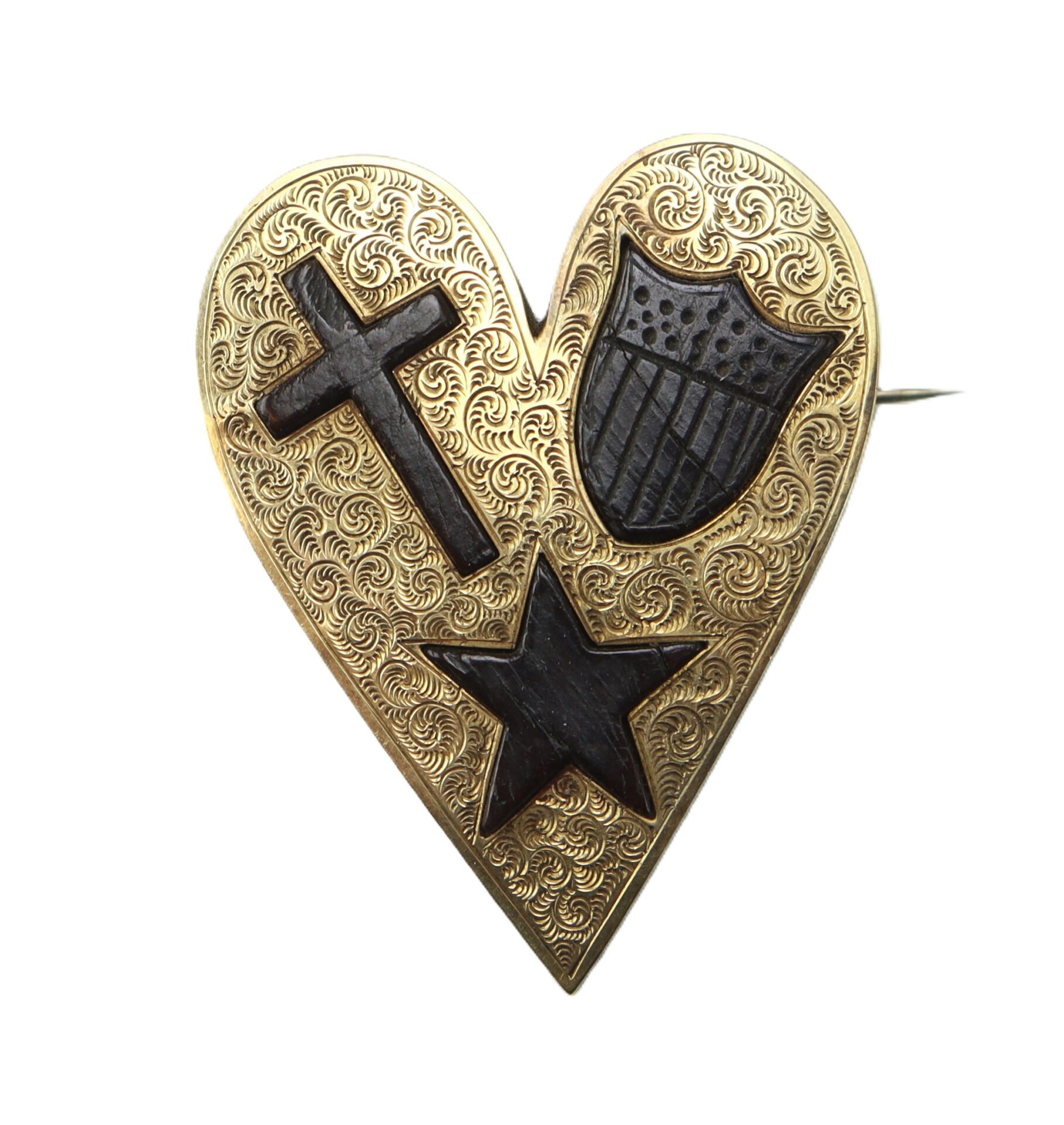 The badge is crafted in 14 karat gold with a profusely hand-engraved face displaying rich, flowing scrollwork typical of fine mid-19th century jewelry. Prominently applied to the surface are a raised cross, a Federal shield, and a five-pointed star—symbols blending Christian faith, Union patriotism, and sacrifice. The combination of these motifs reflects both the personal grief of the family and the national cause for which Hale gave his life.