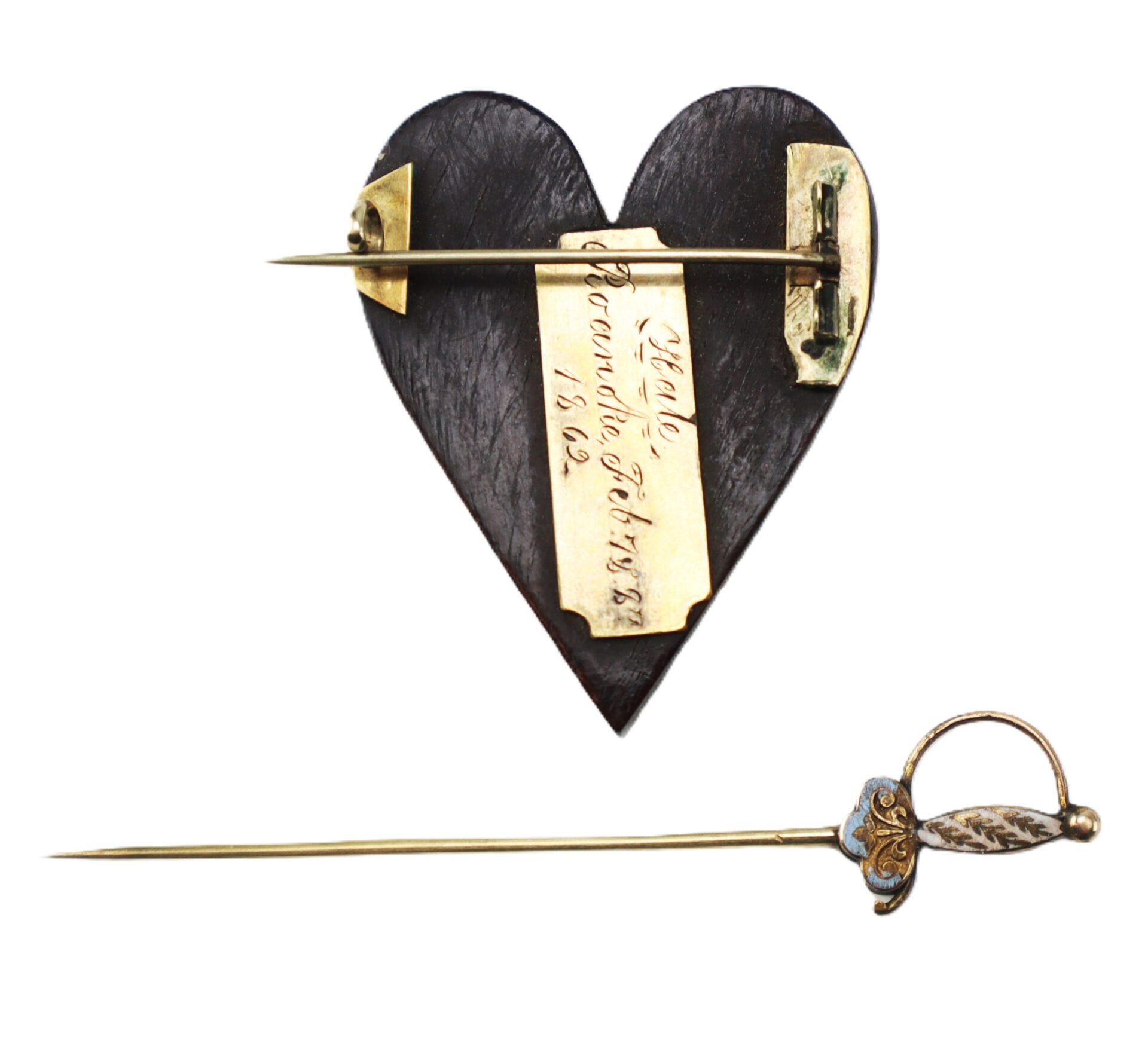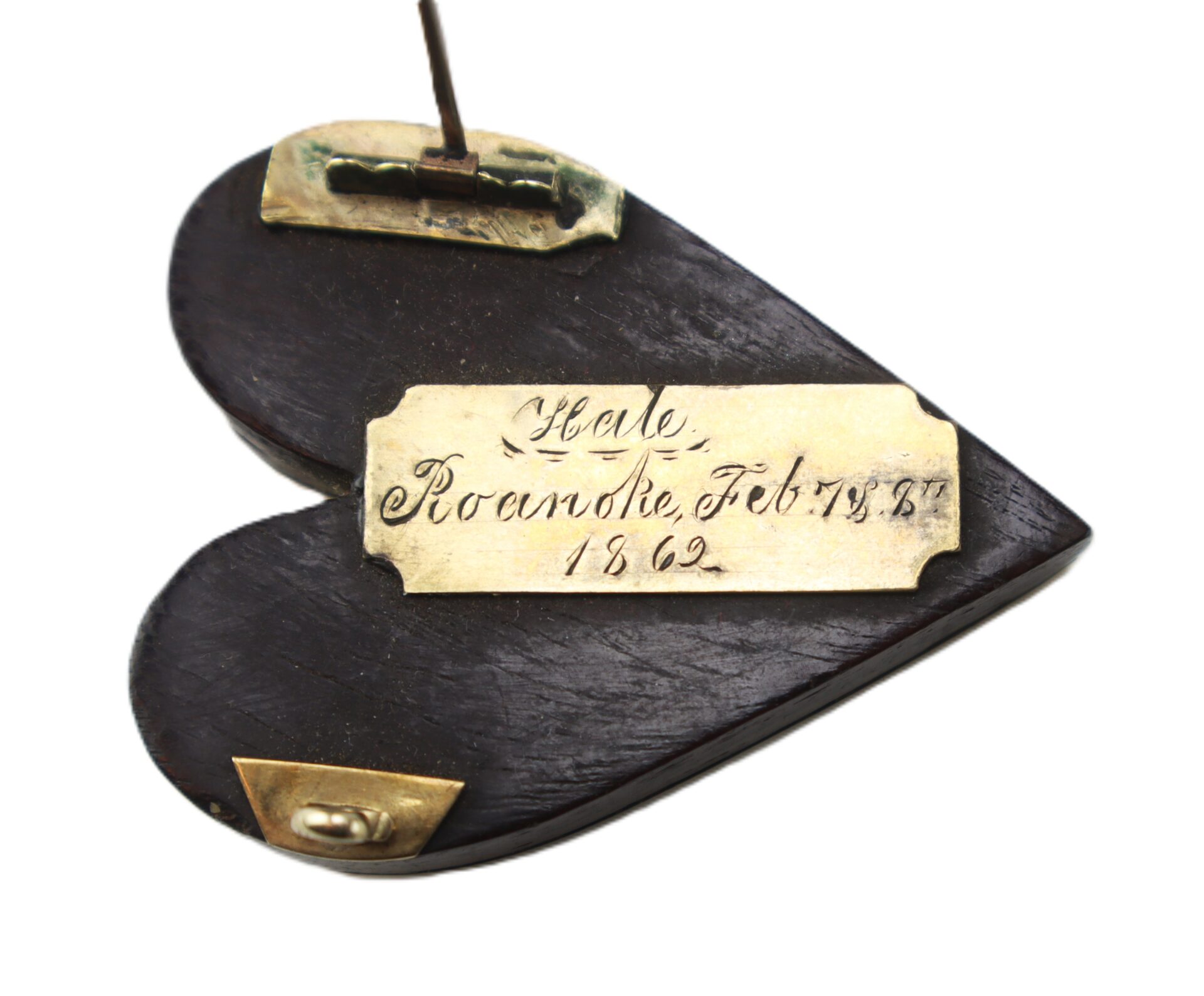 The body of the badge is constructed of hardwood, creating a subtle contrast between the warm gold face and dark backing. The reverse retains its original gold clasp assembly and engraved presentation plaque reading, “Hale – Roanoke Feb 7th, 8th 1862,” directly tying the piece to the Union victory at Roanoke Island during Burnside’s North Carolina Expedition. The elegant script and period engraving style are entirely consistent with wartime memorial jewelry.