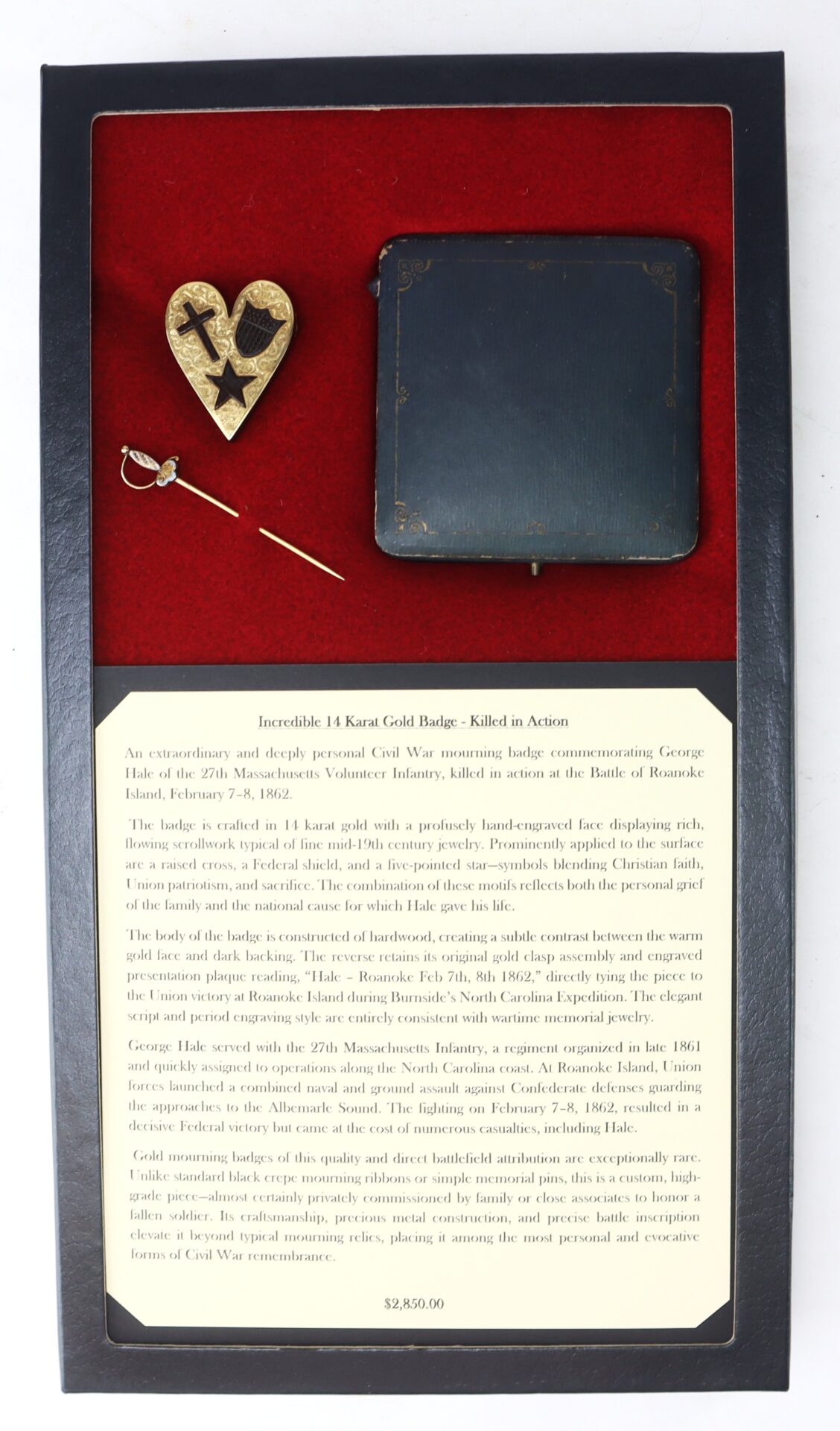 An extraordinary and deeply personal Civil War mourning badge commemorating George Hale of the 27th Massachusetts Volunteer Infantry, killed in action at the Battle of Roanoke Island, February 7–8, 1862.