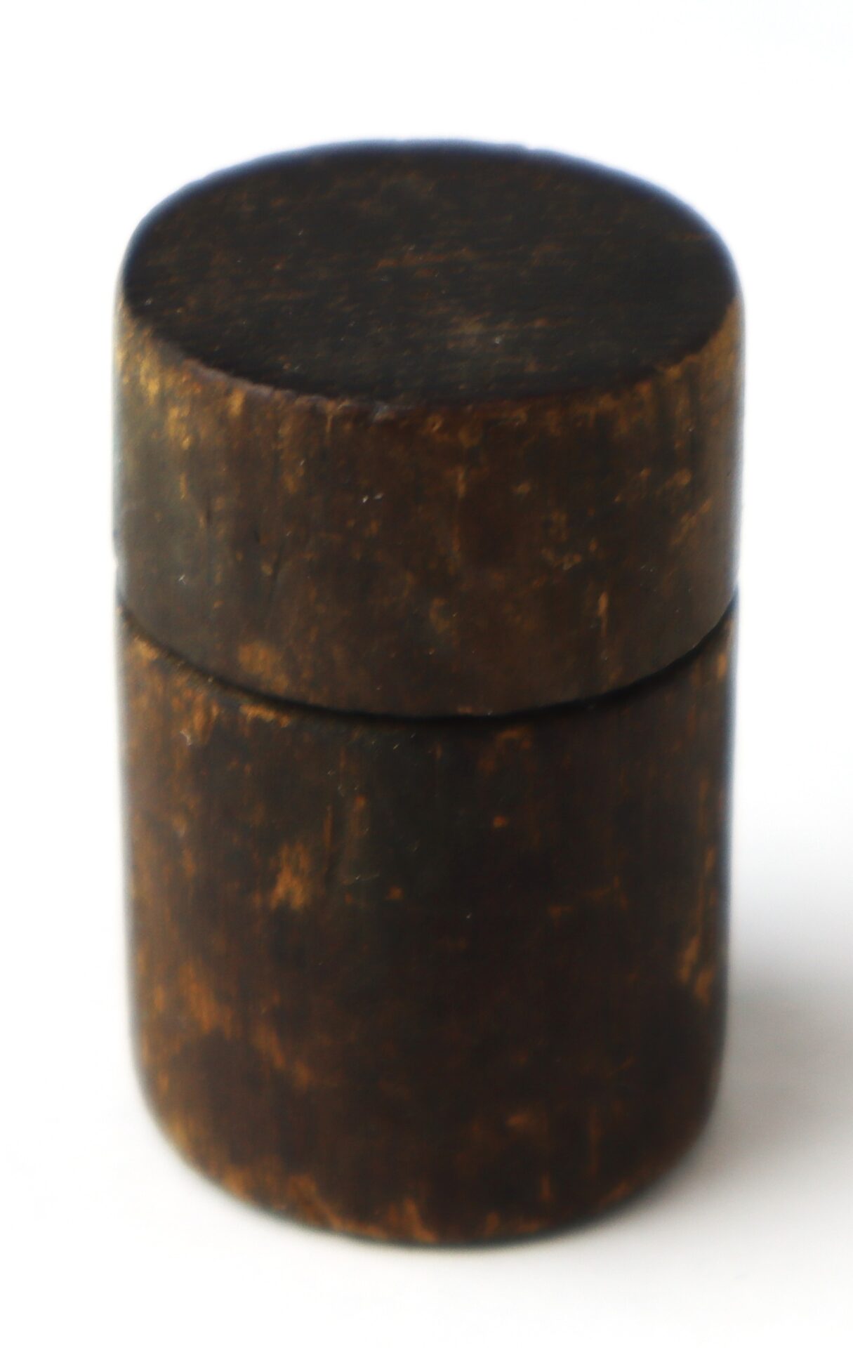 Lathe-turned wooden container believed to have been used for storing percussion pistol caps. The cylindrical body, fitted with a snug, removable lid, is closely comparable in form and construction to known wooden match safes recovered from the Arabia shipwreck.