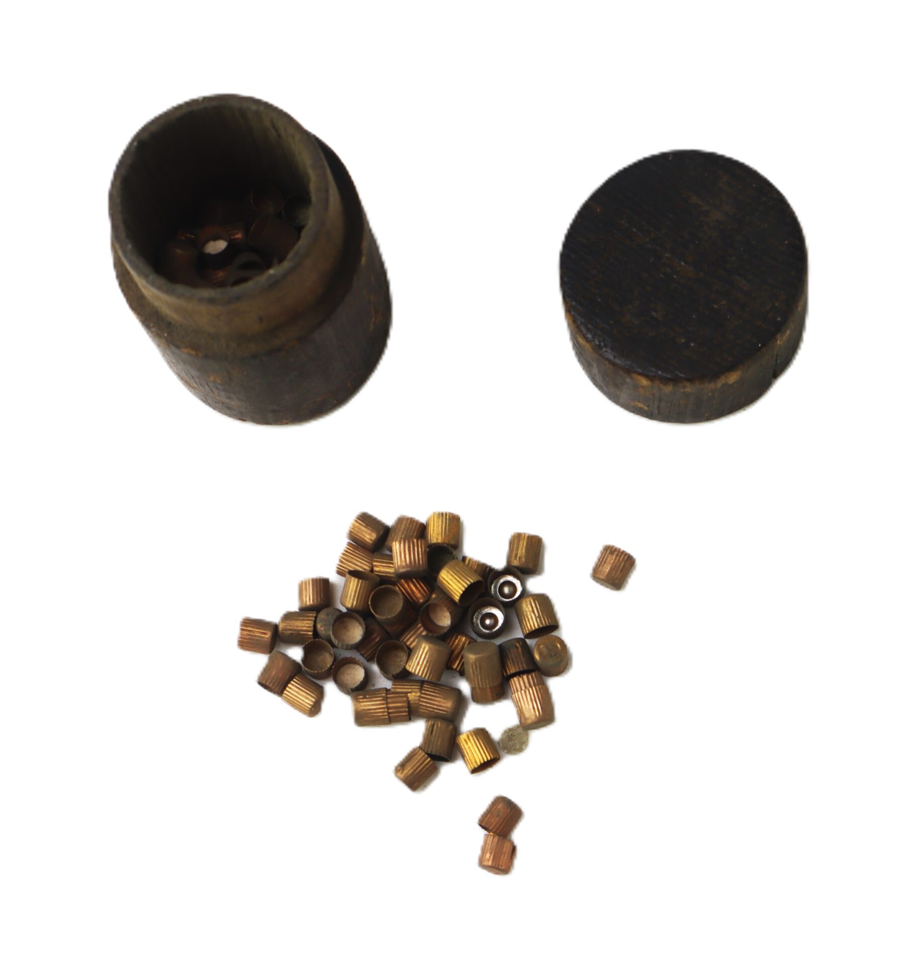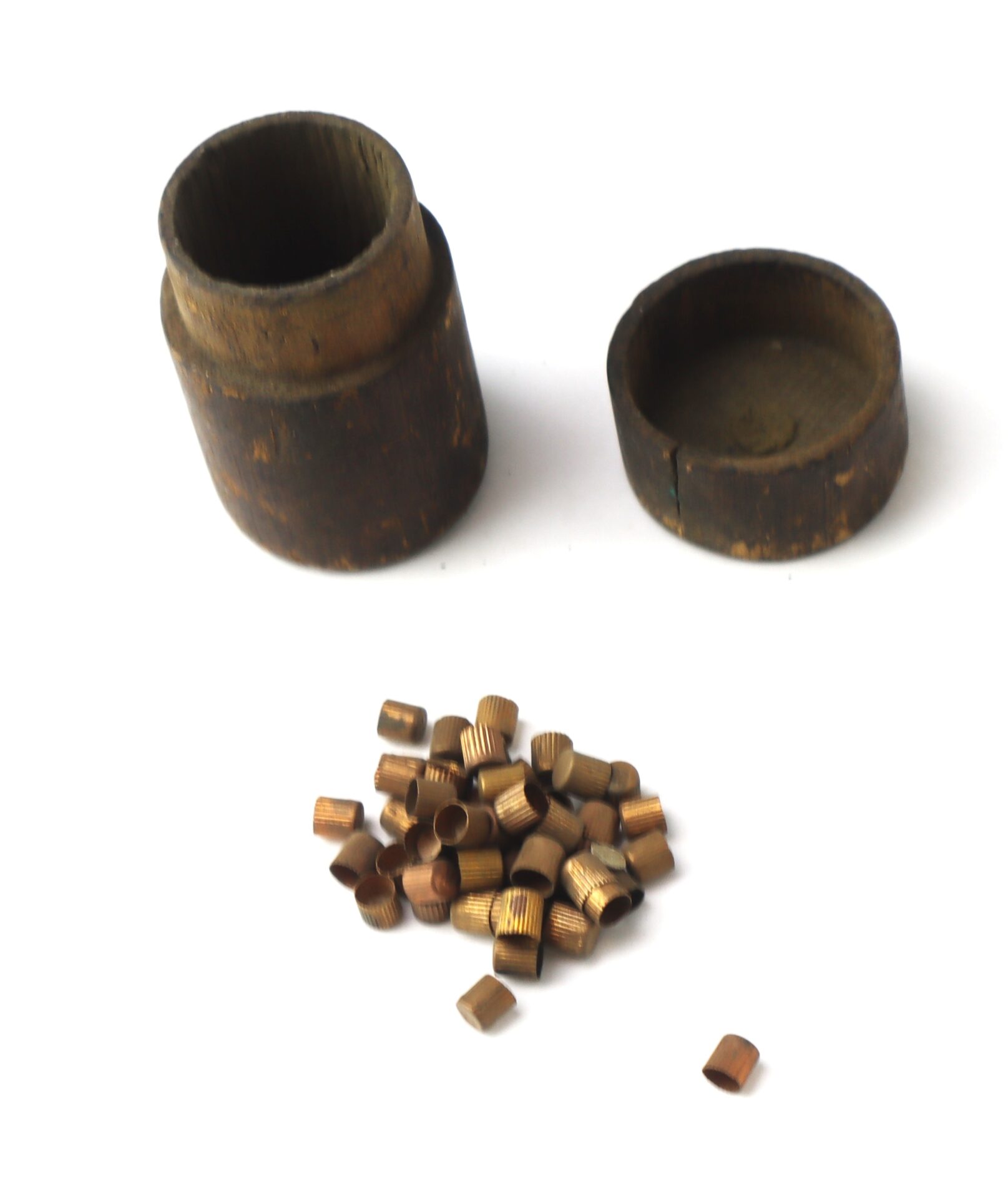 This example retains an impressive quantity of approximately 100 original percussion caps, further reinforcing its intended function and period use. The simple yet practical design reflects mid-19th-century craftsmanship, offering both protection from moisture and ease of access in the field.