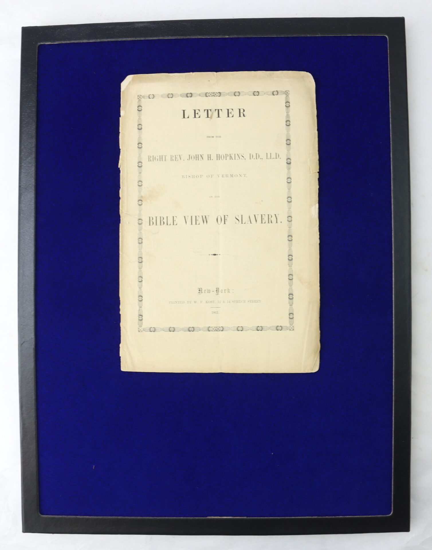 Printed in New York in 1861 by W.F. Kost, this original Civil War–era pamphlet presents one of the most controversial religious defenses of slavery issued on the eve of the conflict. Written by Bishop John Henry Hopkins, Episcopal Bishop of Vermont, the publication argues that slavery was biblically sanctioned—an assertion that drew sharp rebuttals from Northern clergy and ignited theological debate within the Episcopal Church and beyond.